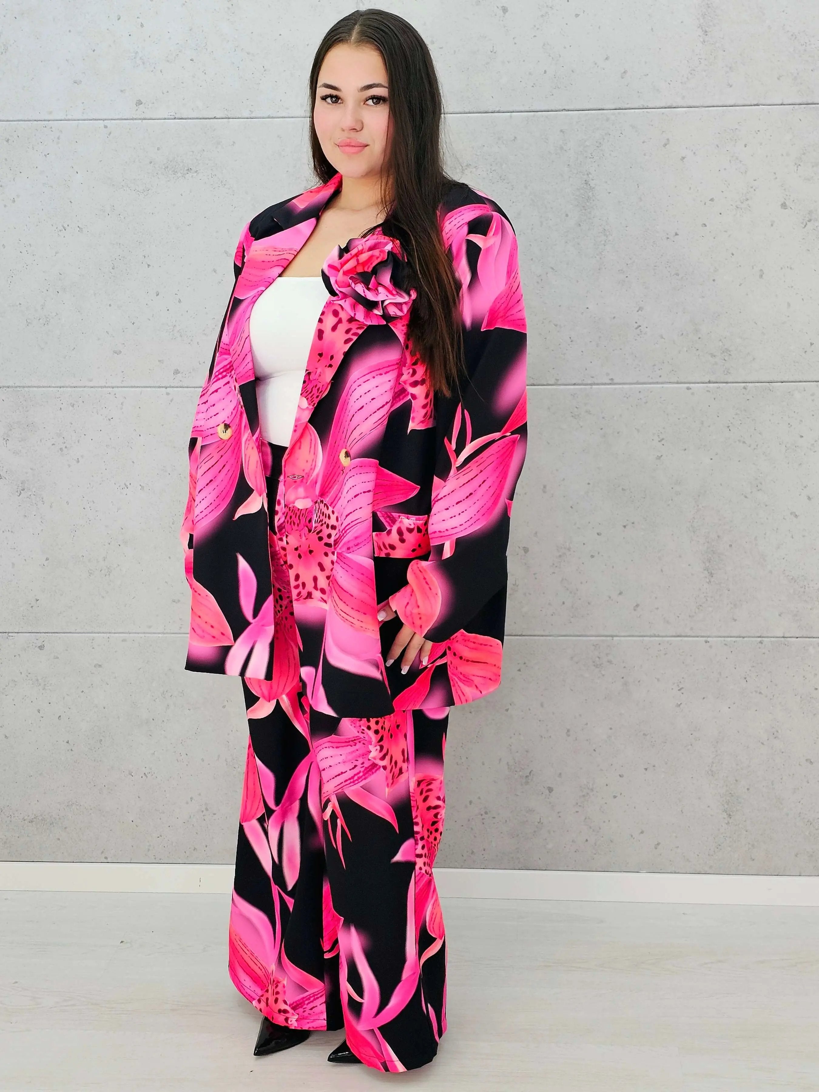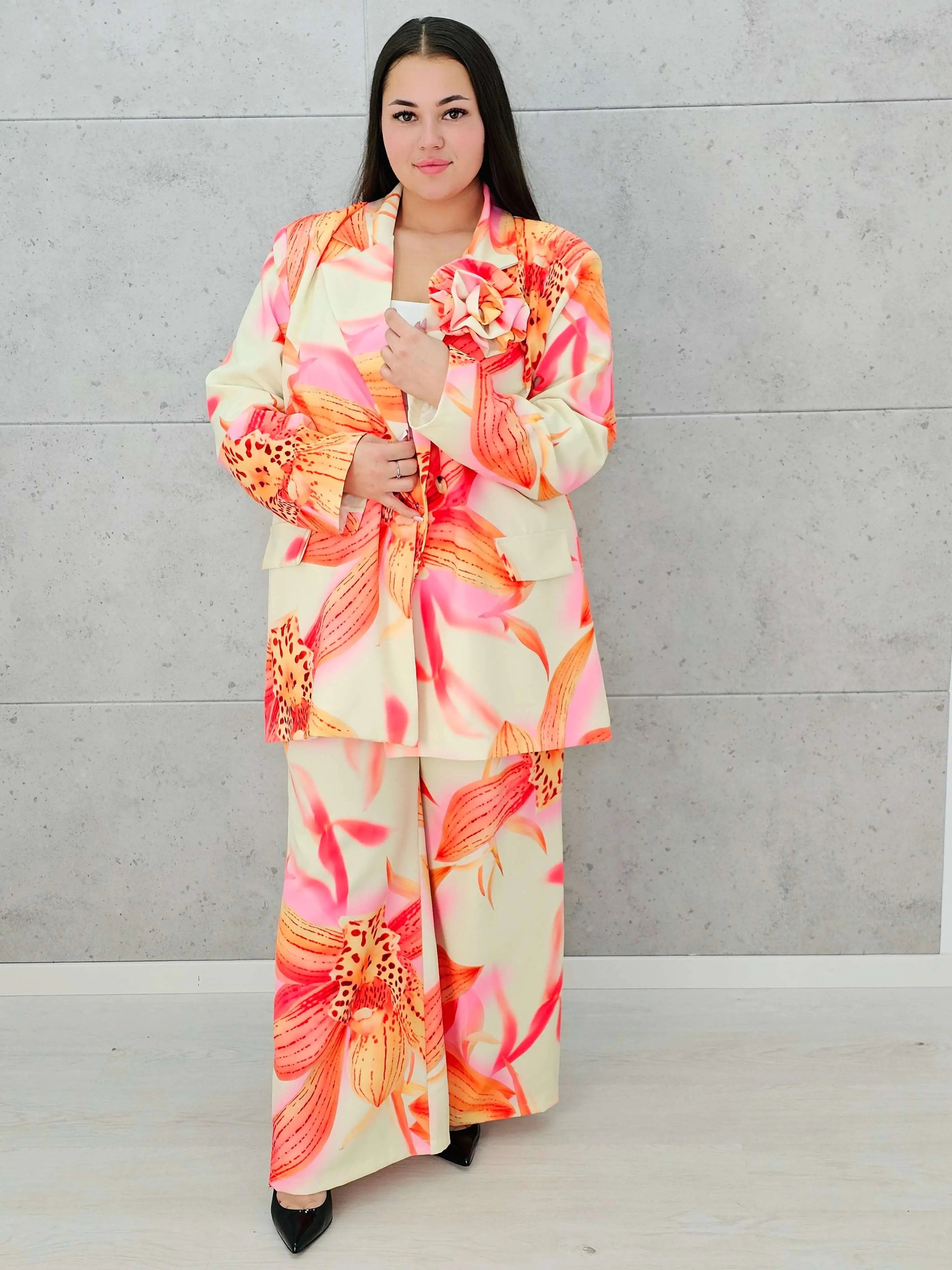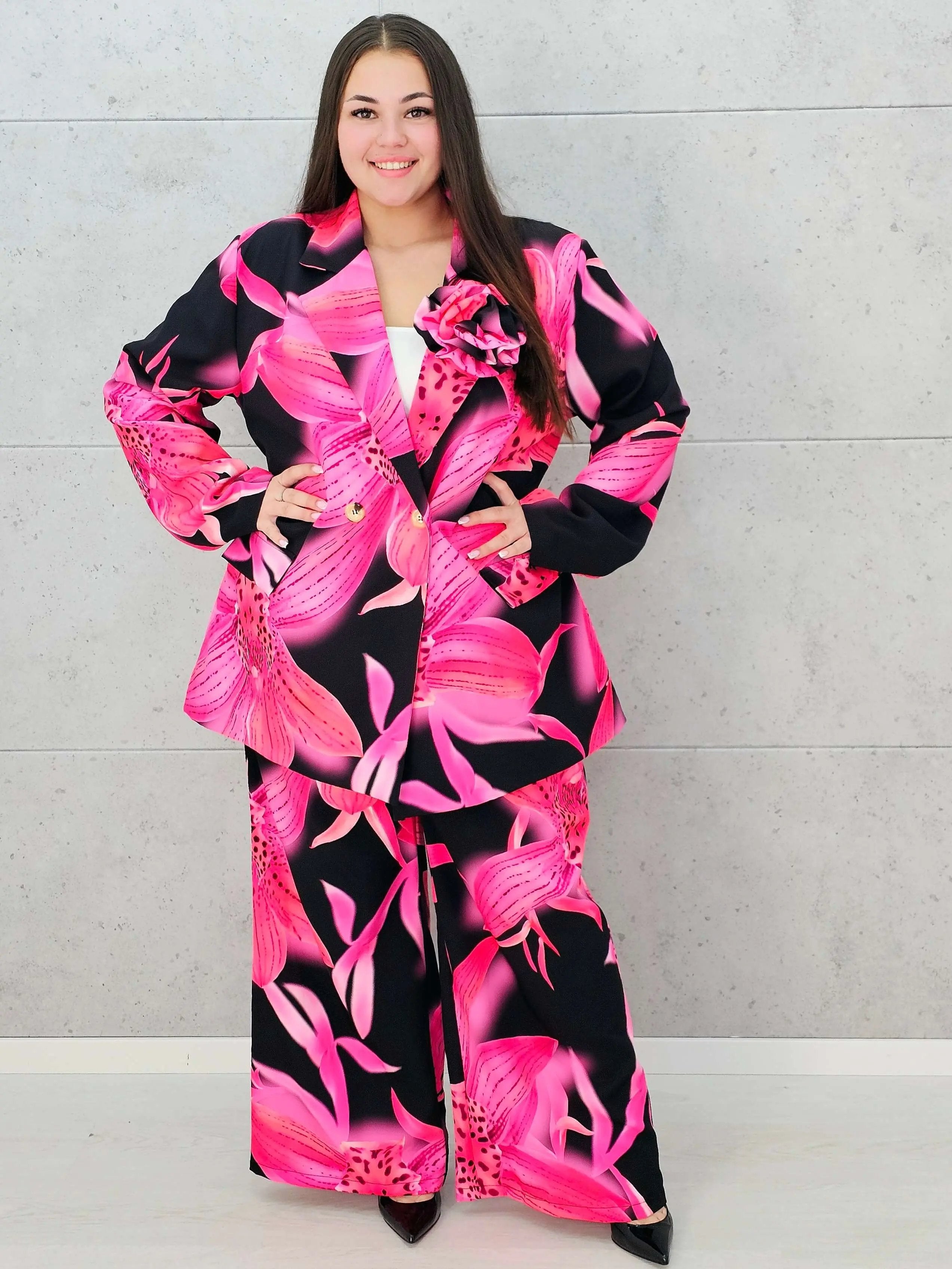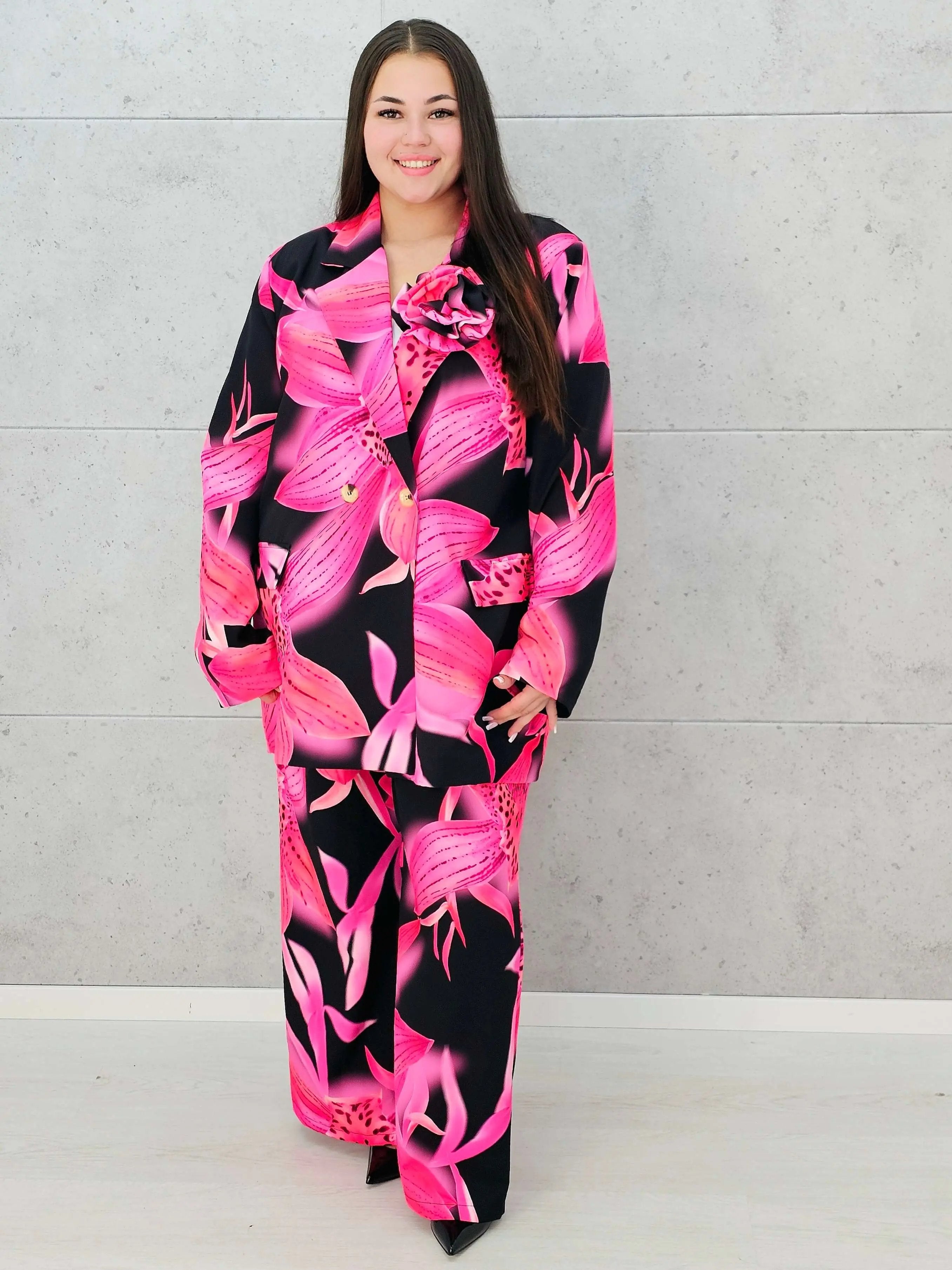 Ten wyjątkowy komplet został zaprojektowany z myślą o kobietach, które kochają modę i chcą czuć się wyjątkowo niezależnie od rozmiaru. Intensywny wzór w duże kwiaty przyciąga wzrok, dodając energii i pewności siebie – idealnie wpisuje się w letnie, słoneczne dni.