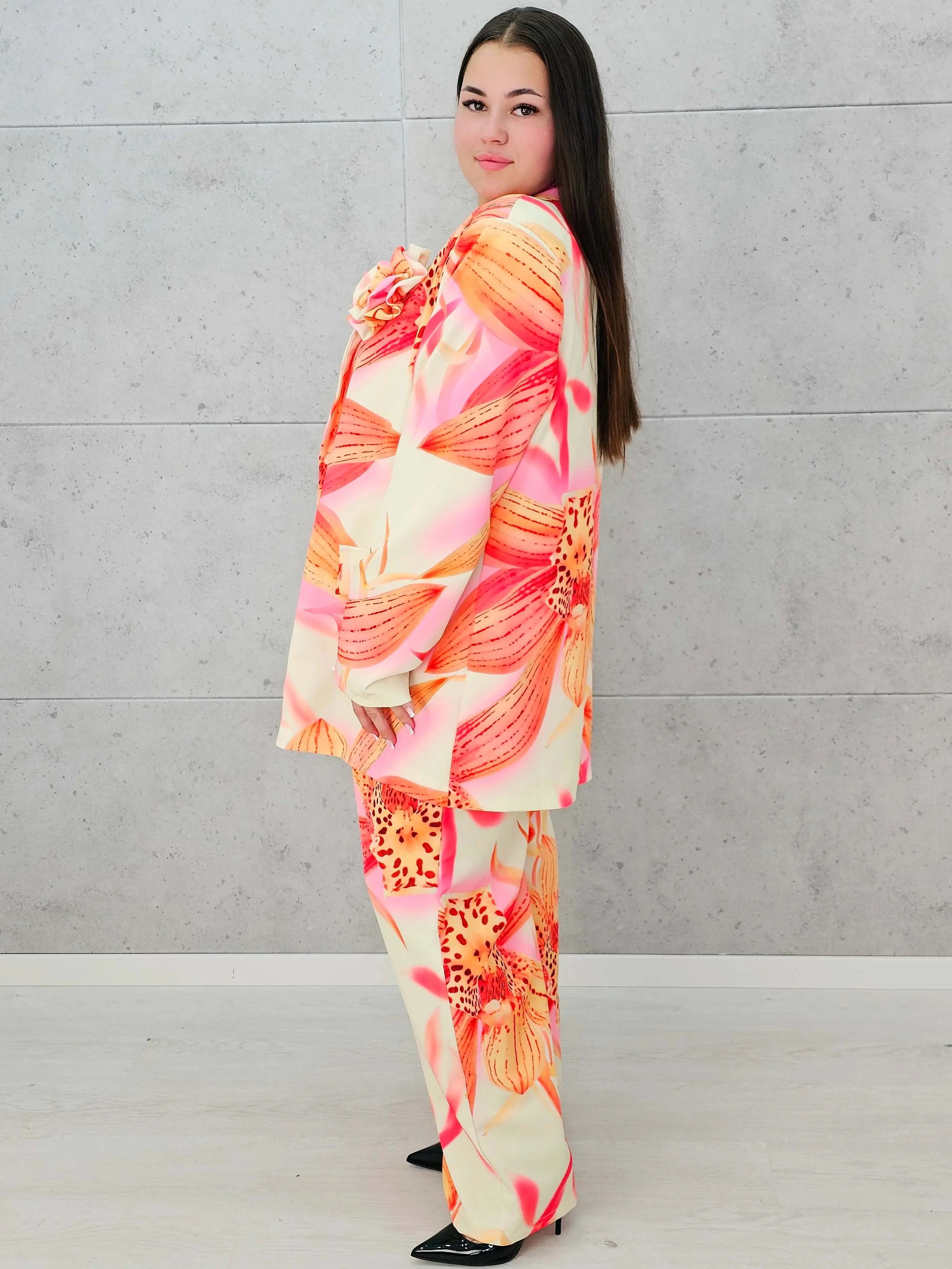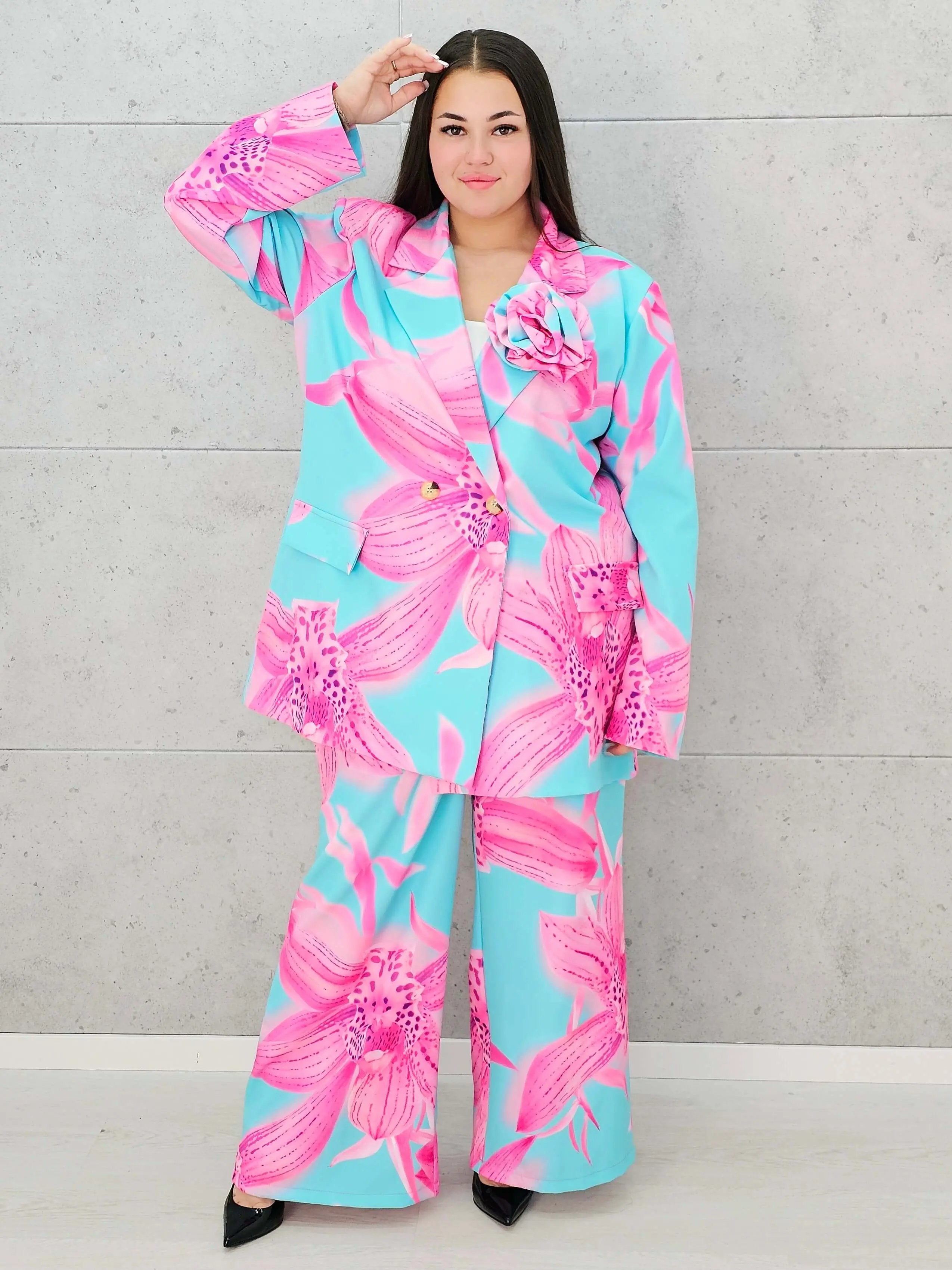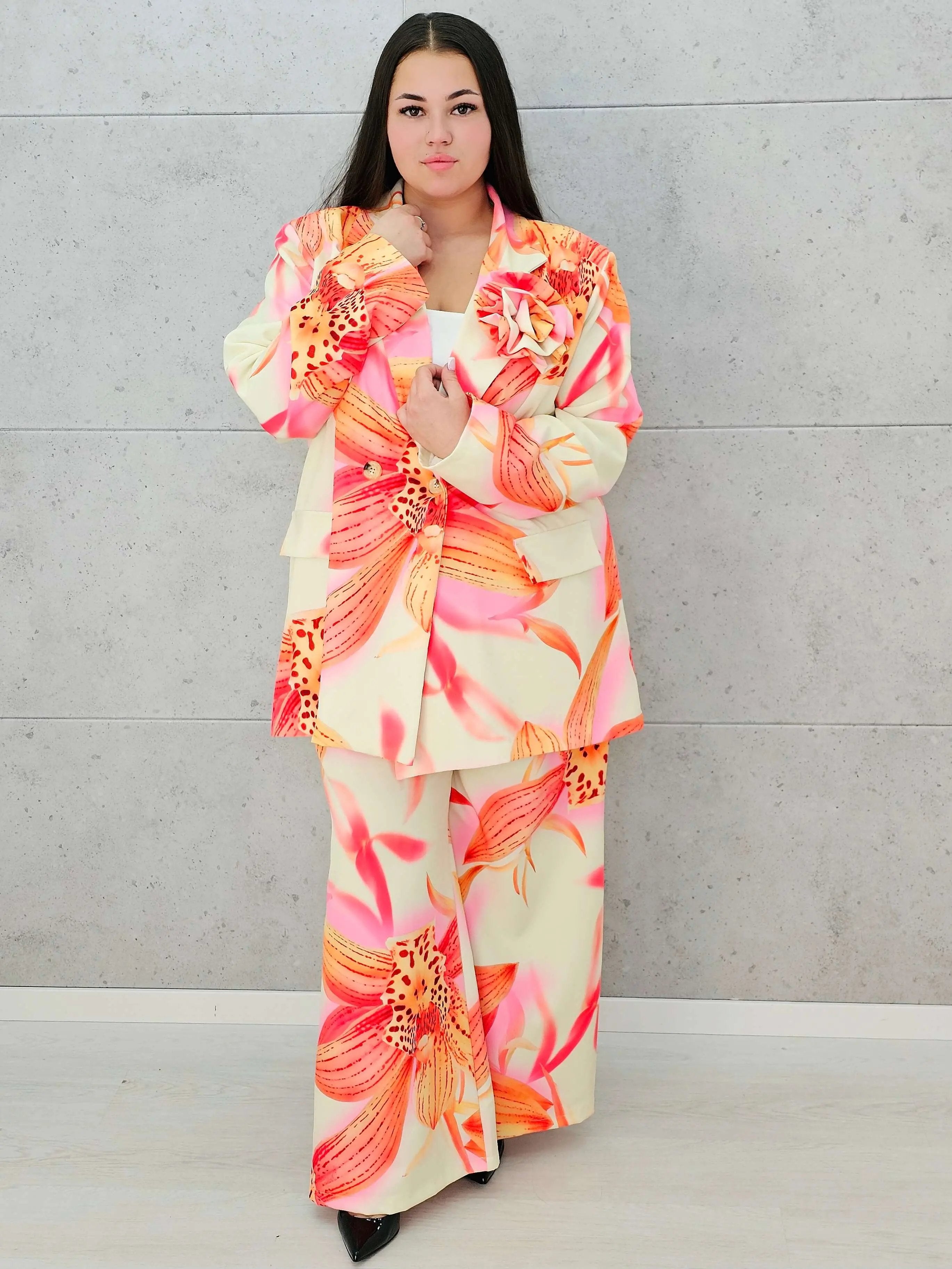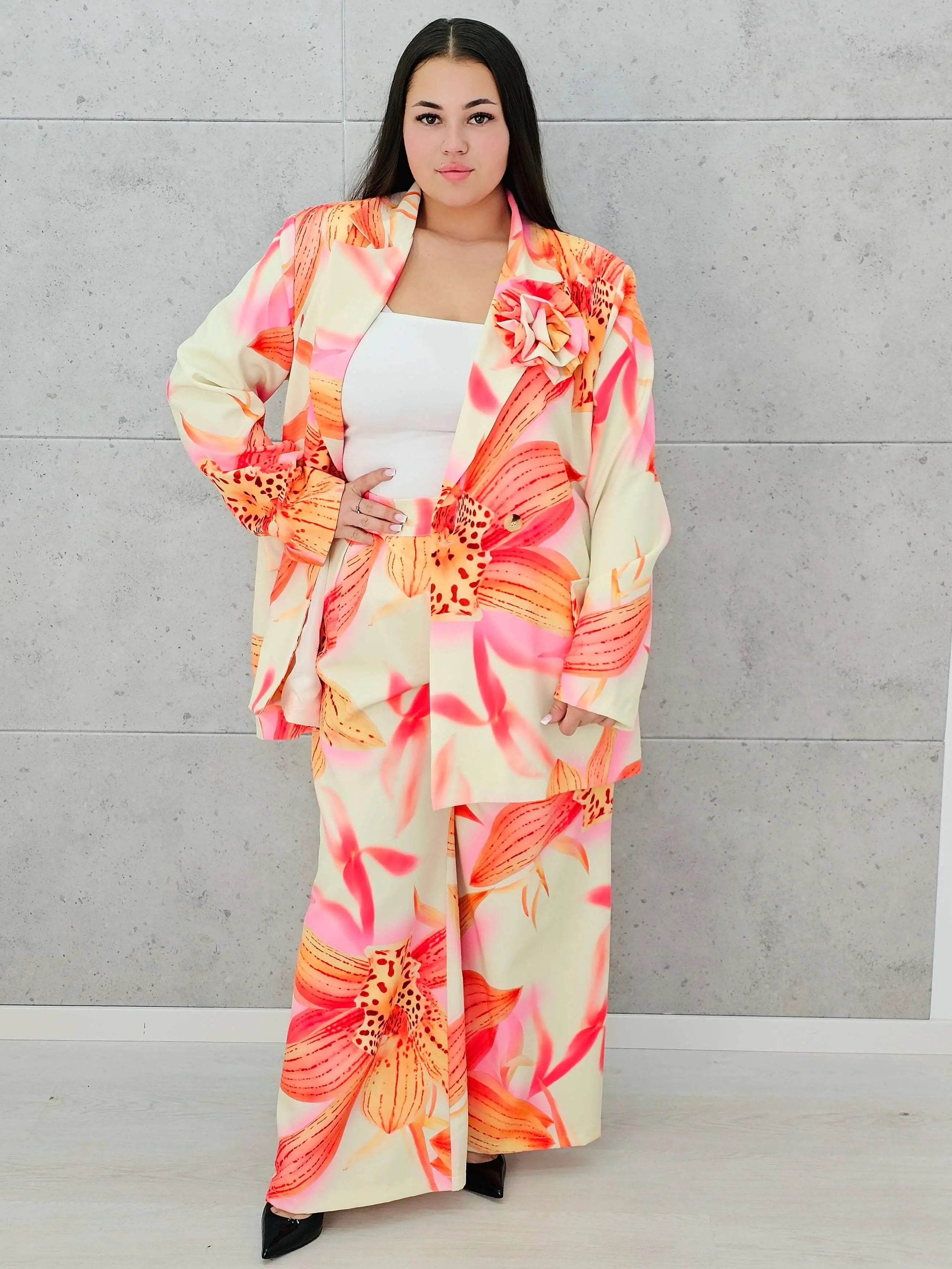 Ten wyjątkowy komplet został zaprojektowany z myślą o kobietach, które kochają modę i chcą czuć się wyjątkowo niezależnie od rozmiaru. Intensywny wzór w duże kwiaty przyciąga wzrok, dodając energii i pewności siebie – idealnie wpisuje się w letnie, słoneczne dni.