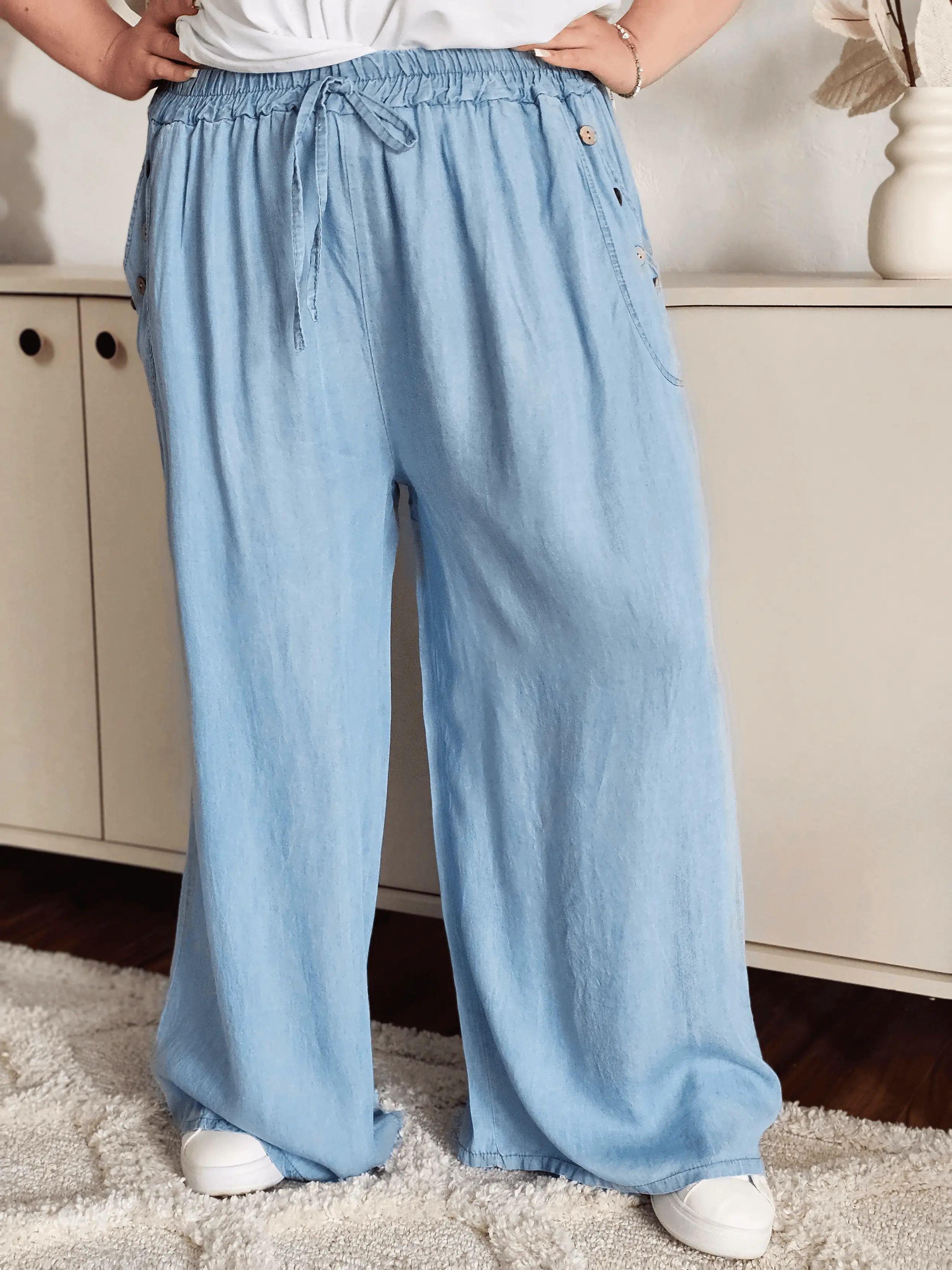 Jeśli szukasz spodni, które zapewnią Ci pełną swobodę ruchów i modny wygląd – ten model jest dla Ciebie. Wykonane z lekkiego, przyjemnego w dotyku materiału, spodnie o luźnym fasonie pięknie układają się na sylwetce plus size. Elastyczny pas z wiązaniem dopasowuje się do talii, a ozdobne guziczki przy kieszeniach dodają całości subtelnego charakteru. Idealne na co dzień – do pracy, na spacer czy wakacyjny wyjazd.