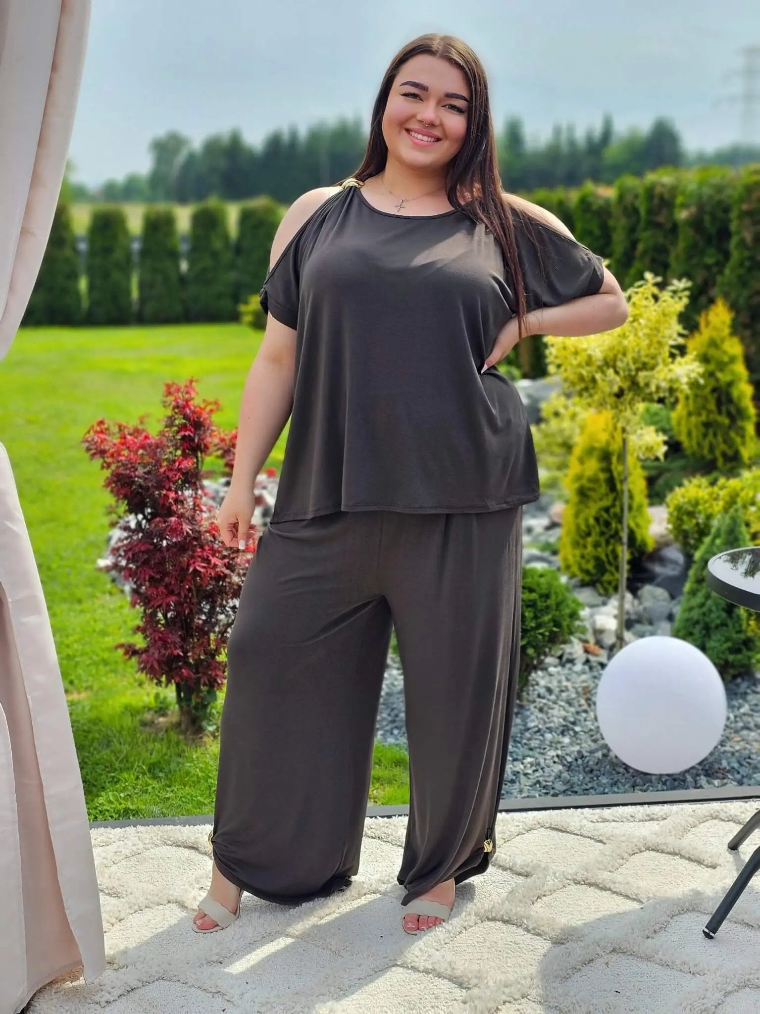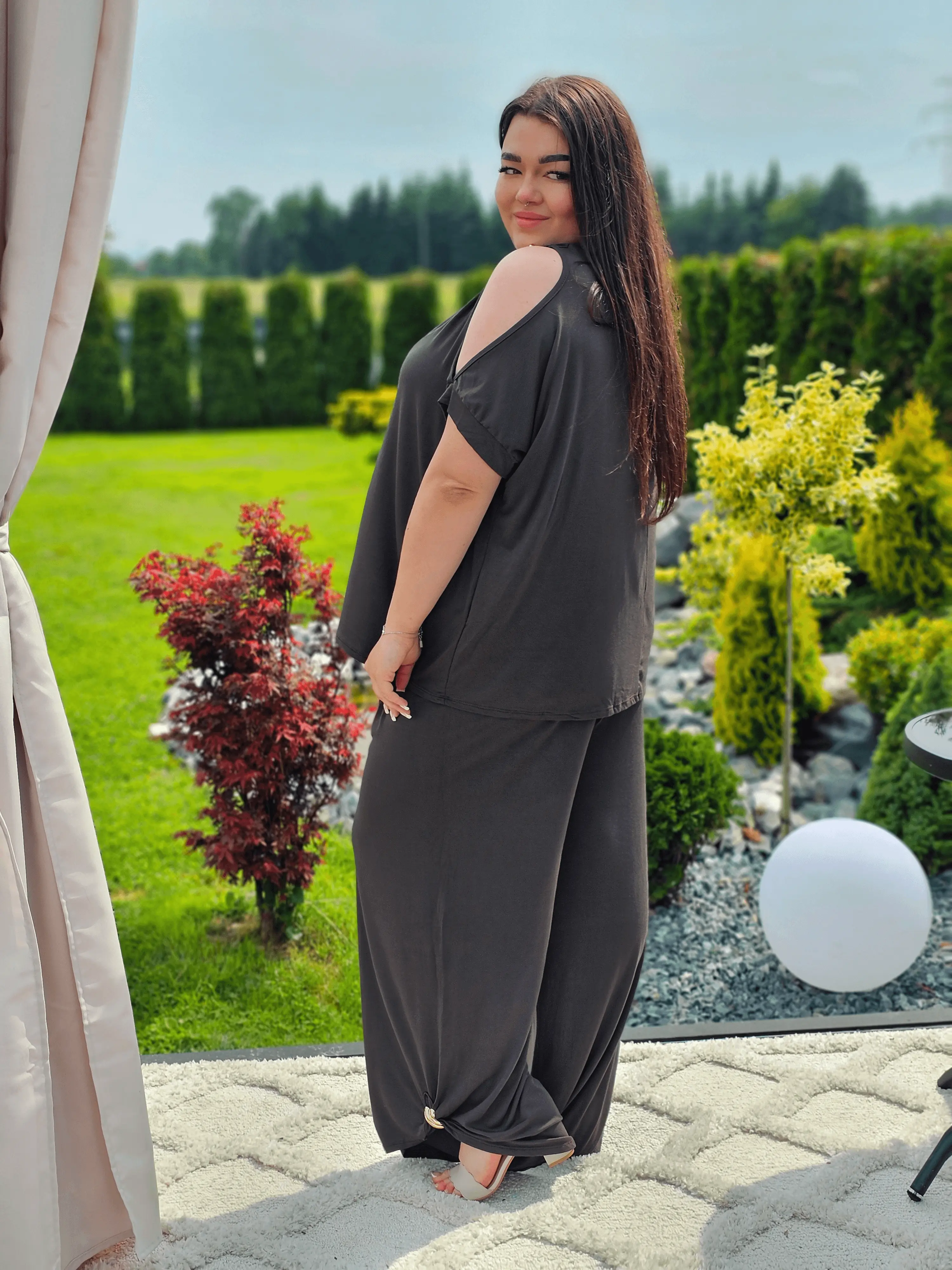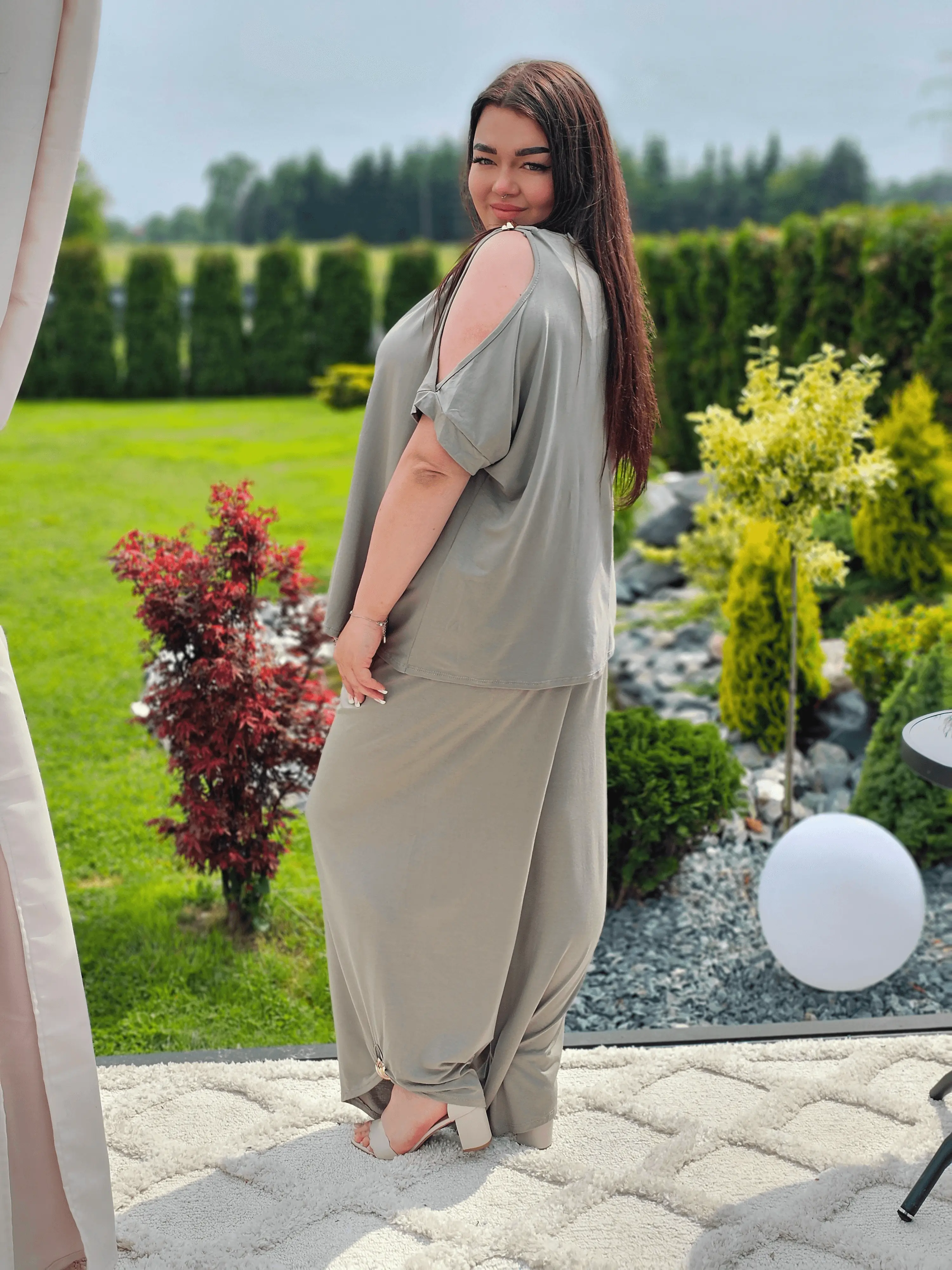 Ten zestaw to idealne połączenie wygody i kobiecego stylu! Odsłonięte ramiona subtelnie podkreślają sylwetkę, a szerokie spodnie z lekkim marszczeniem tworzą piękną linię nóg. Zestaw sprawdzi się na codzienne spacery, wyjazdy czy letnie spotkania. A do tego miękka, elastyczna tkanina zapewni komfort przez cały dzień!