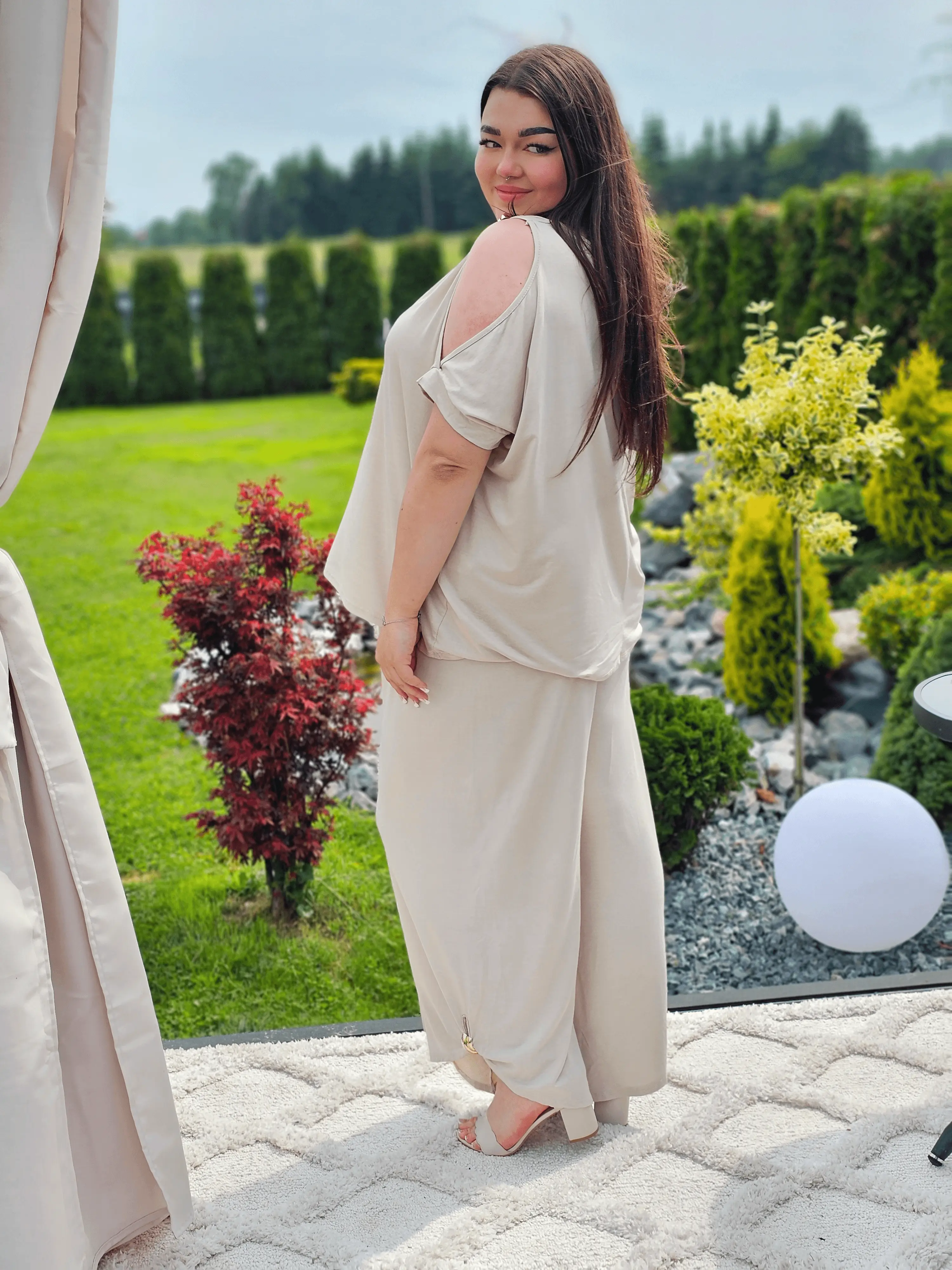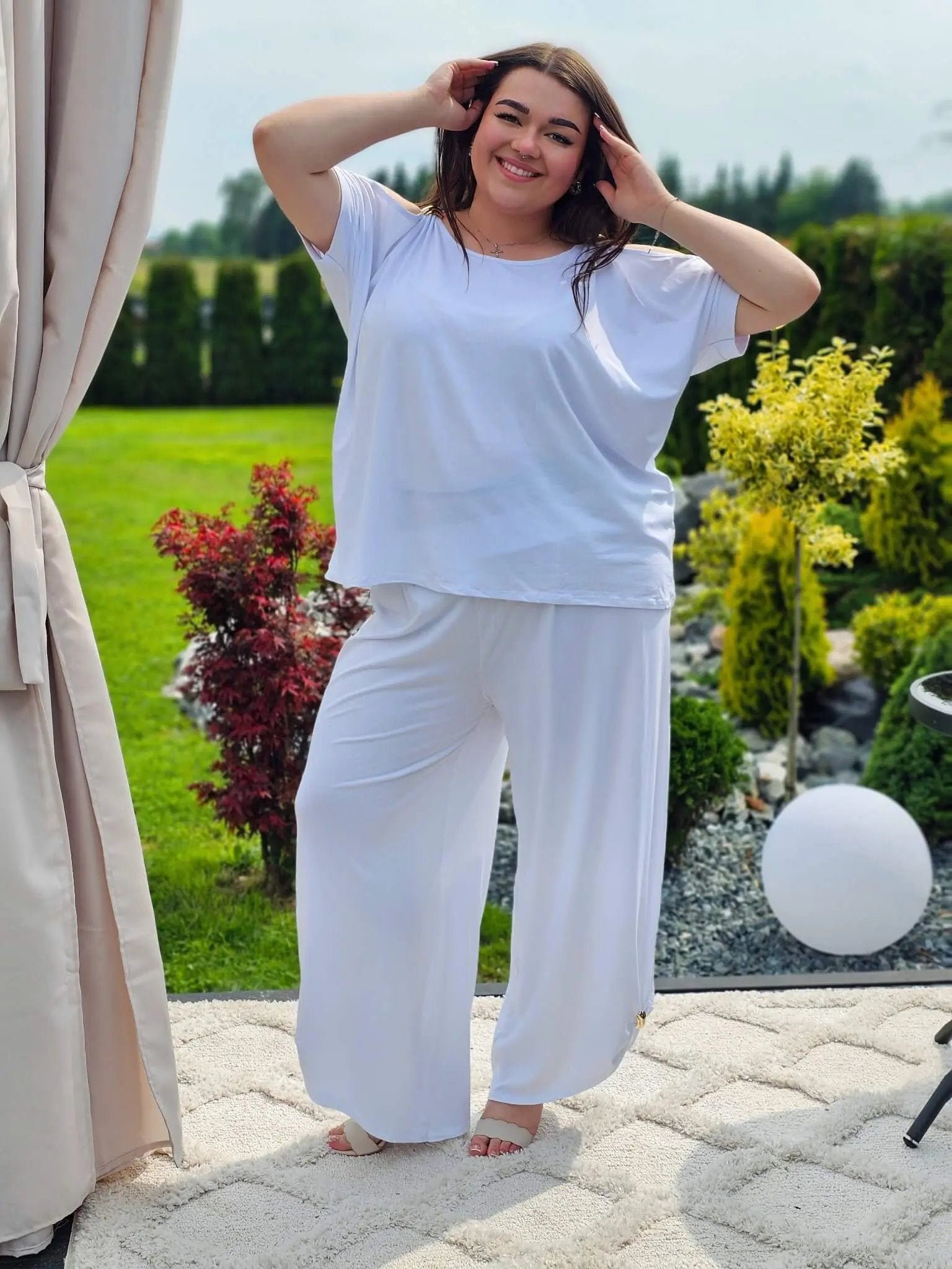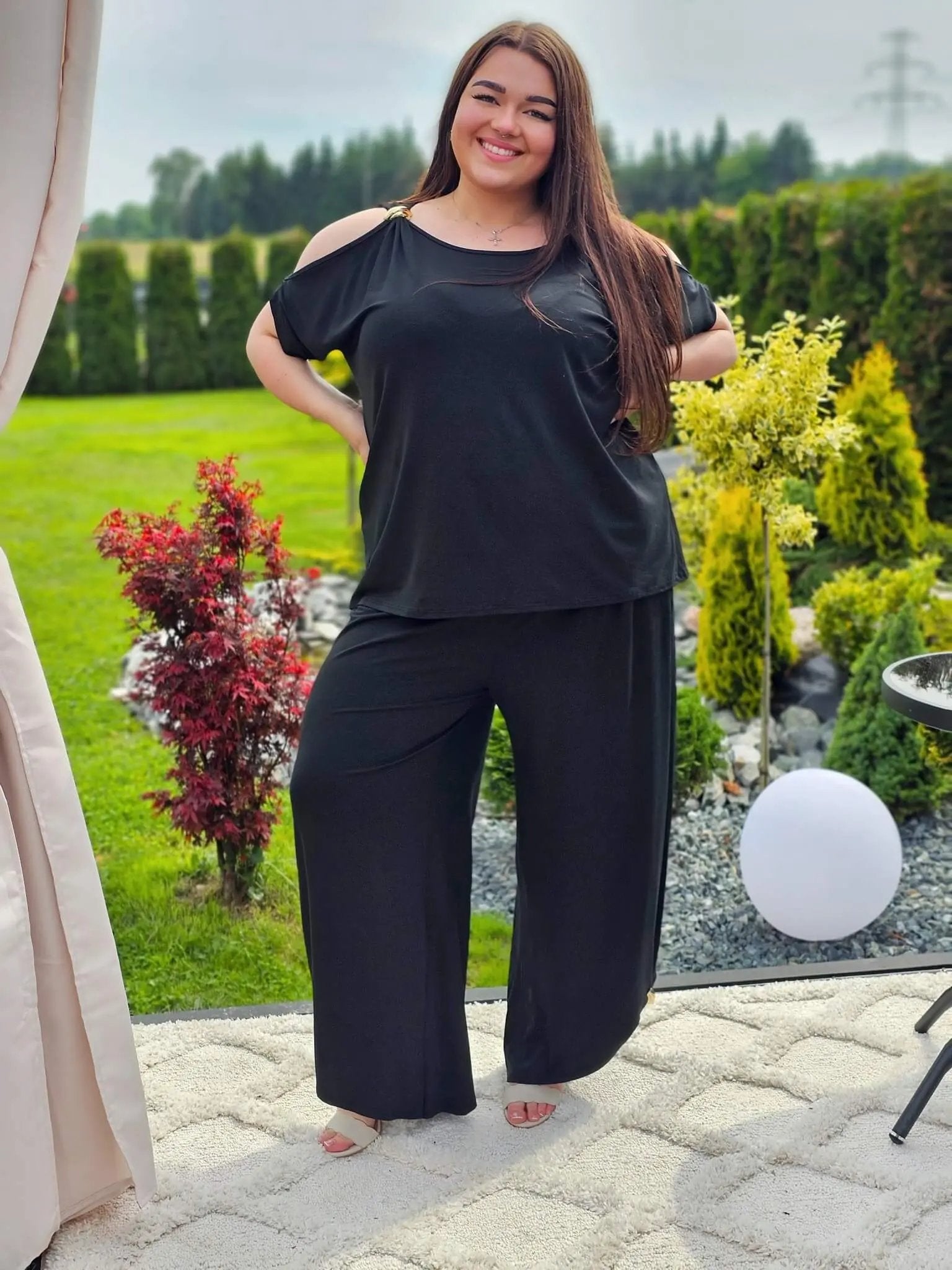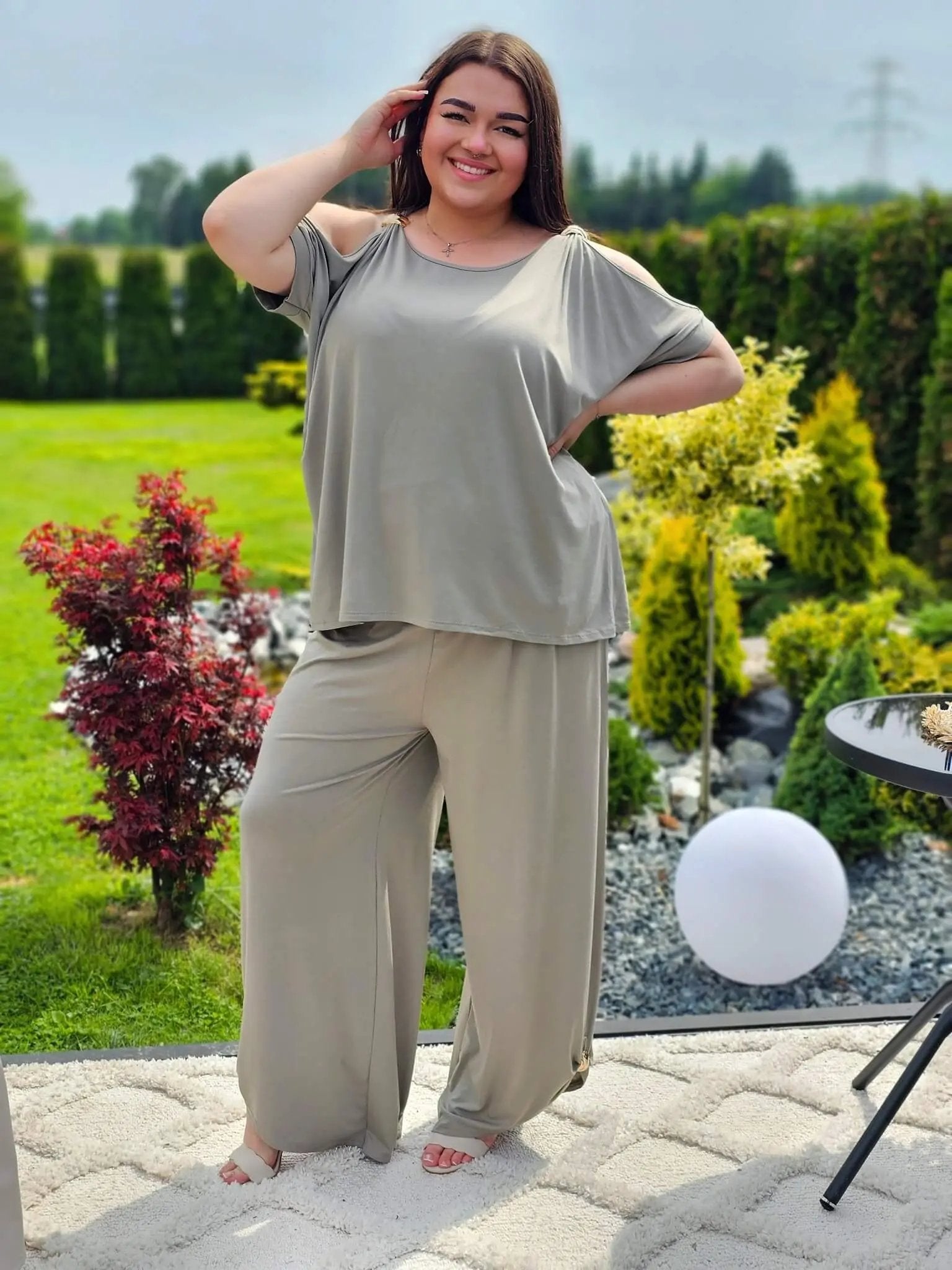 Ten zestaw to idealne połączenie wygody i kobiecego stylu! Odsłonięte ramiona subtelnie podkreślają sylwetkę, a szerokie spodnie z lekkim marszczeniem tworzą piękną linię nóg. Zestaw sprawdzi się na codzienne spacery, wyjazdy czy letnie spotkania. A do tego miękka, elastyczna tkanina zapewni komfort przez cały dzień!