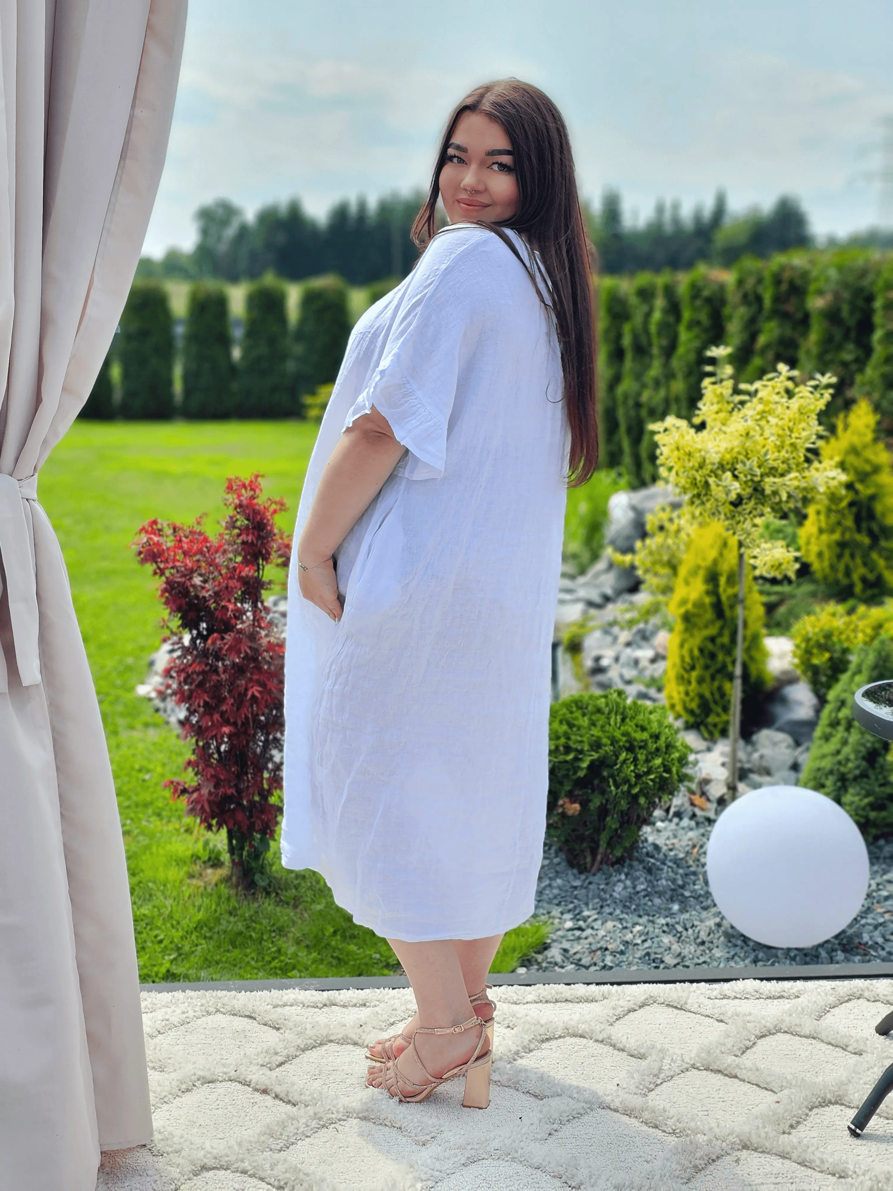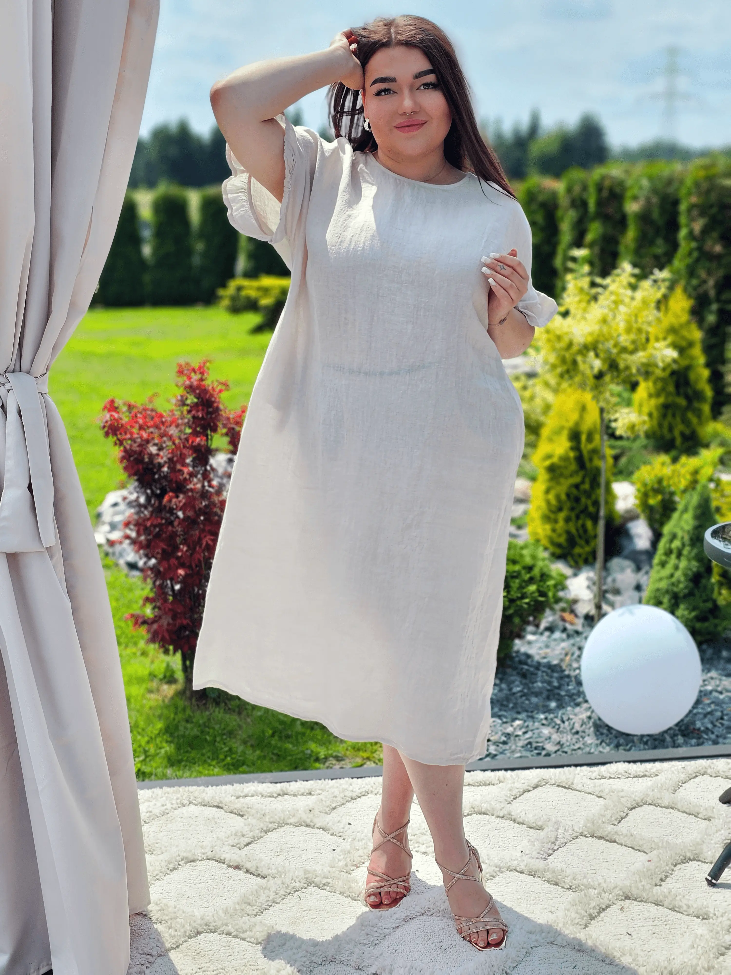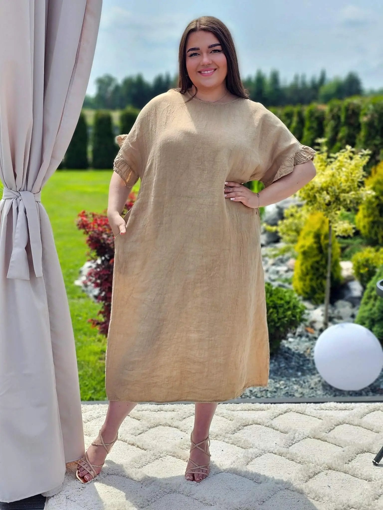 Naturalna tkanina, lekko oversizowy krój i efektowne wiązanie z tyłu – sukienka A52 to propozycja dla kobiet, które cenią wygodę i subtelną elegancję. Idealna na ciepłe dni, spacery, wakacje czy codzienne wyjścia. Rękawy z delikatnym marszczeniem i praktyczne kieszenie dodają jej lekkości i swobody