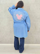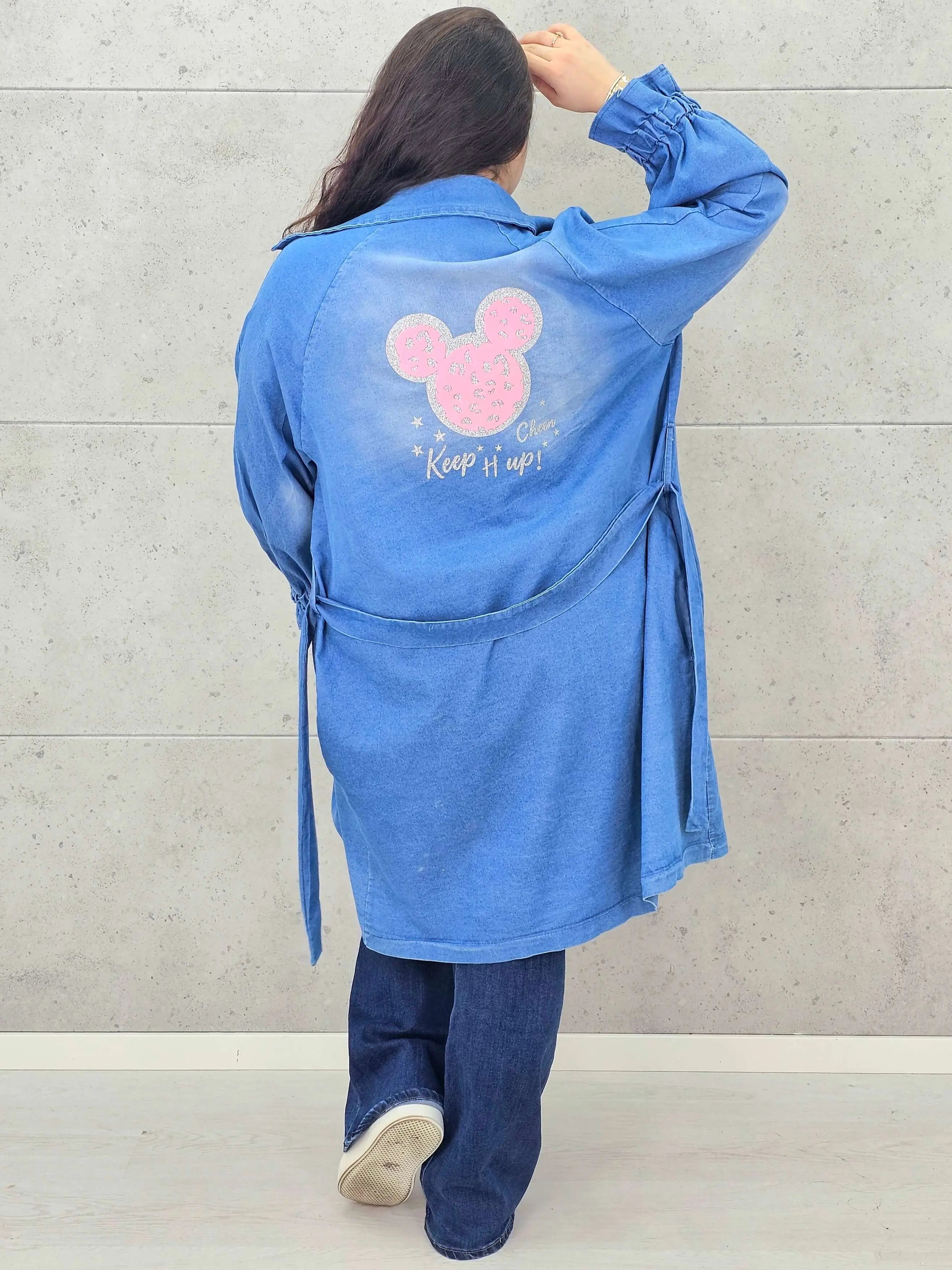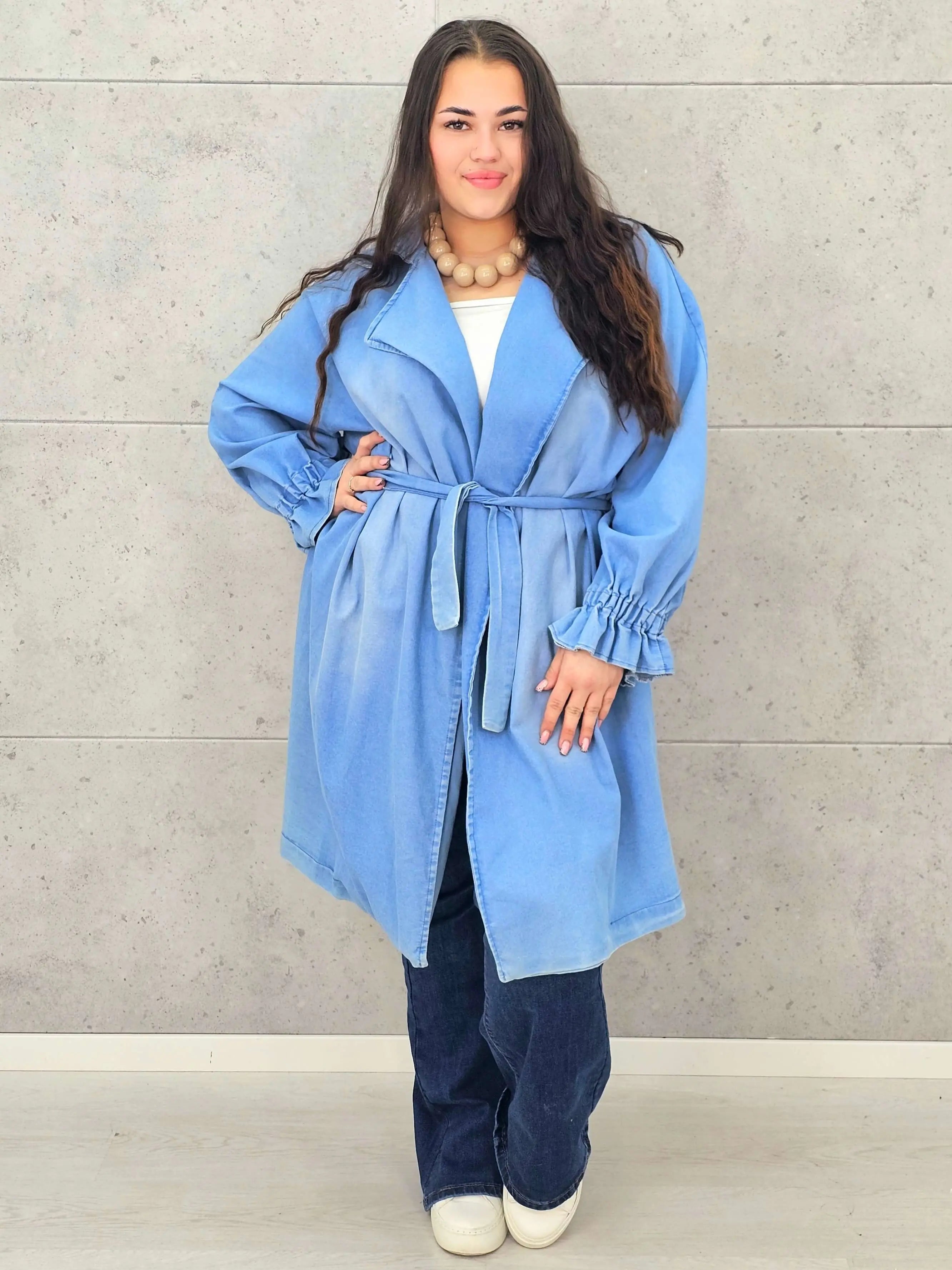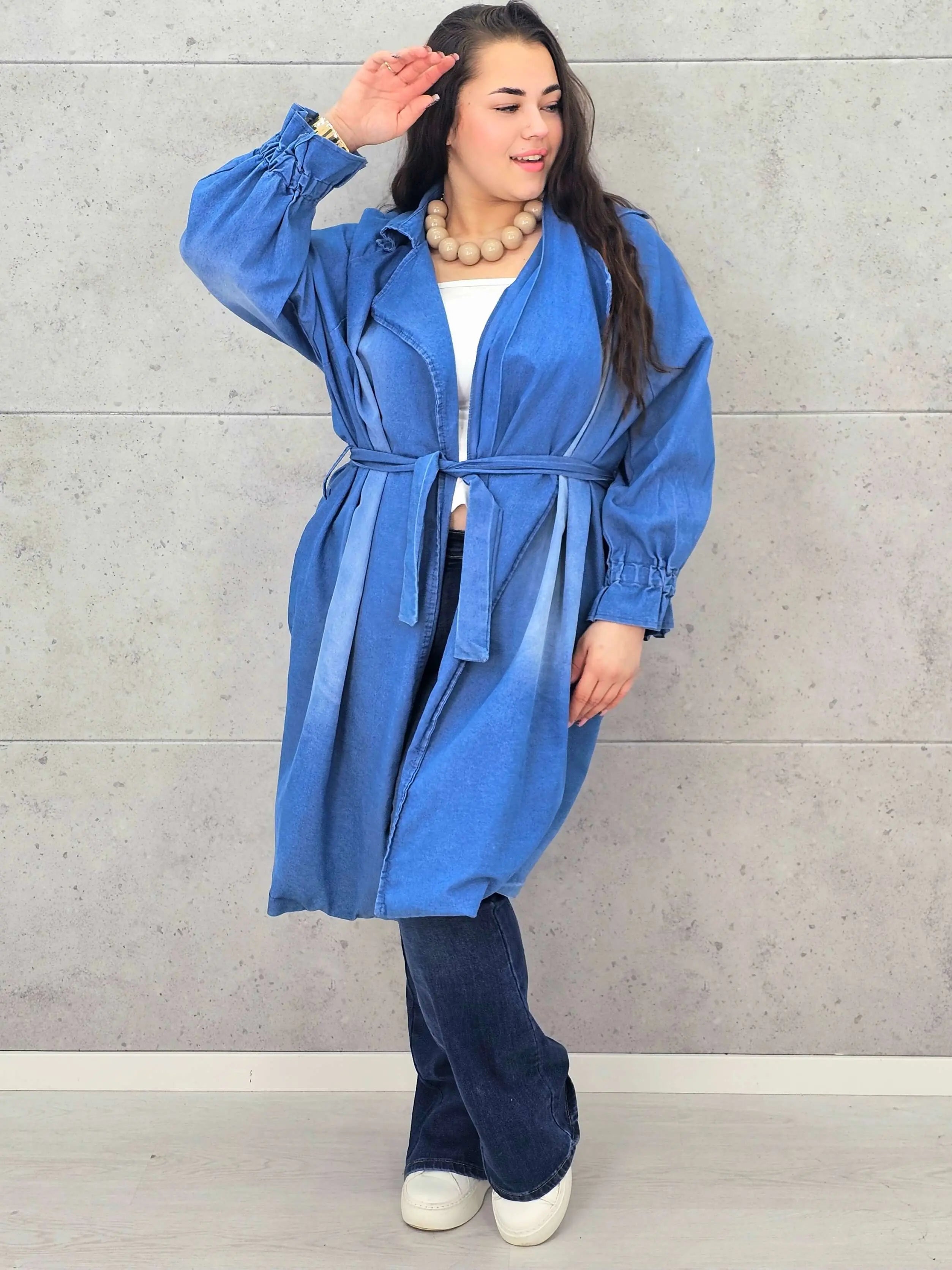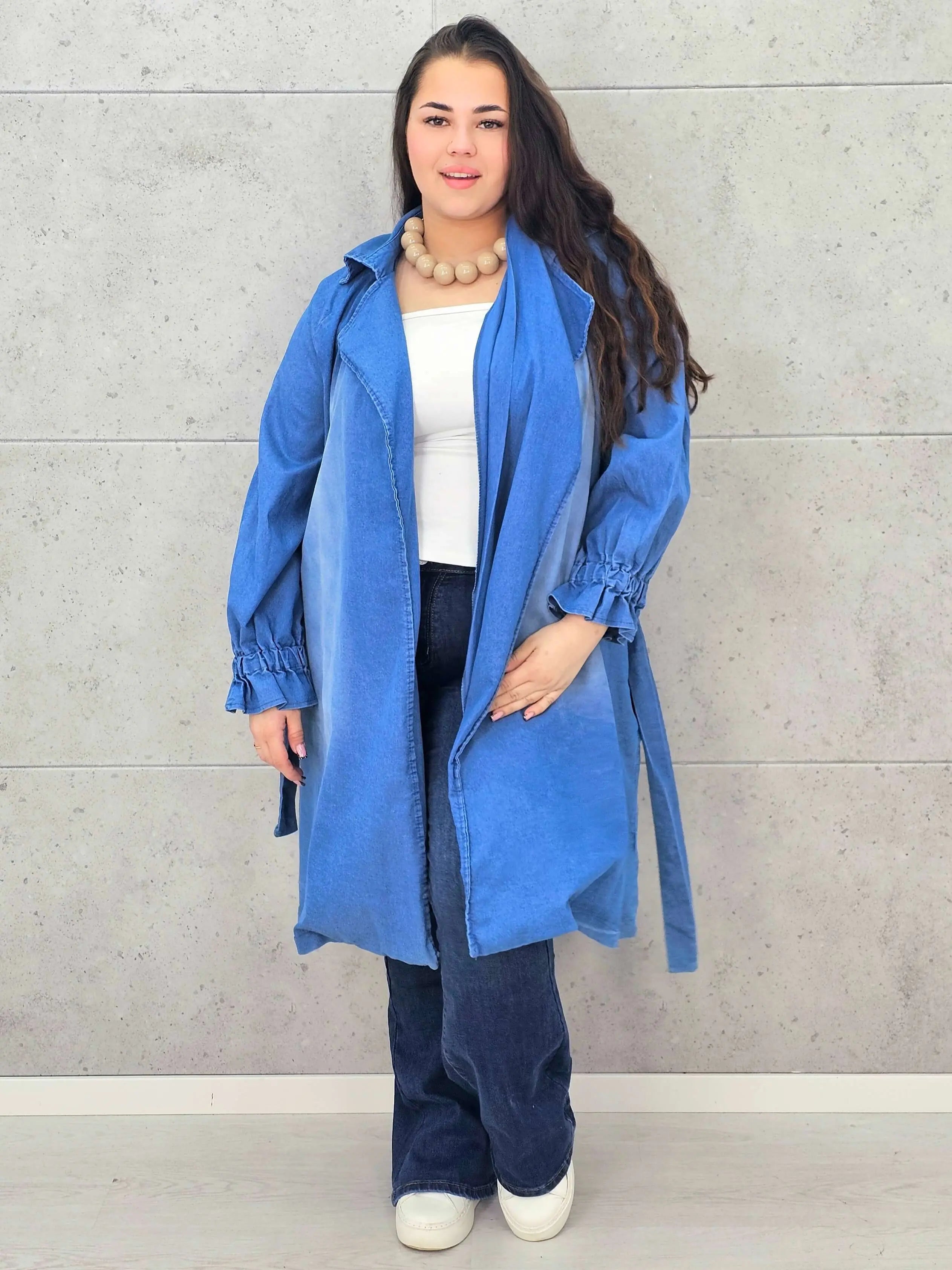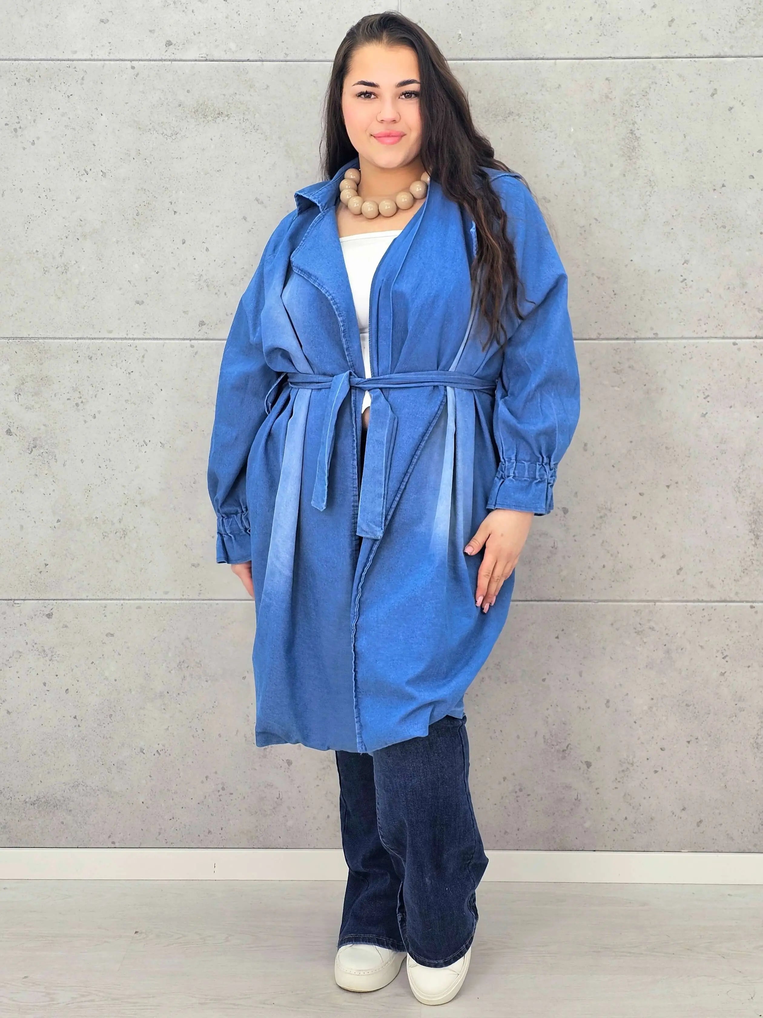 Płaszcz plus size – denimowy płaszcz oversize z paskiem i modną aplikacją