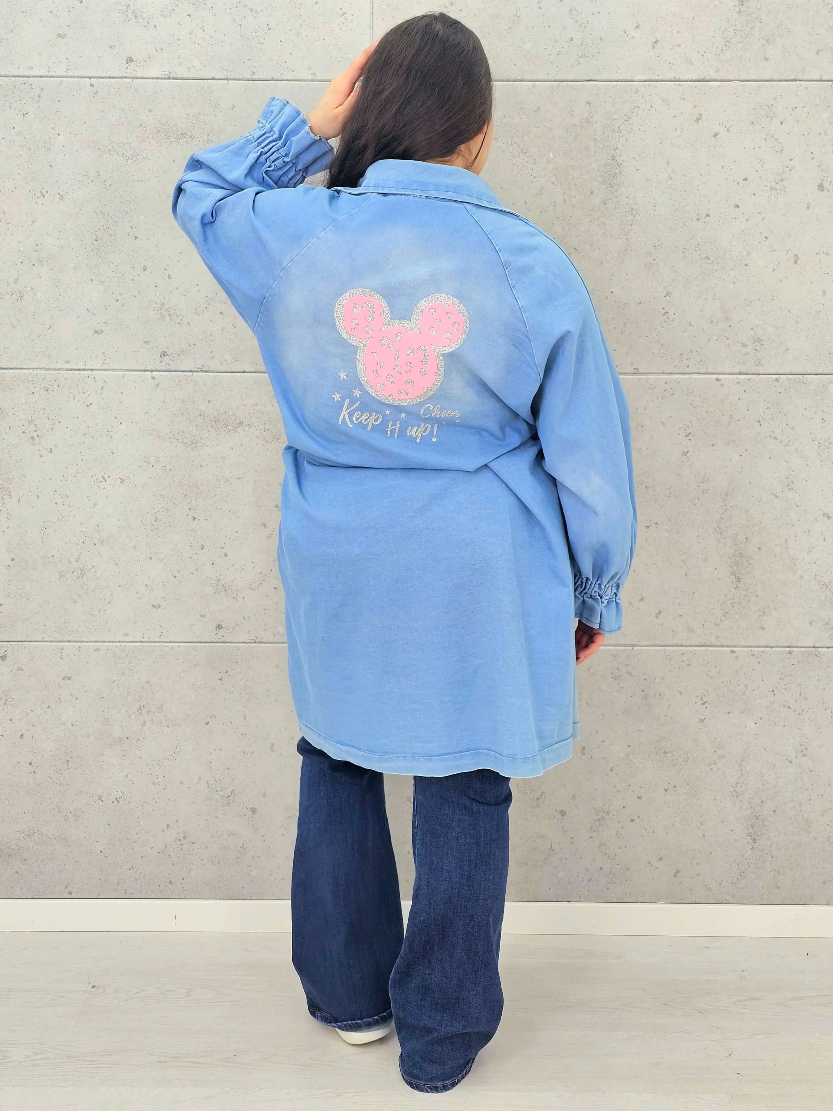 Na plecach znajduje się urocza, pastelowa aplikacja w kształcie misia oraz napis „Keep it up!”, co nadaje płaszczowi modowego, energetycznego akcentu. To idealna propozycja dla kobiet, które chcą wyróżniać się stylem i uwielbiają okrycia wierzchnie w klimacie casual glam.