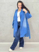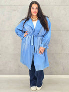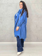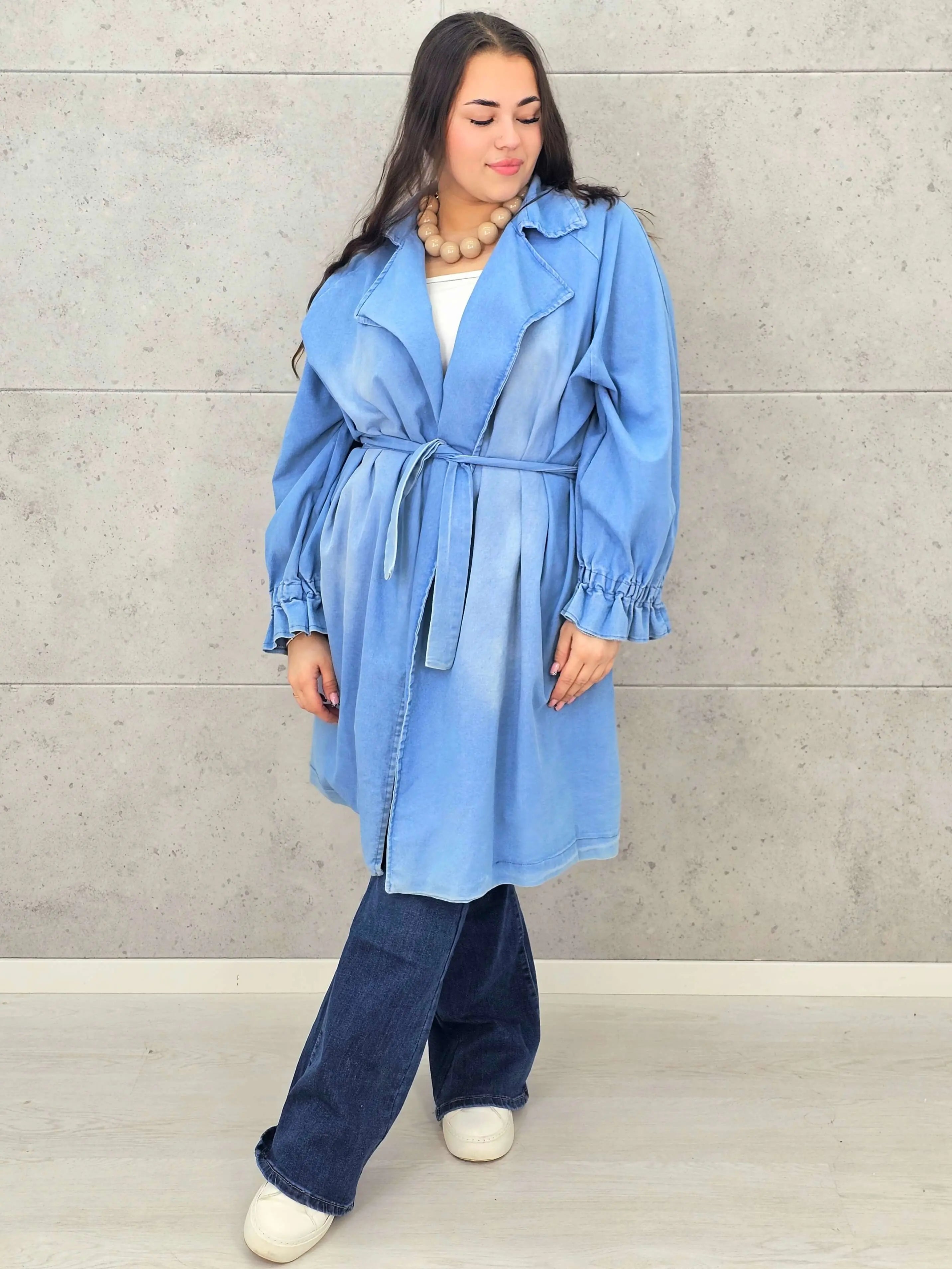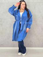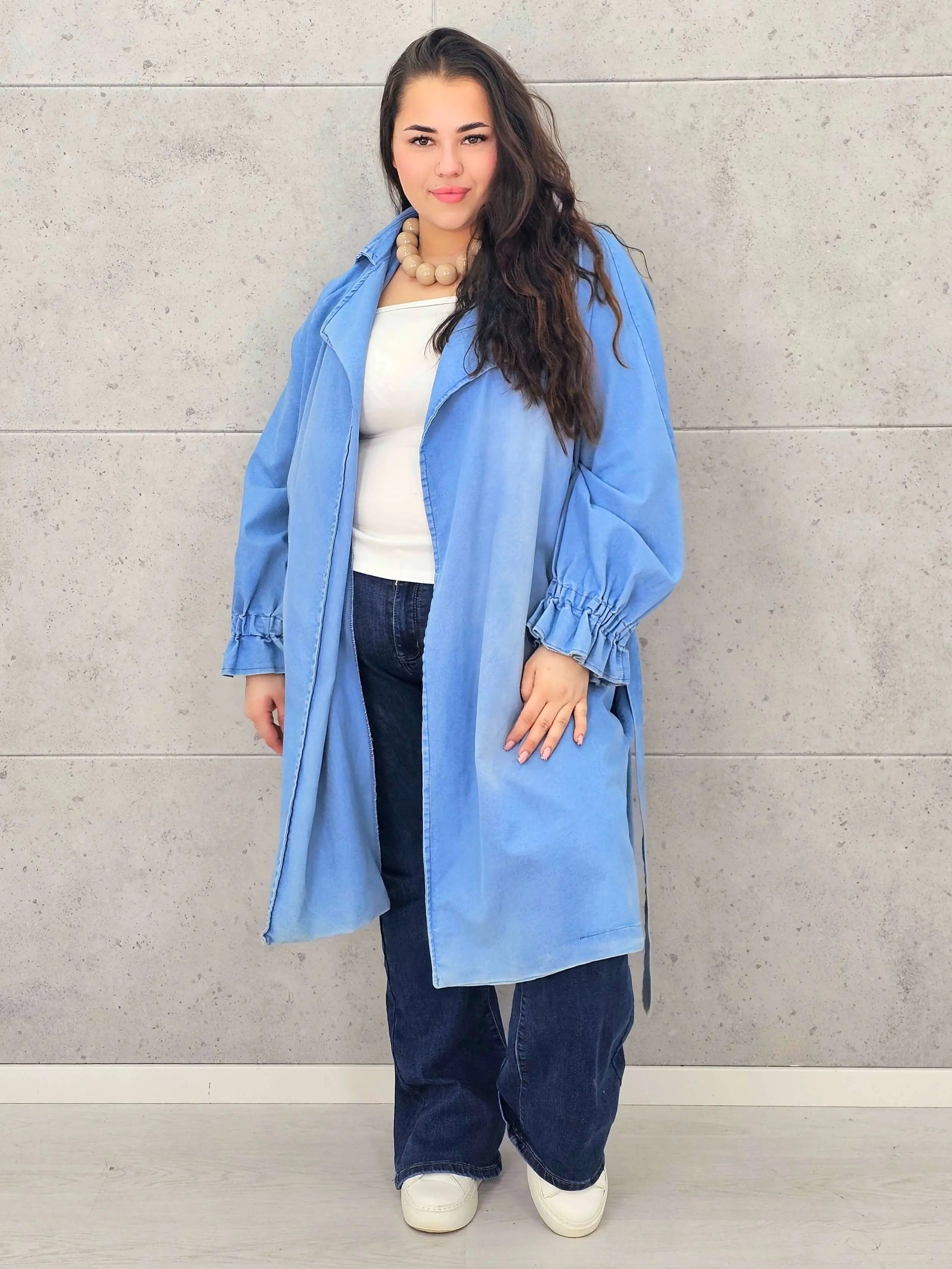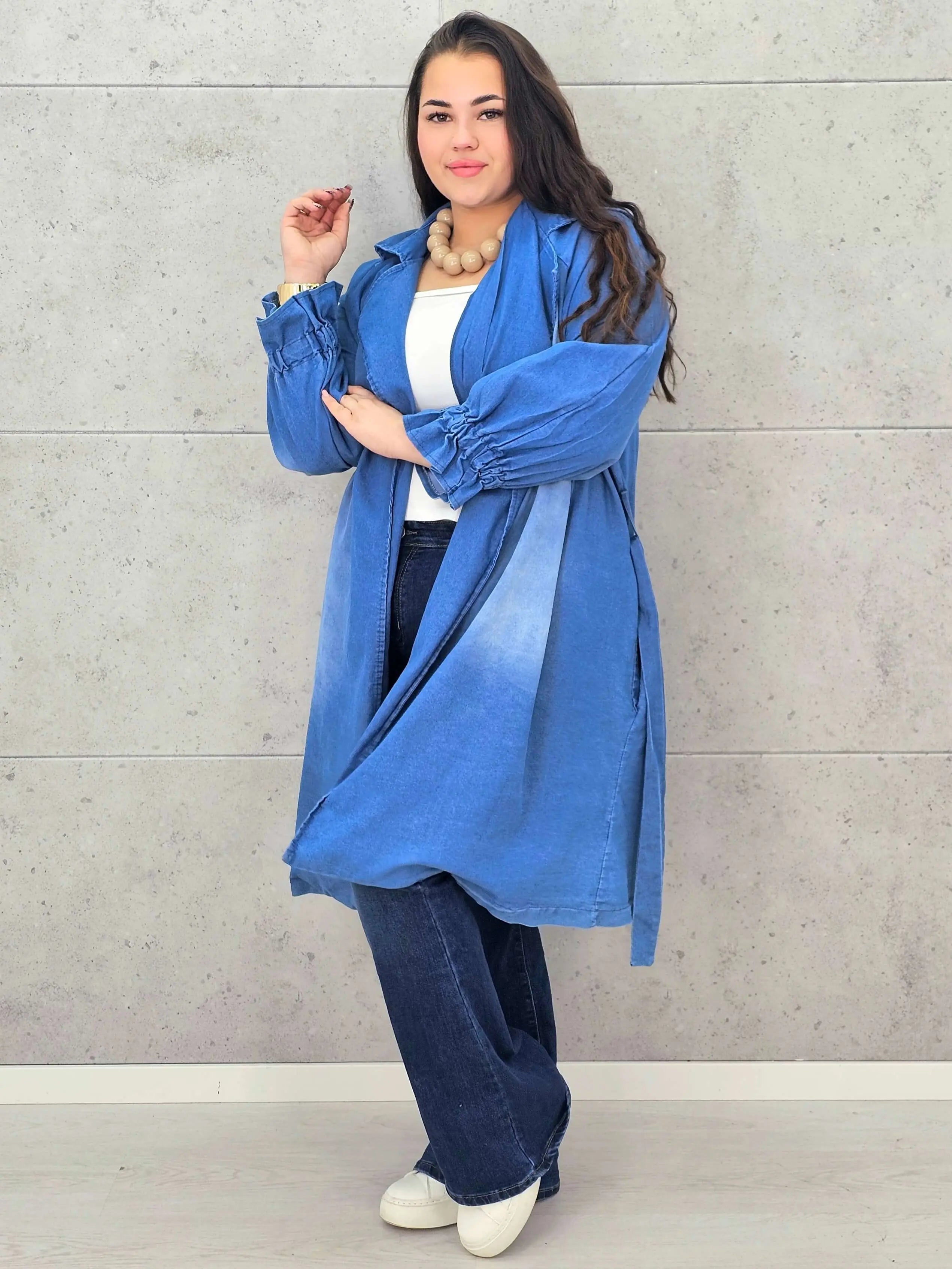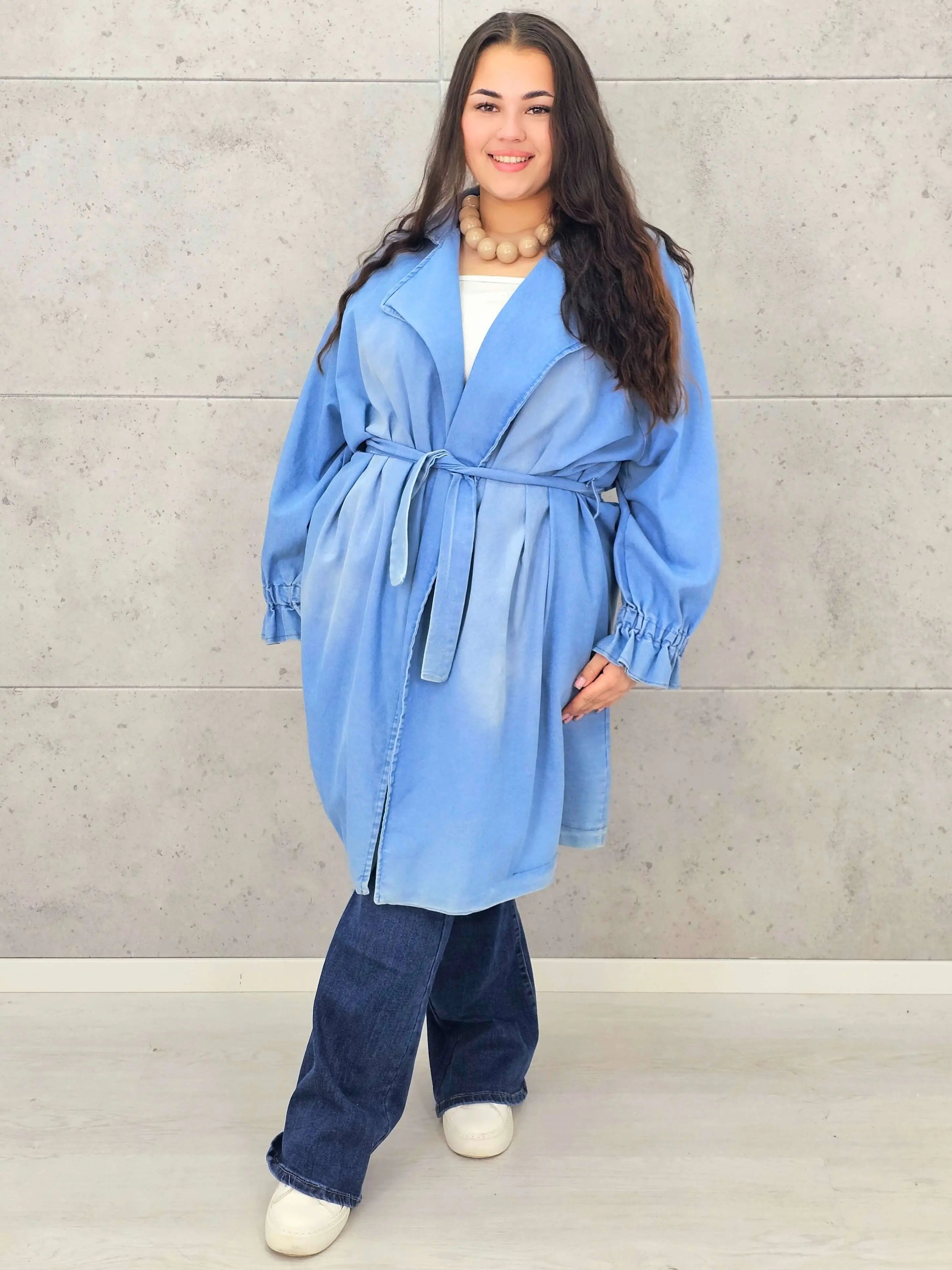 Płaszcz plus size wykonany z lekkiego, miękkiego jeansowego materiału to idealne połączenie nowoczesnego stylu i pełnego komfortu. Jego oversize’owy krój pięknie układa się na sylwetce XXL, zapewniając swobodę ruchów i modowy, nonszalancki wygląd. Pasek w talii pozwala regulować dopasowanie – możesz nosić płaszcz luźno lub podkreślić sylwetkę.
