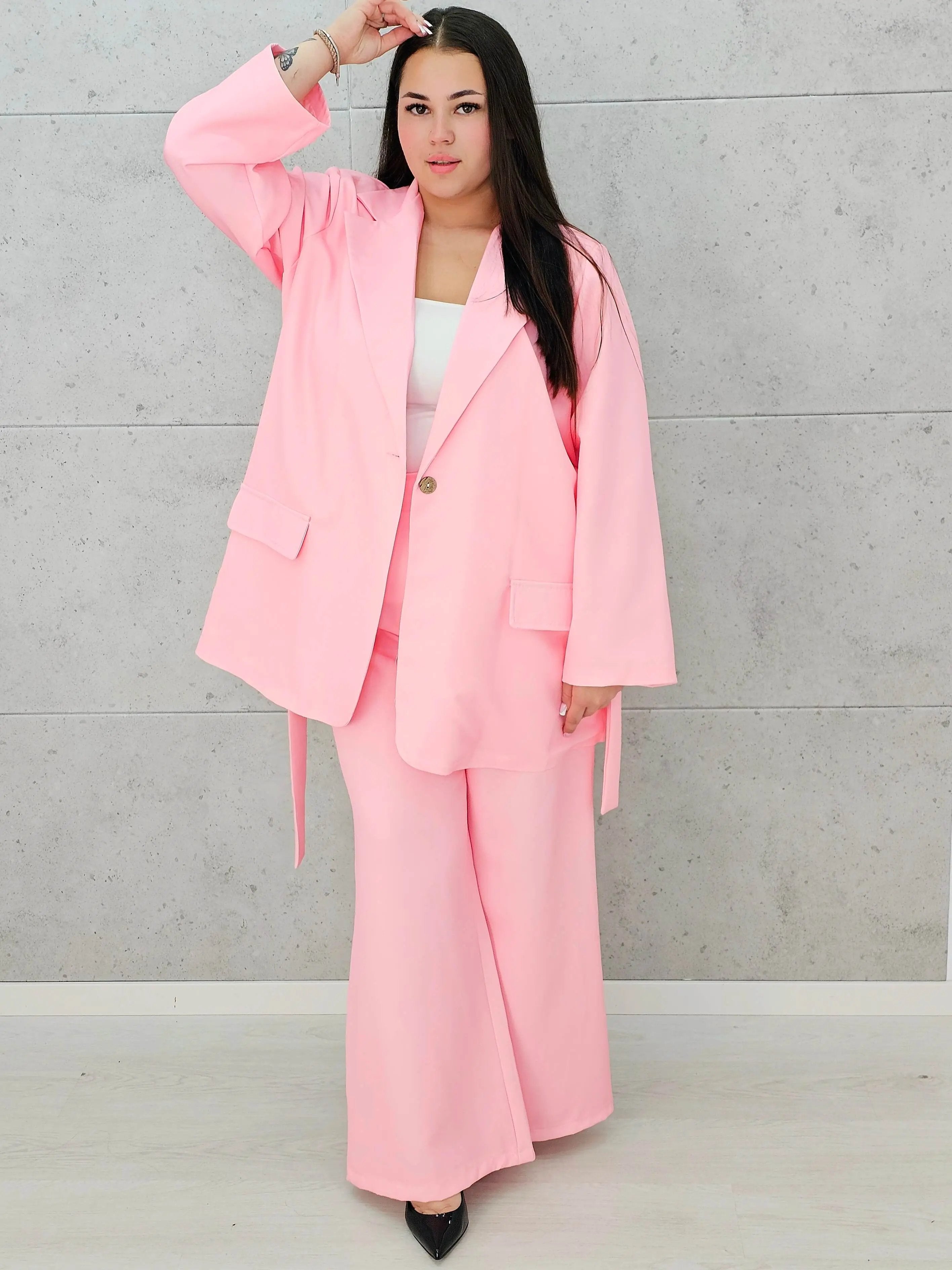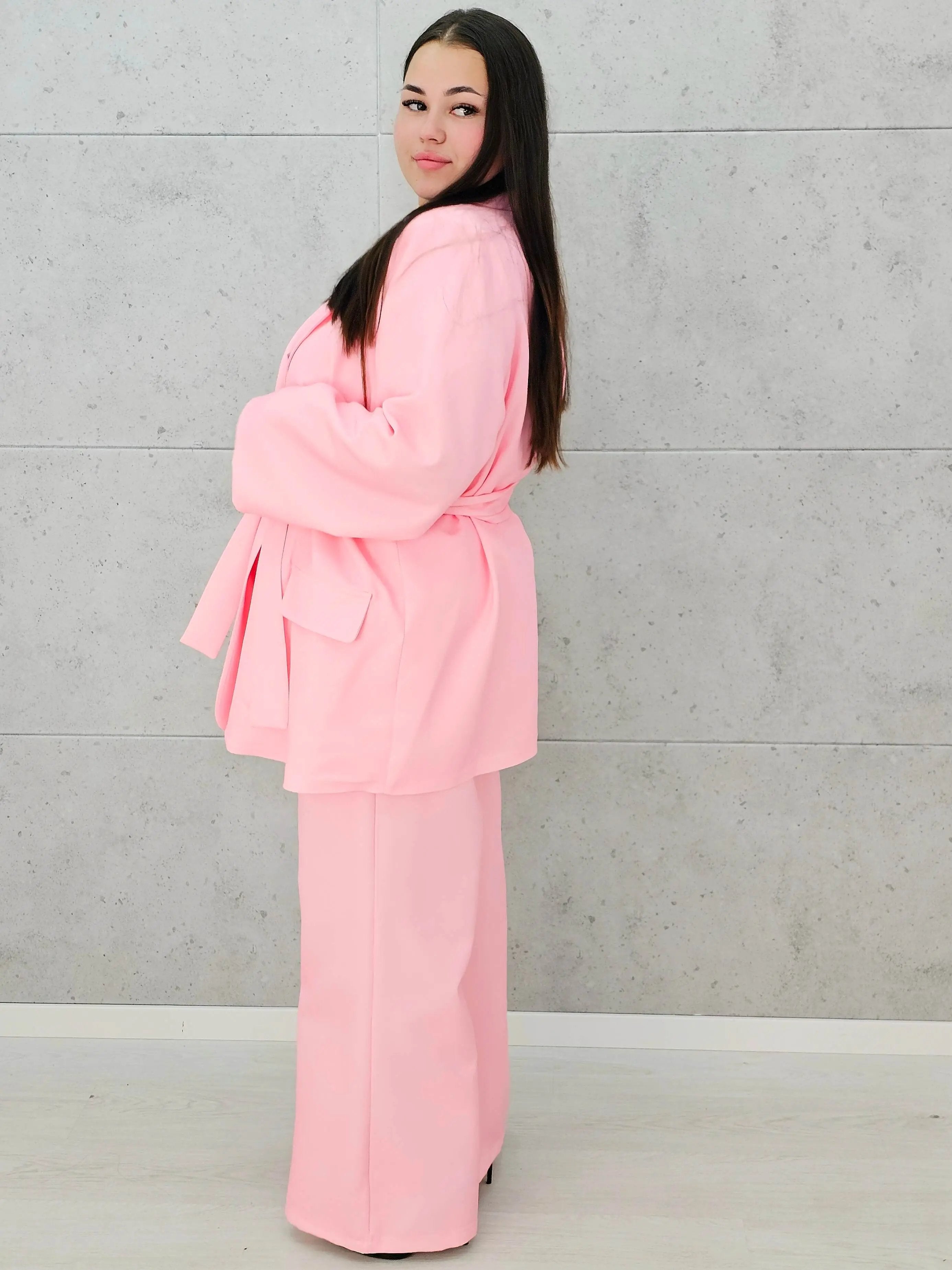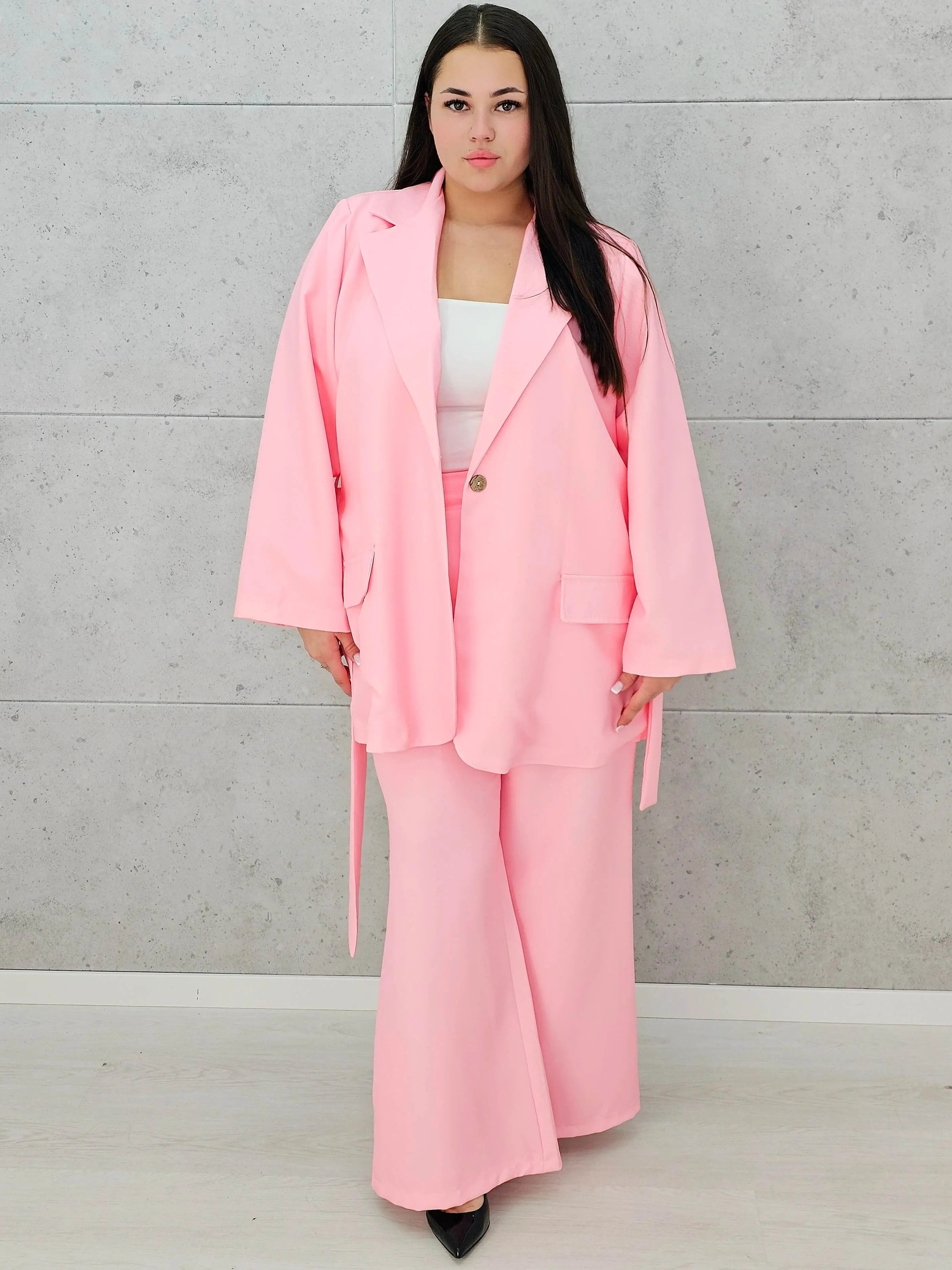 Ten zestaw w odcieniu pudrowego różu to idealna propozycja dla kobiet, które lubią wyglądać modnie, a jednocześnie czuć się komfortowo. Luźna, oversize’owa marynarka w połączeniu ze spodniami o szerokiej nogawce tworzy wyjątkowo szykowną, ale swobodną całość.