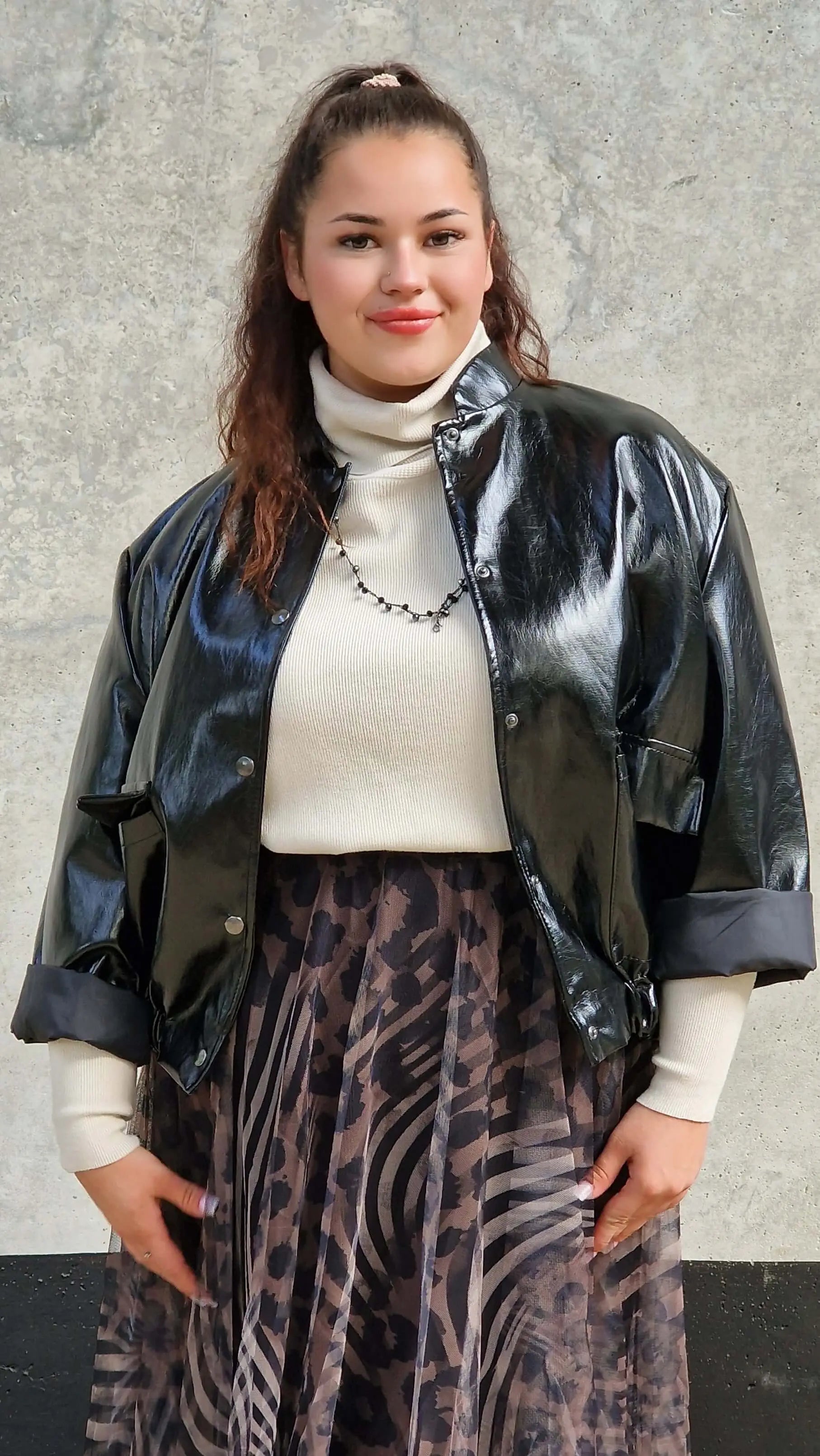 Świetnie komponuje się z jeansami, spodniami typu cargo czy nawet z sukienką, tworząc look pełen charakteru i luzu.Kurtka bomberka plus size to idealny wybór dla kobiet, które lubią nowoczesny miejski styl i chcą wyróżniać się z tłumu. Must-have w garderobie każdej stylowej kobiety, która ceni komfort, modę i autentyczność.