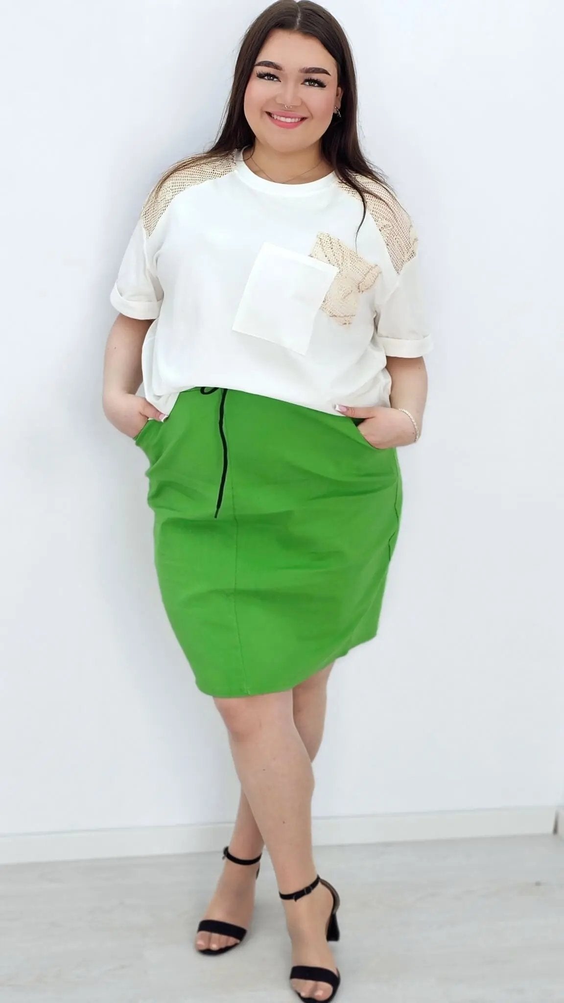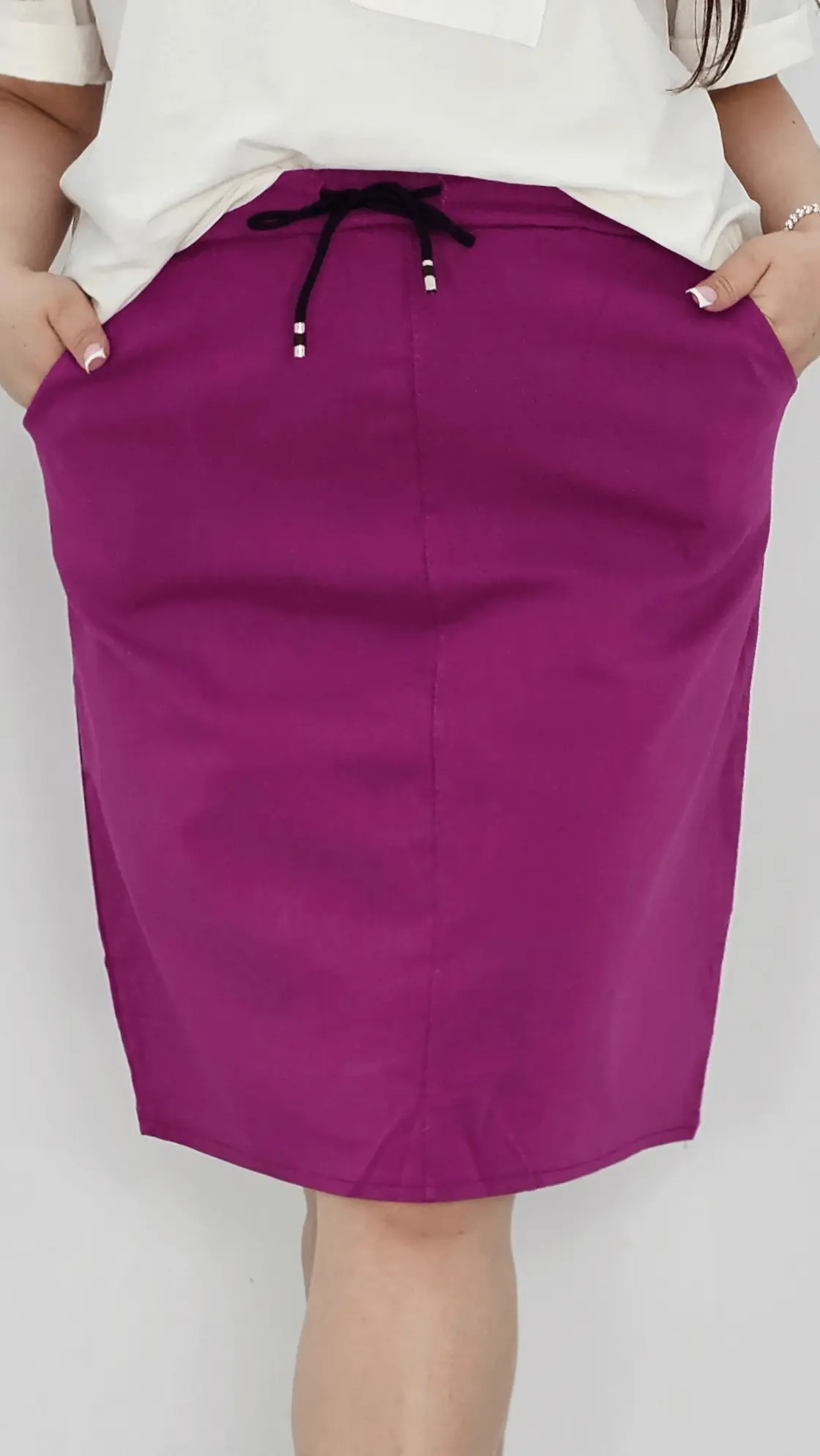 Spódnica wykonana jest z materiału gnieciuchowego, co oznacza, że posiada charakterystyczny zmienny wzór i fakturę. Model posiada elastyczną gumkę w pasie, co pozwala na łatwe dopasowanie do sylwetki. Ponadto spódnica posiada praktyczne kieszenie po bokach, co czyni ją bardziej funkcjonalną.