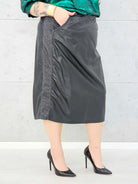 Elastyczny pas zapewnia dopasowanie, a długość za kolano tworzy elegancki, zrównoważony look — idealny do koszul, sweterków i body.