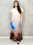 Sukienka plus size maxi to idealne połączenie prostoty i romantycznego charakteru. Gładka, minimalistyczna góra pięknie równoważy artystyczny dół, który zdobi malarski, kwiatowy motyw tworzący subtelny i niezwykle kobiecy efekt. To model, który doskonale sprawdzi się zarówno na codzienne wyjścia, jak i na bardziej wyjątkowe okazje.