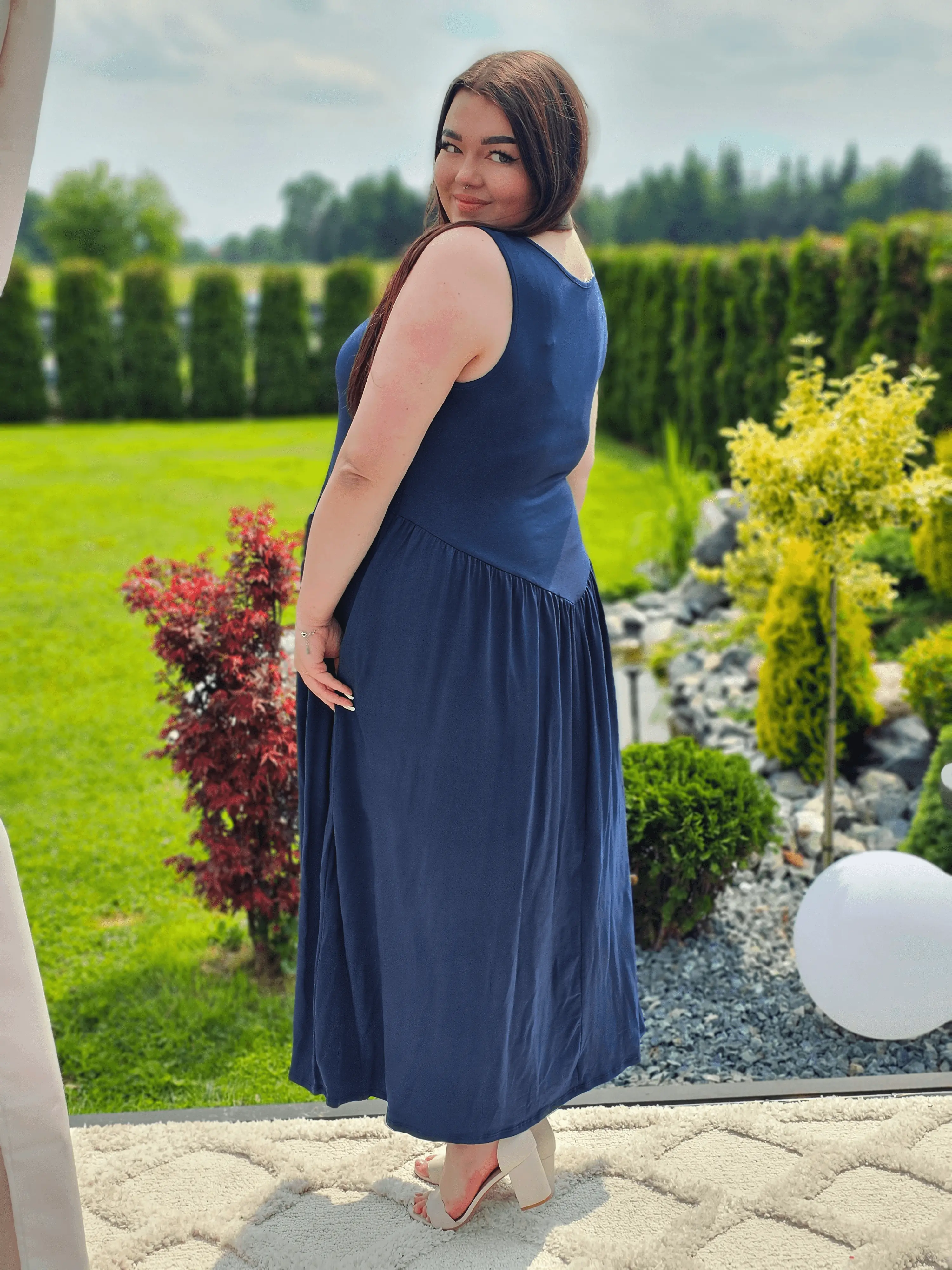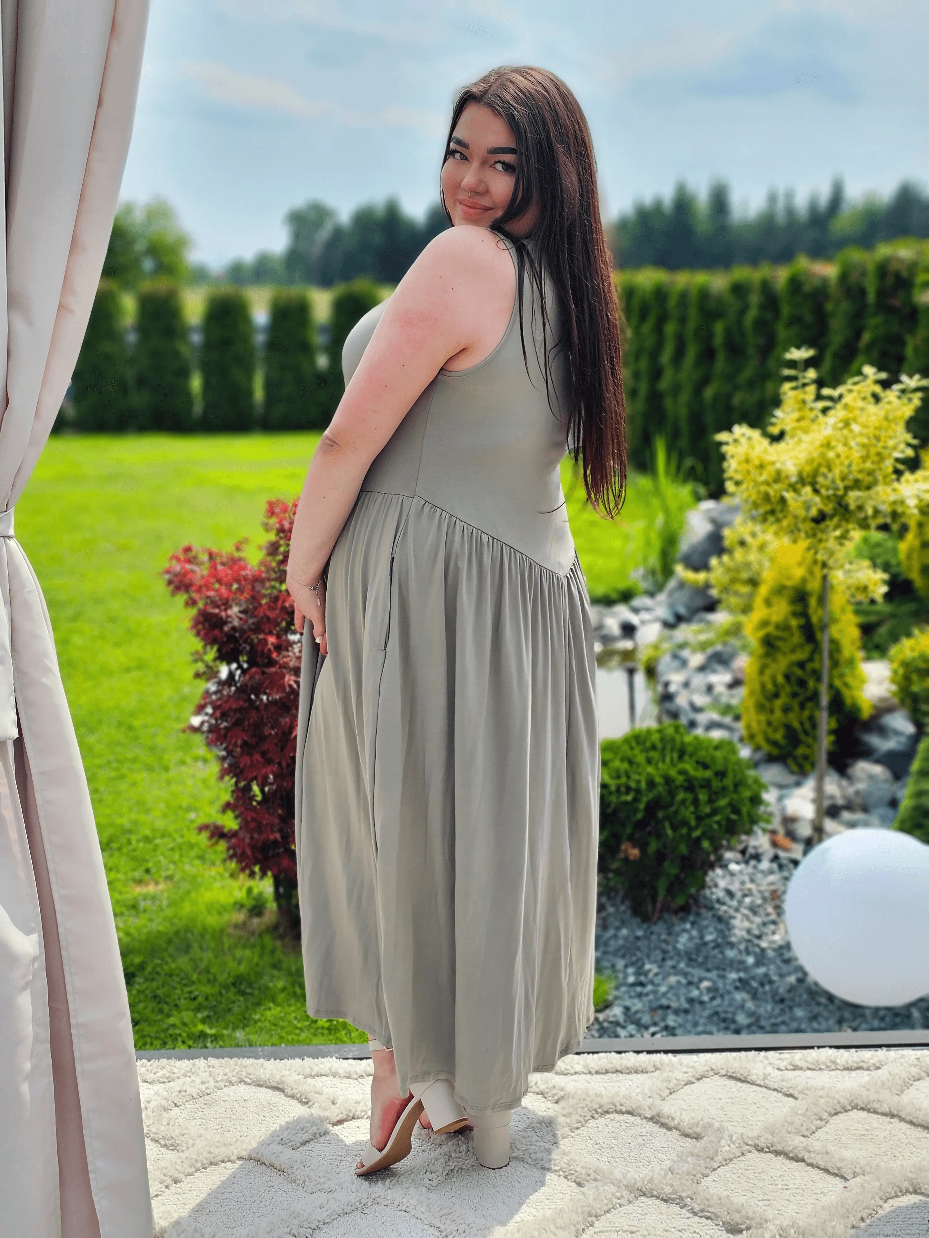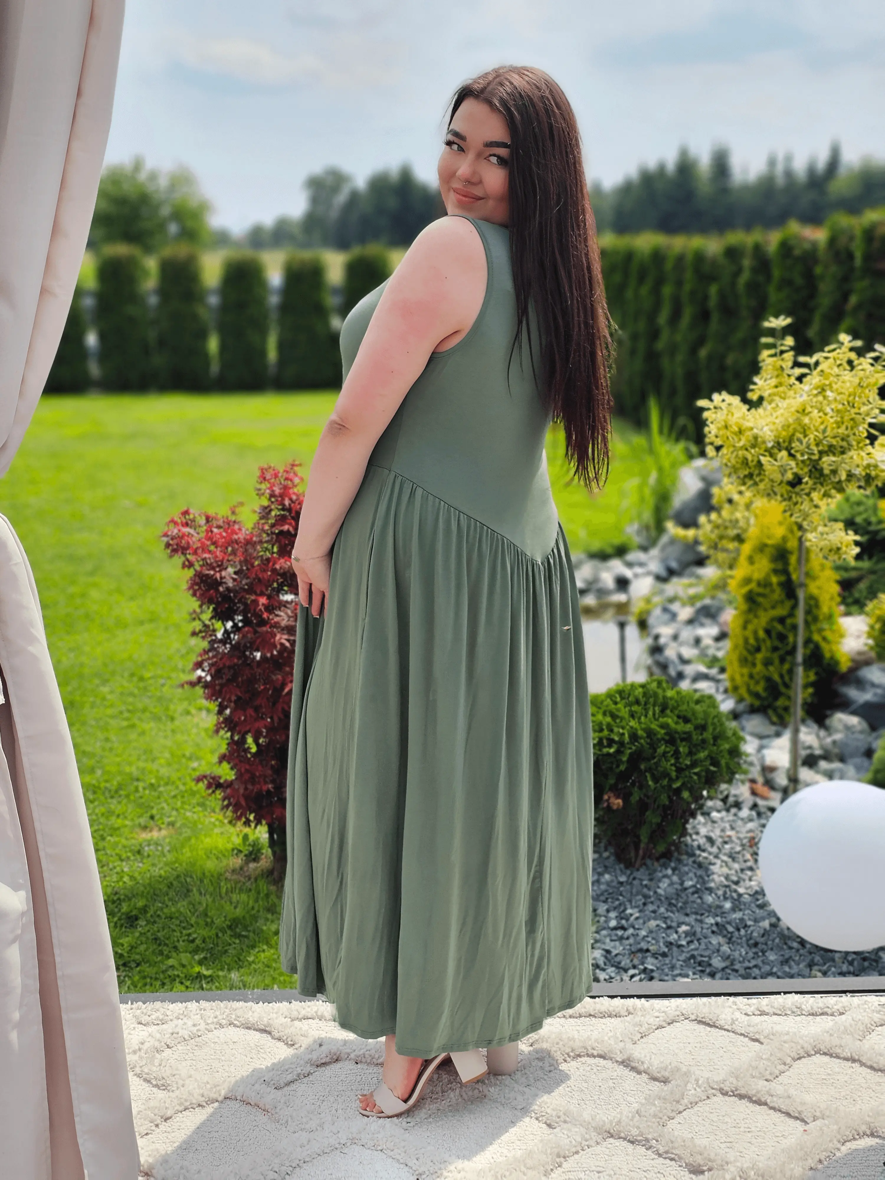 Jeśli marzysz o sukience, która będzie jednocześnie stylowa i ultrawygodna – właśnie ją znalazłaś! Ta rozkloszowana sukienka maxi wykonana z miękkiej dzianiny wiskozowej pięknie układa się na sylwetce, nie opinając ciała. Gładka góra z szerokimi ramiączkami i cięcie w literę V sprawiają, że całość wygląda lekko, nowocześnie i bardzo kobieco