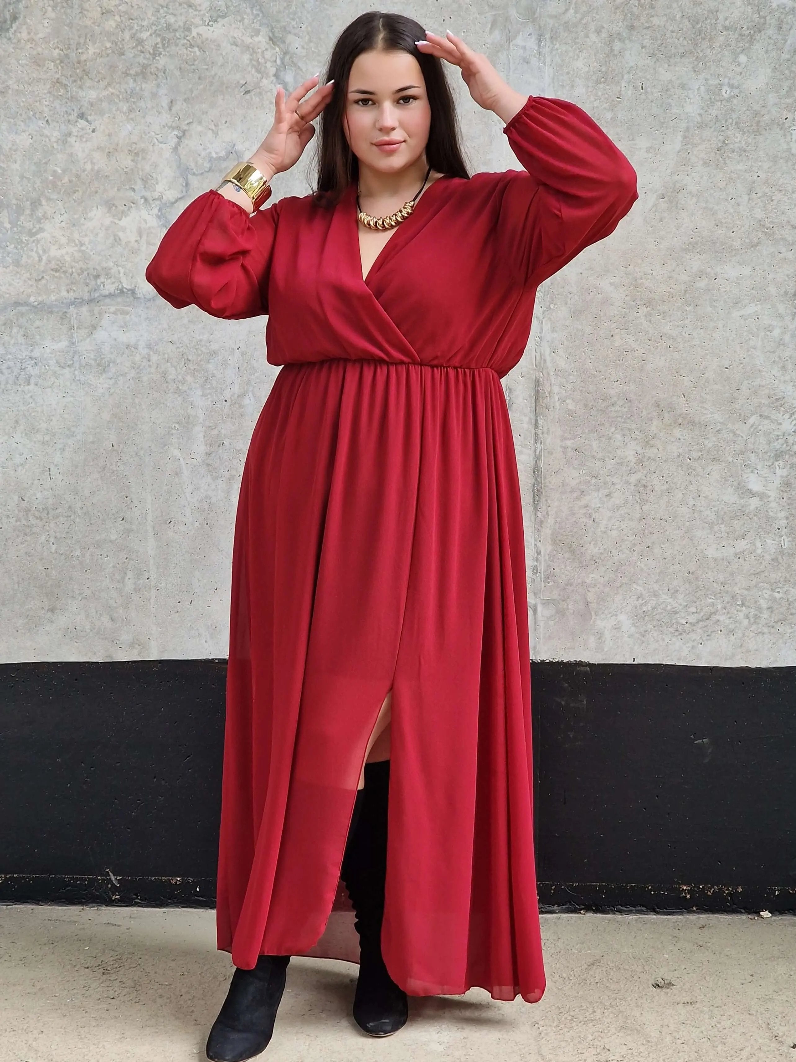 Transparentne, długie rękawy nadają sukience romantycznego charakteru, a zmysłowe rozcięcie na nodze wprowadza element finezji i elegancji. To doskonały wybór na wieczorne przyjęcia, wesela czy inne wyjątkowe wydarzenia, gdzie chcesz zabłysnąć i czuć się pewnie.