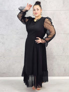 Sukienka plus size to połączenie klasycznej czerni z modnymi, transparentnymi rękawami wykończonymi subtelną kropką. Długość maxi oraz szeroka falbana z tiulu dodają sylwetce lekkości, a jednocześnie zapewniają efekt eleganckiej, pełnej wdzięku stylizacji.