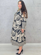 Dekolt zapinany na guziki dodaje klasy, a długi, delikatnie rozkloszowany dół sprawia, że sukienka prezentuje się niezwykle kobieco i lekko. Wyróżnia ją efektowny, kontrastowy print, który przyciąga uwagę i nadaje stylizacji niepowtarzalnego charakteru. To model idealny na wyjścia, spotkania, do pracy oraz na co dzień – wszędzie tam, gdzie chcesz wyglądać modnie i komfortowo.