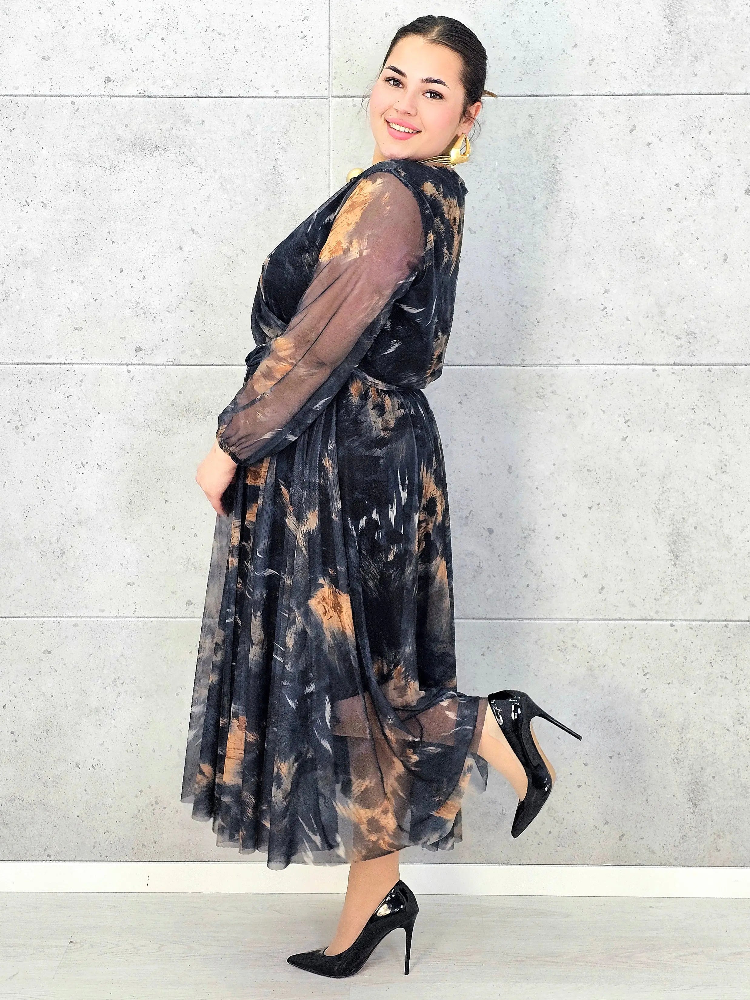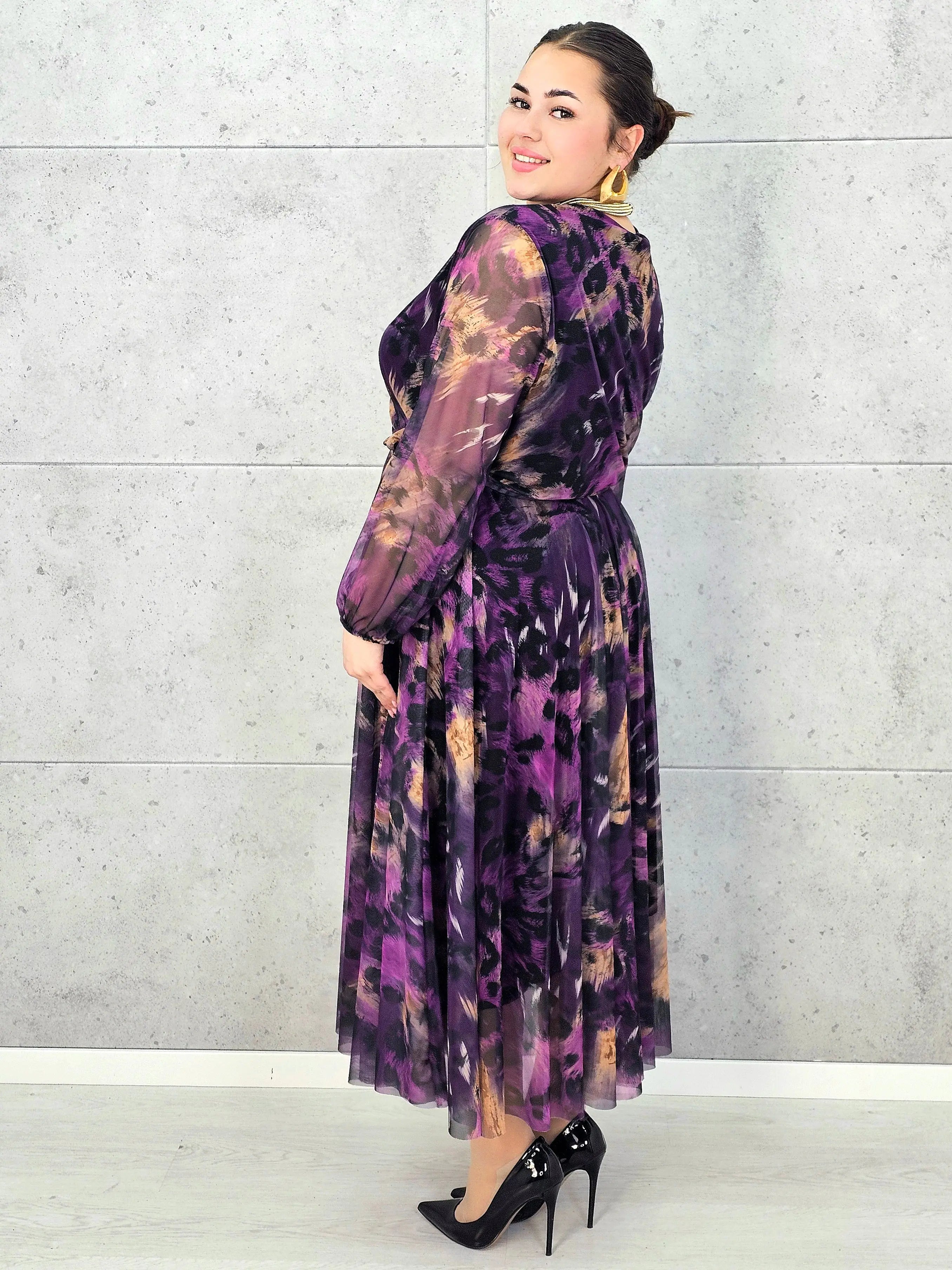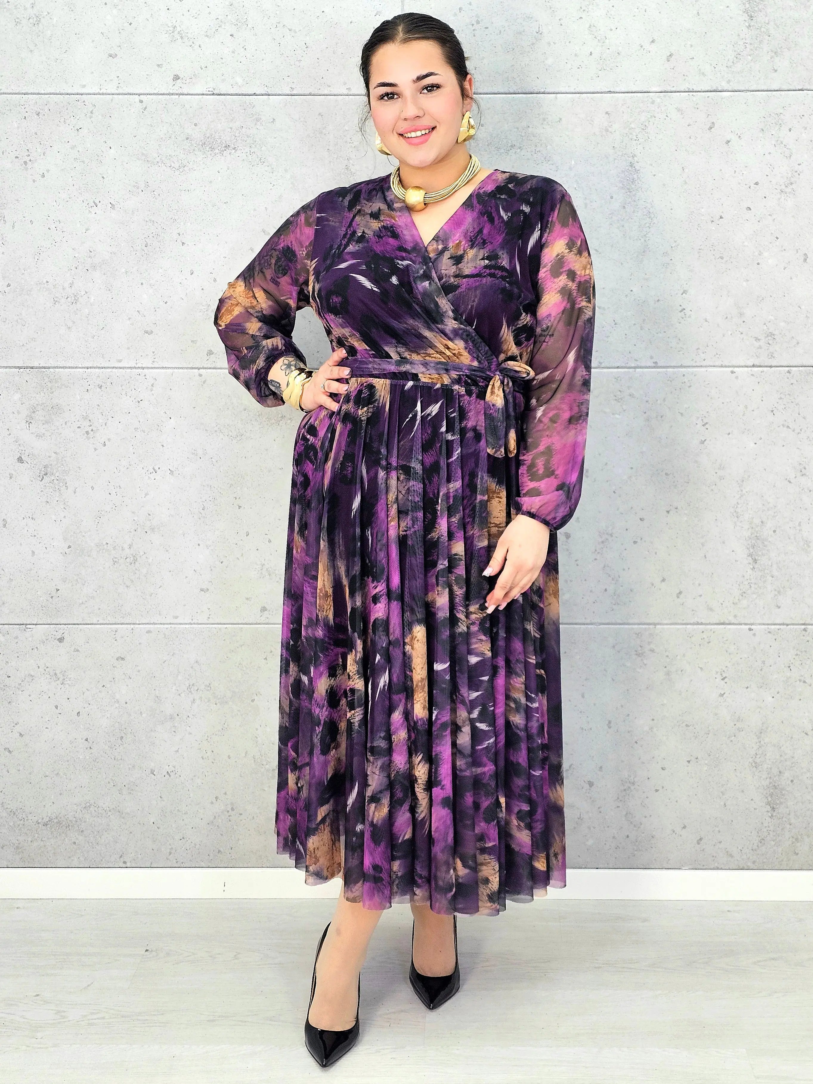Ta elegancka sukienka plus size z kopertowym dekoltem to propozycja dla kobiet, które kochają efektowne, zwiewne modele podkreślające talię i dodające sylwetce lekkości. Delikatny szyfon pięknie układa się w ruchu, a długość midi sprawia, że model idealnie sprawdzi się zarówno na większe wyjścia, jak i codziennie, gdy chcesz wyglądać wyjątkowo.