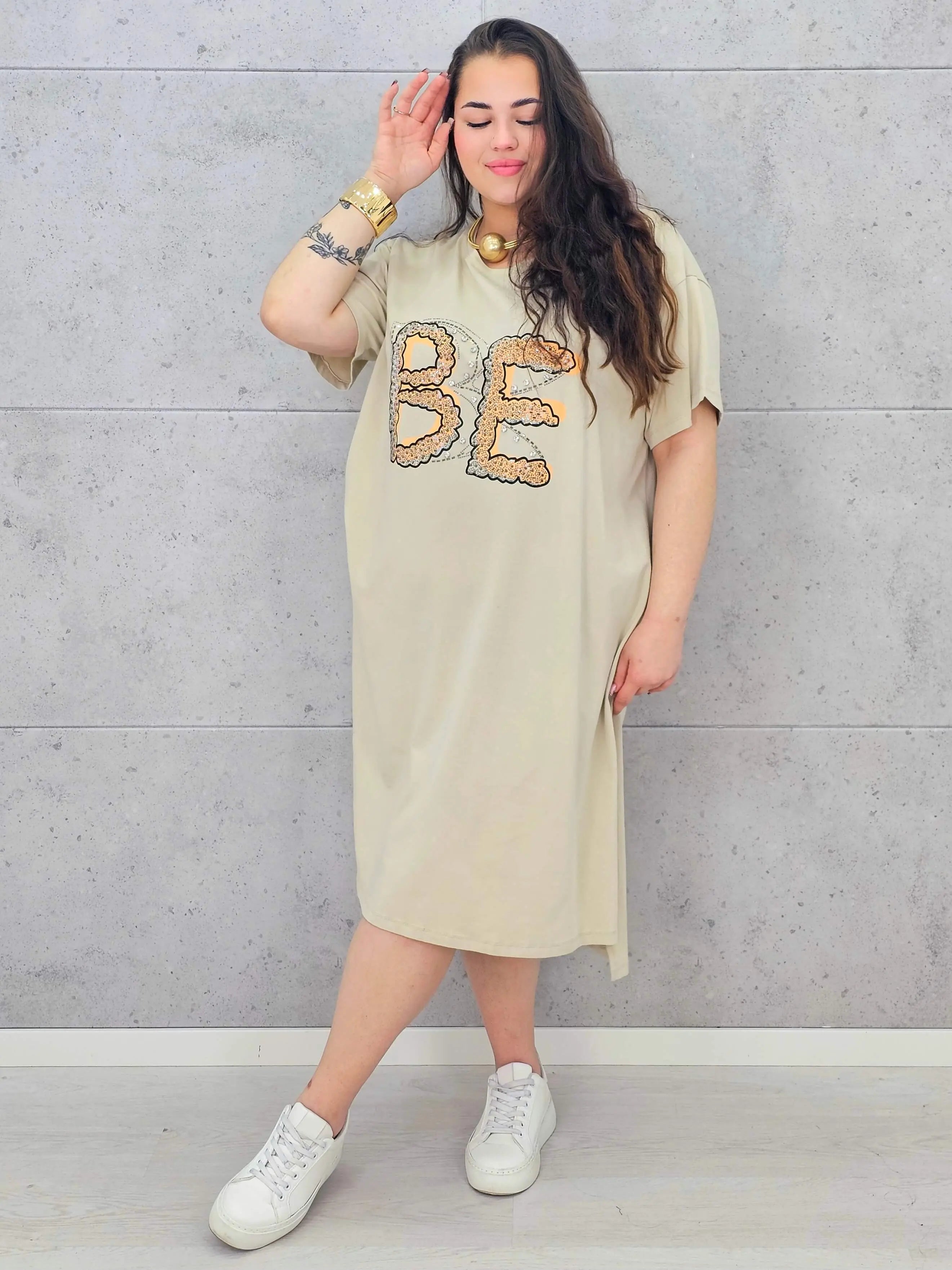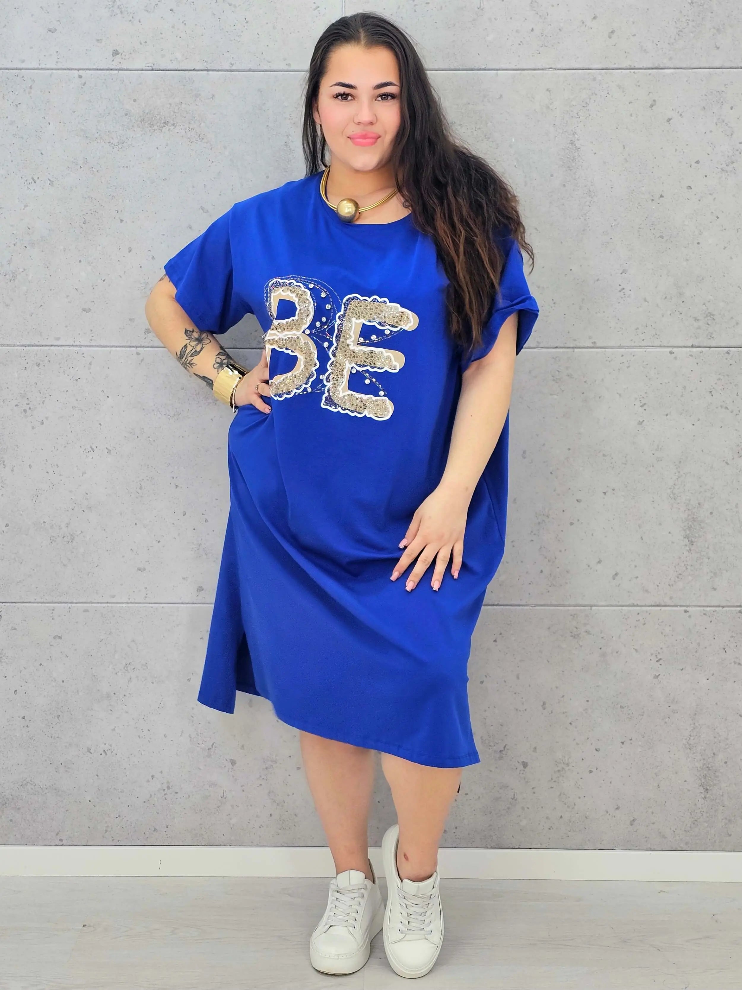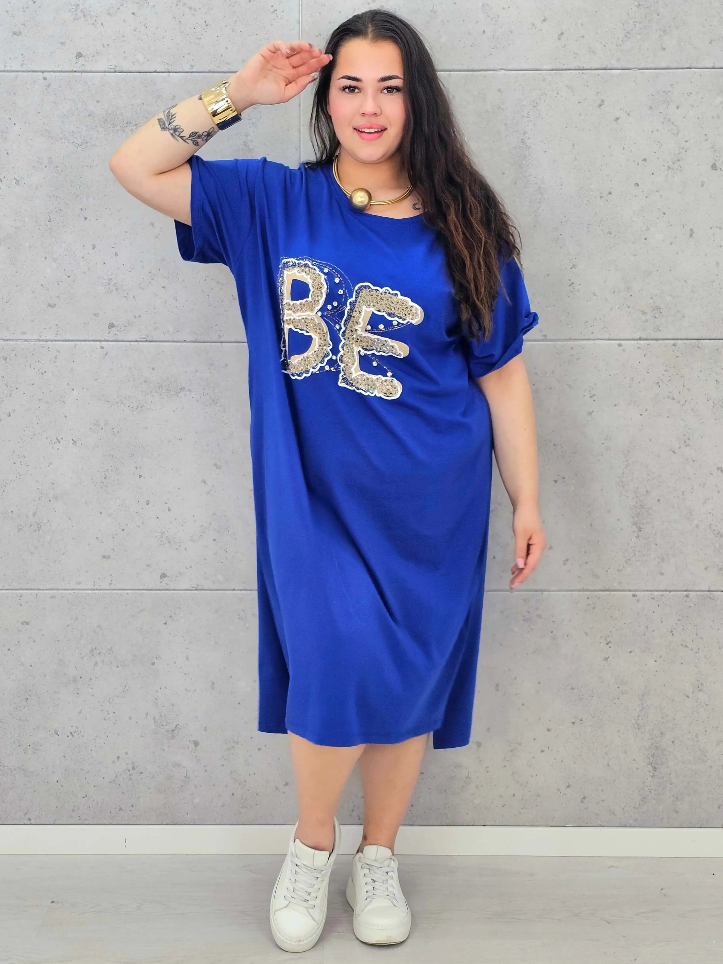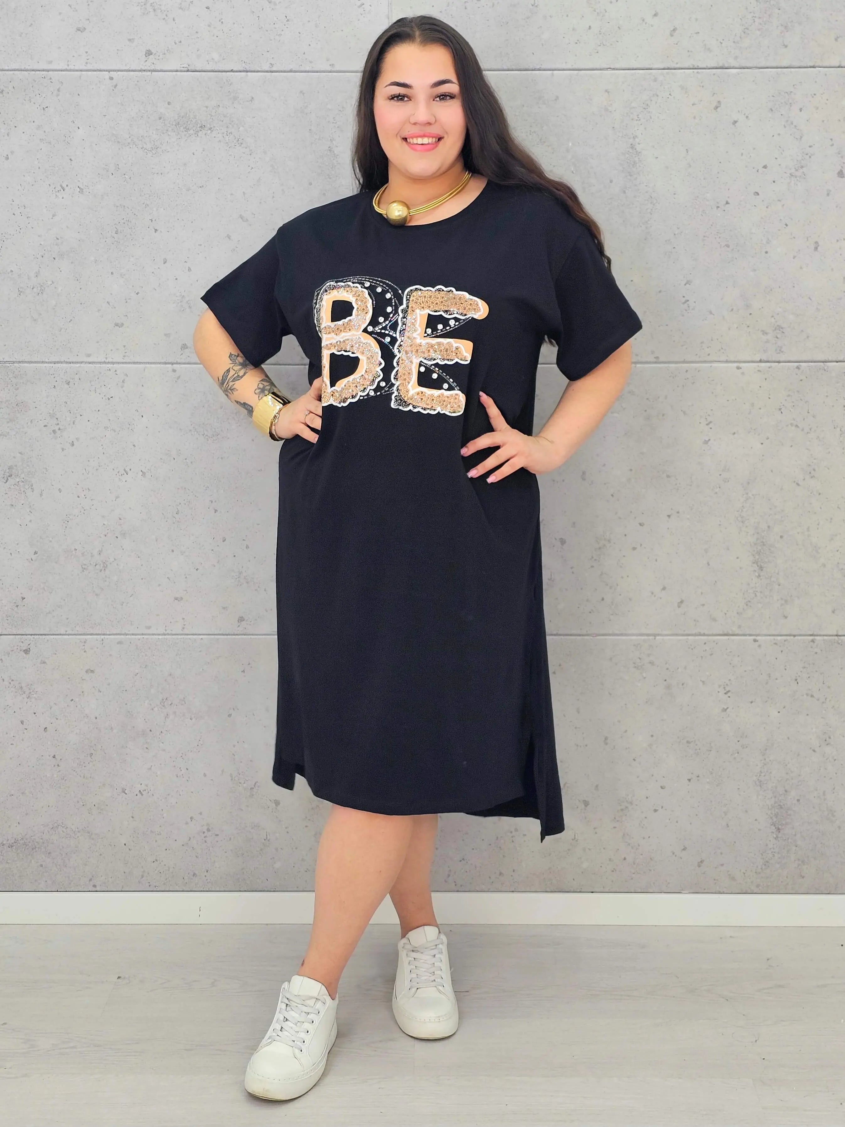 Sukienka plus size – wygodny oversize z cekinowym napisem BE