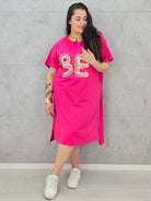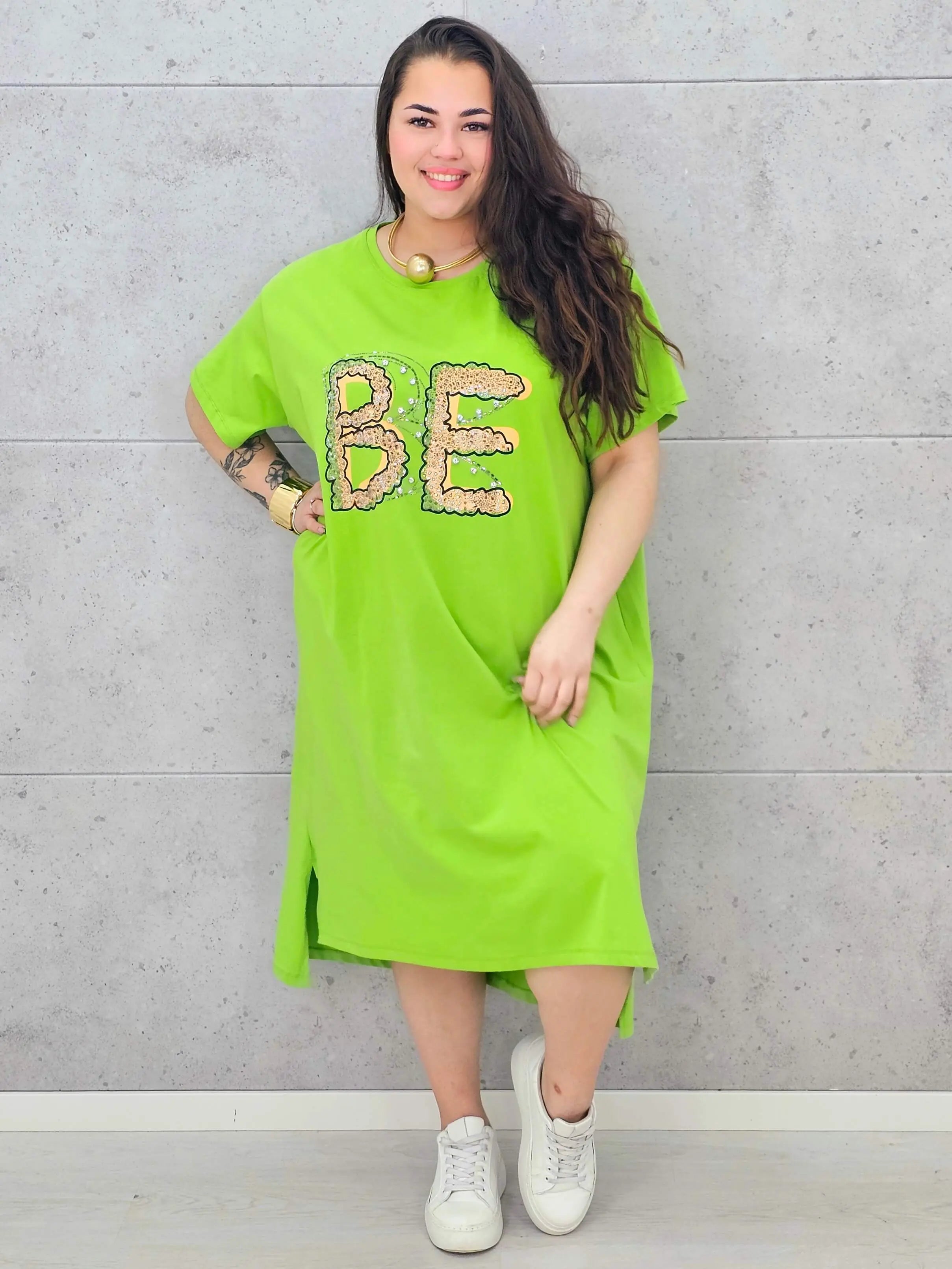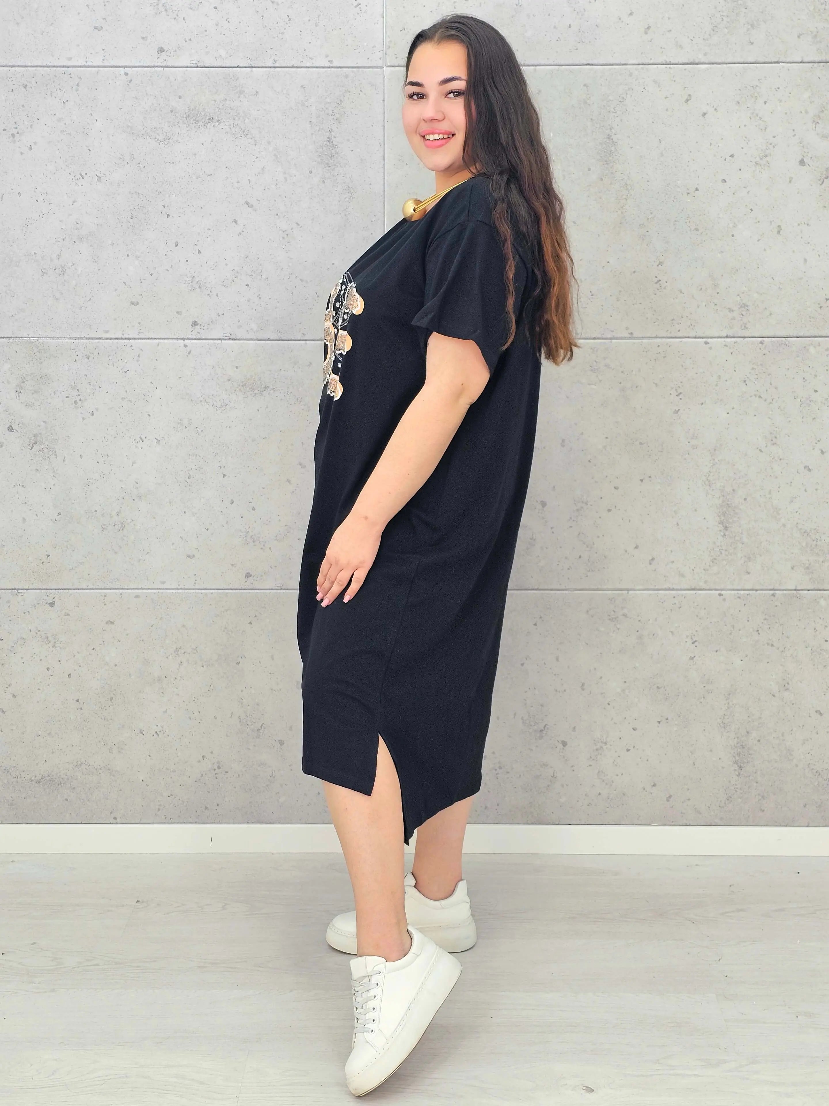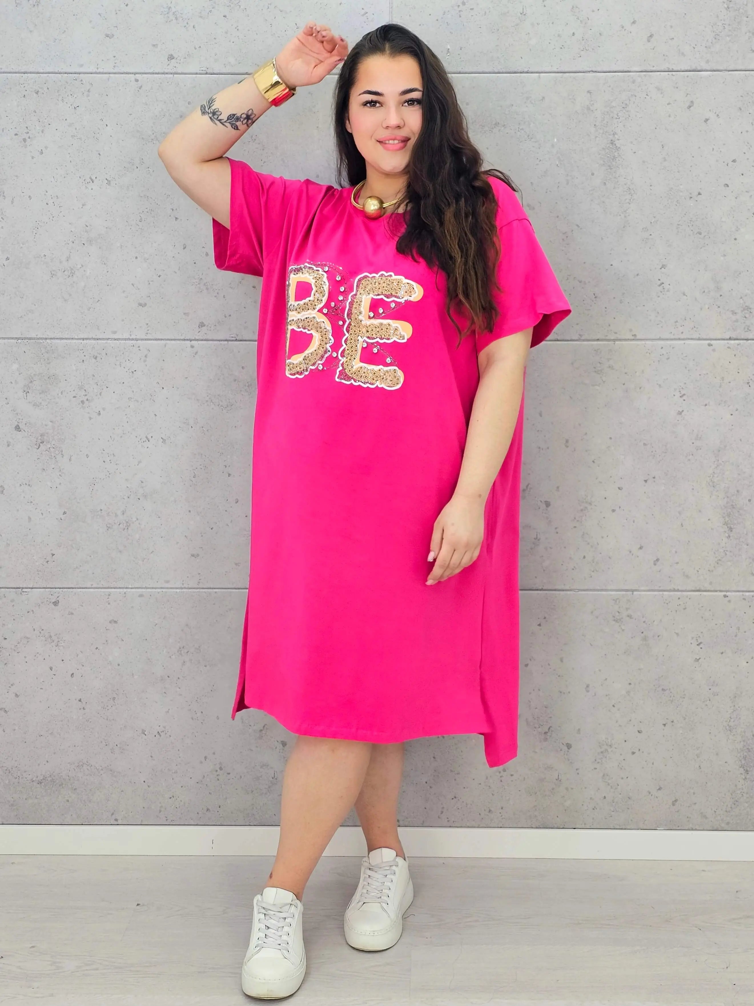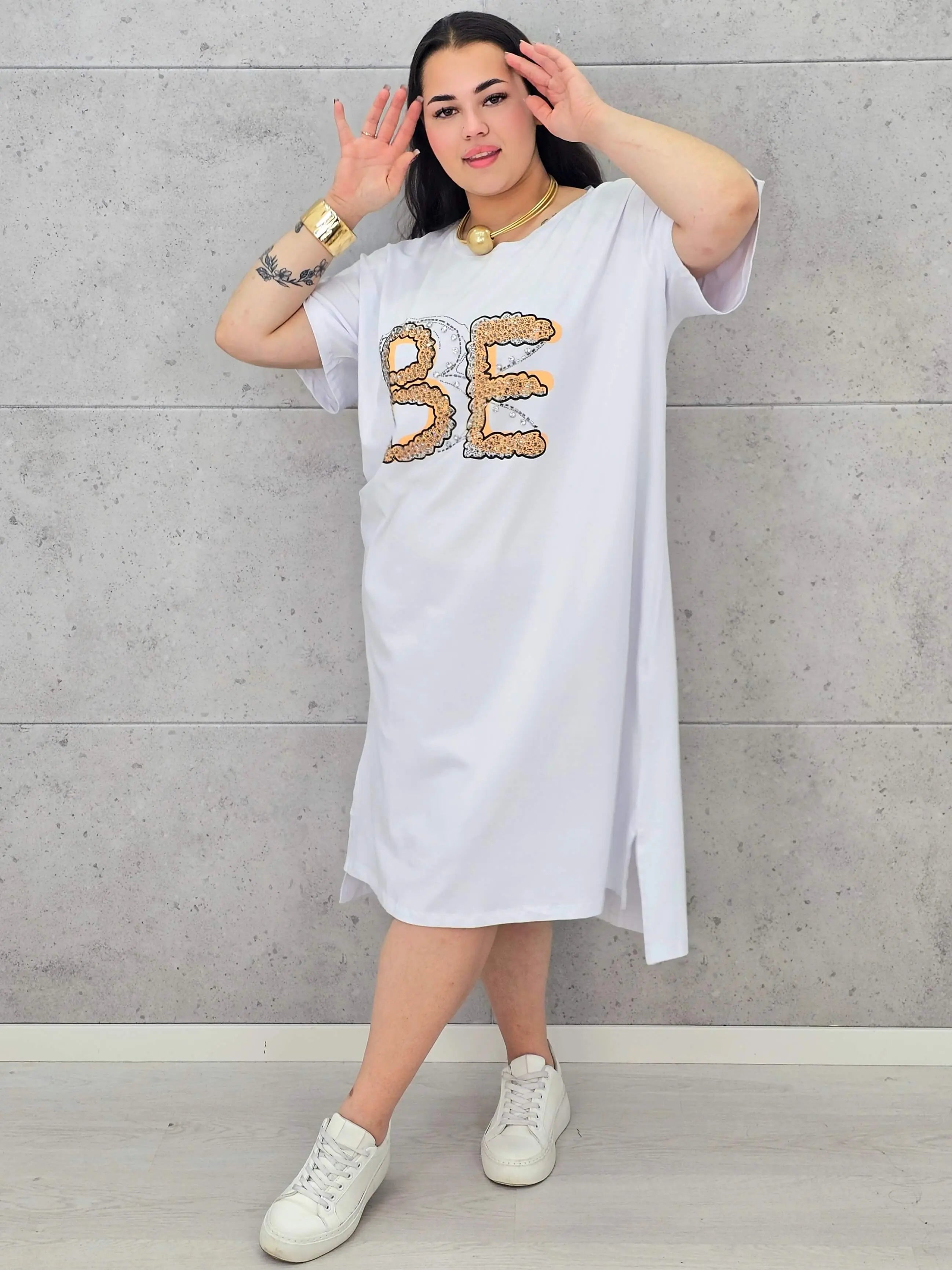 Sukienka plus size – wygodny oversize z cekinowym napisem BE