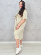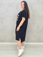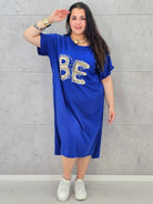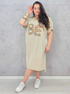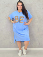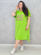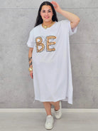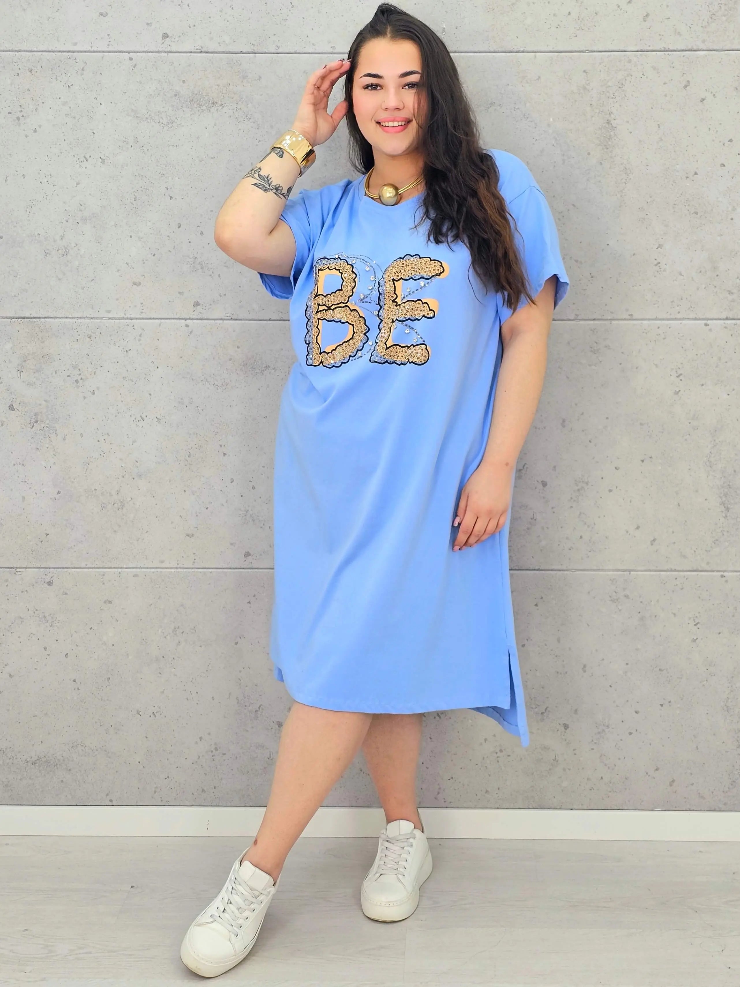 Miękki, przewiewny materiał doskonale sprawdza się w codziennych stylizacjach, a długość midi pięknie wysmukla figurę. Na przodzie znajduje się ozdobny napis „BE”, wykonany z dekoracyjnych aplikacji i połyskujących cekinów, które dodają całości wyjątkowego, modnego charakteru w duchu stylu plus size.