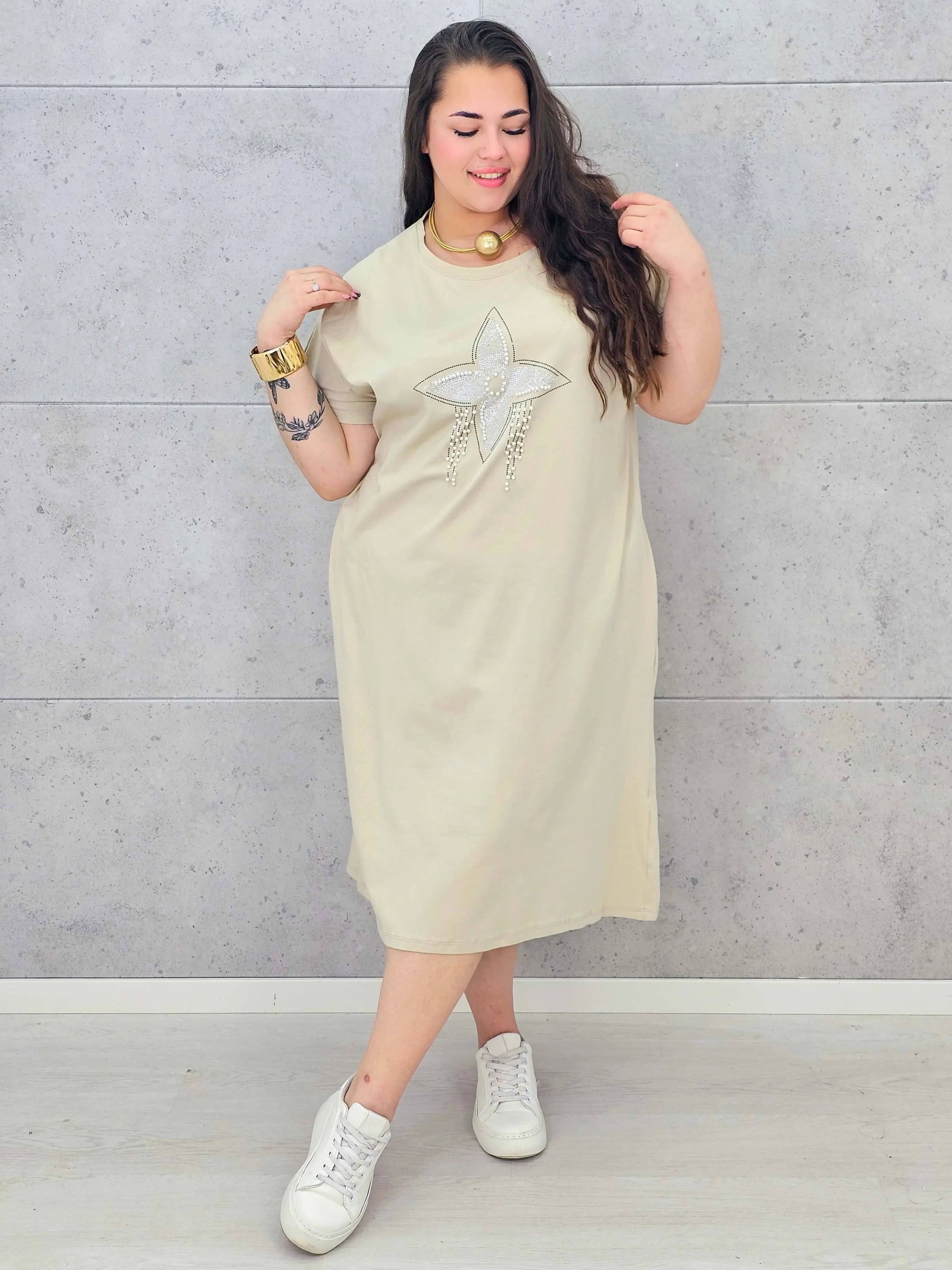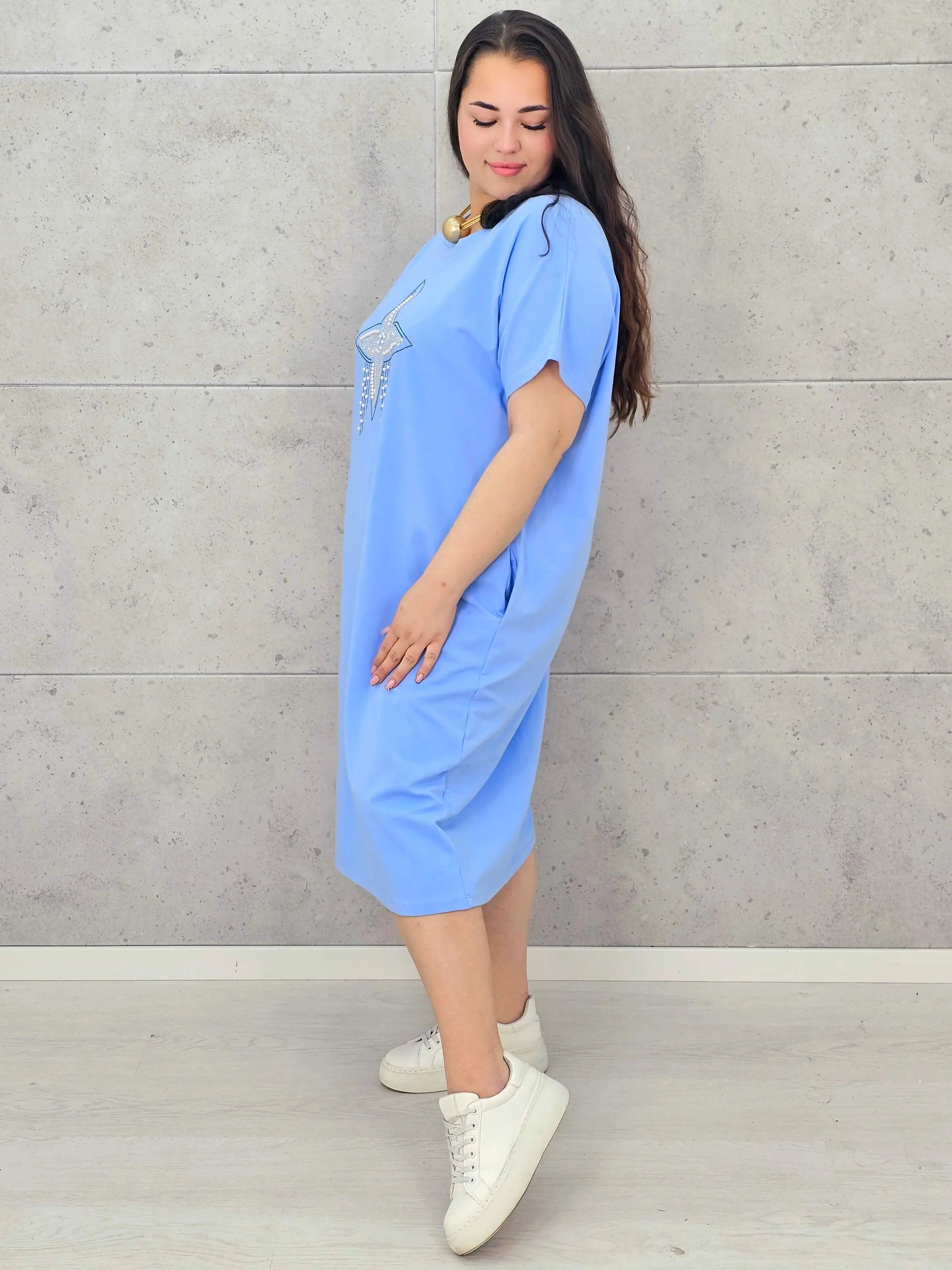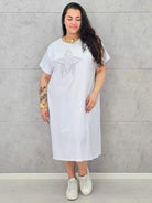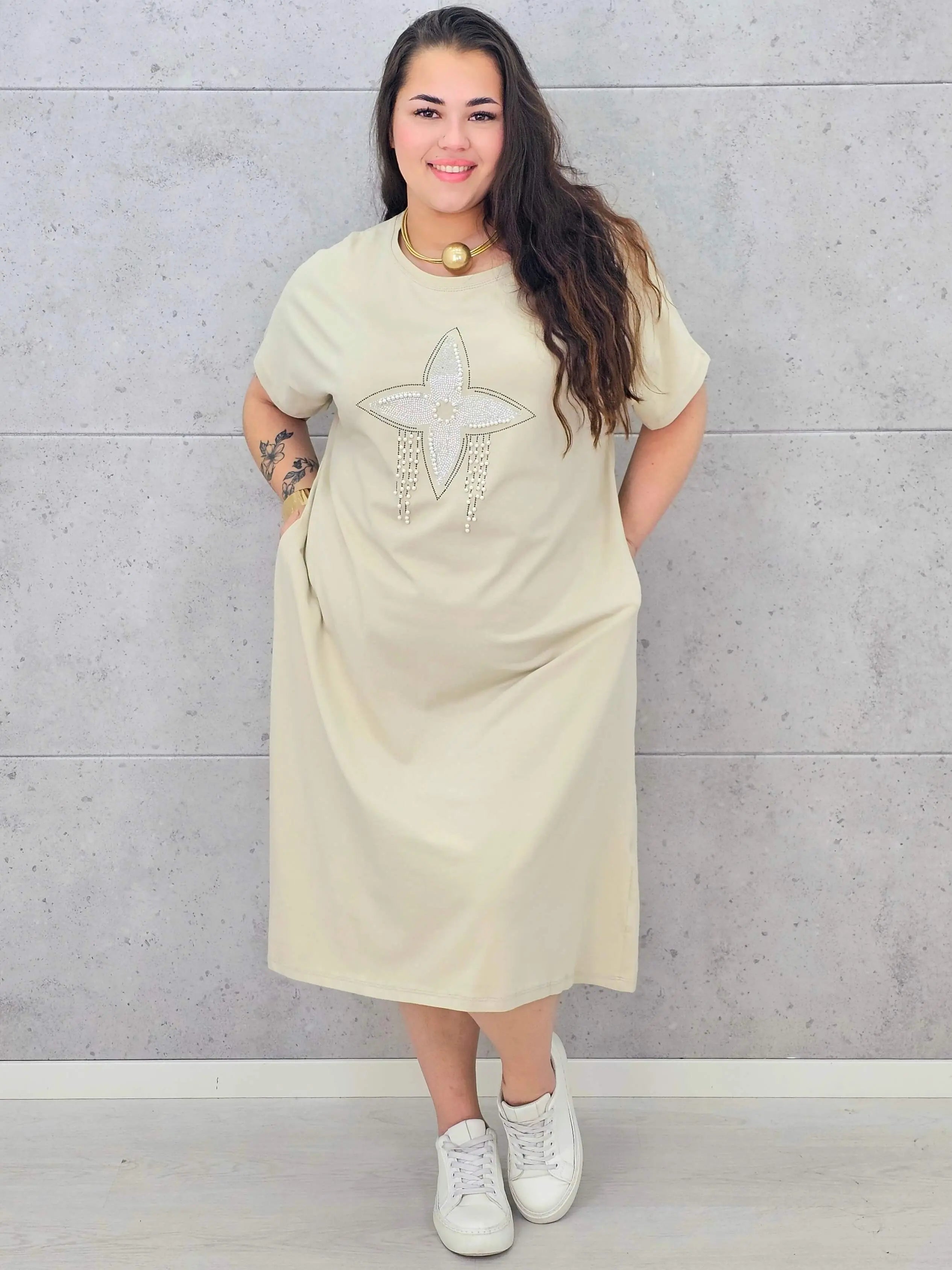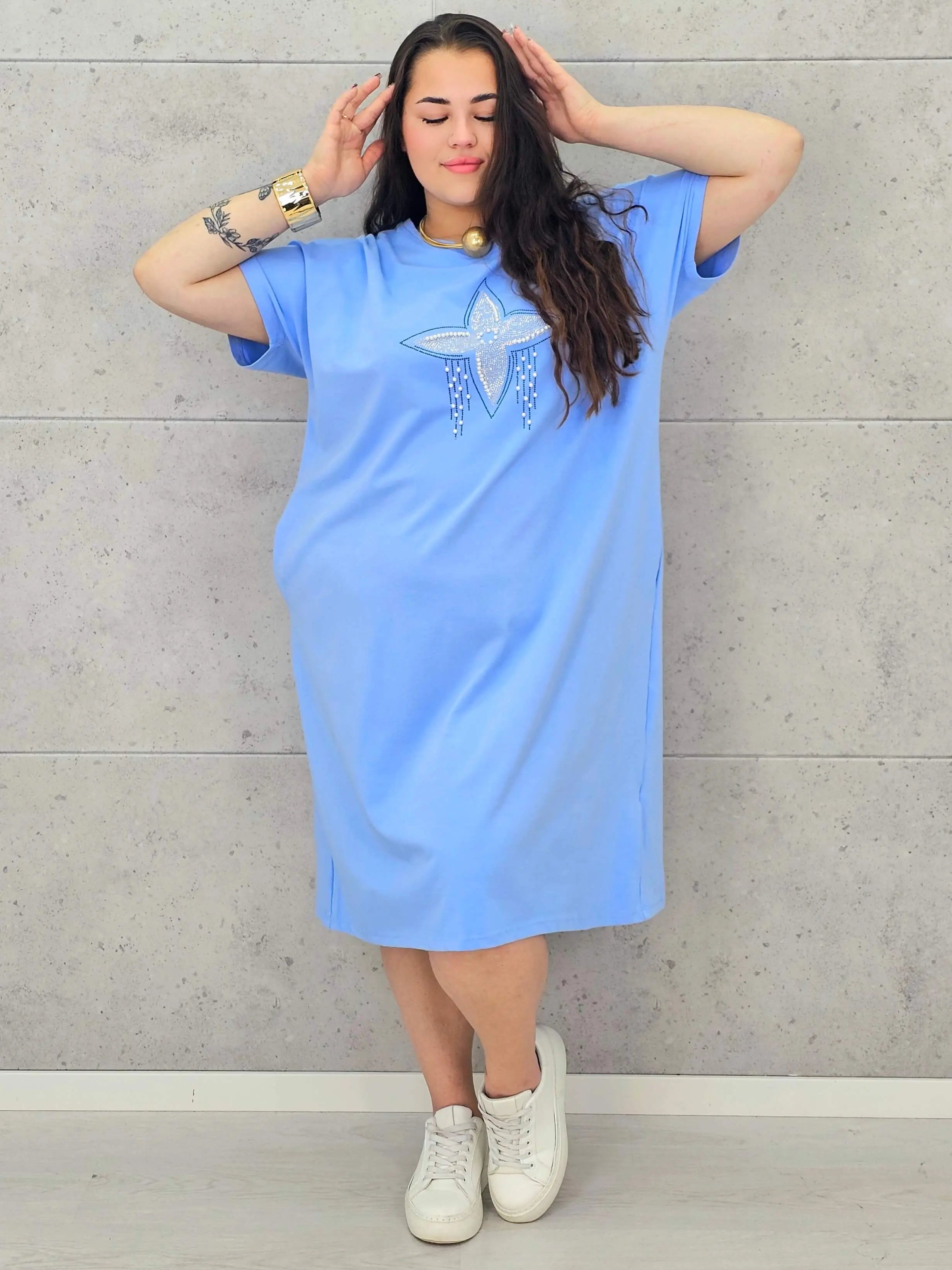 Przód sukienki zdobi duża aplikacja gwiazdy wykonana z cyrkonii, która dodaje całości wyjątkowego blasku i sprawia, że stylizacja prezentuje się świeżo, kobieco i bardzo modnie. Miękki, przyjemny w dotyku materiał idealnie sprawdzi się na co dzień – do pracy, na spacer, zakupy czy letnie spotkania.