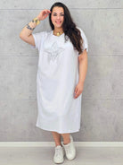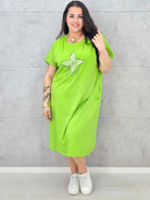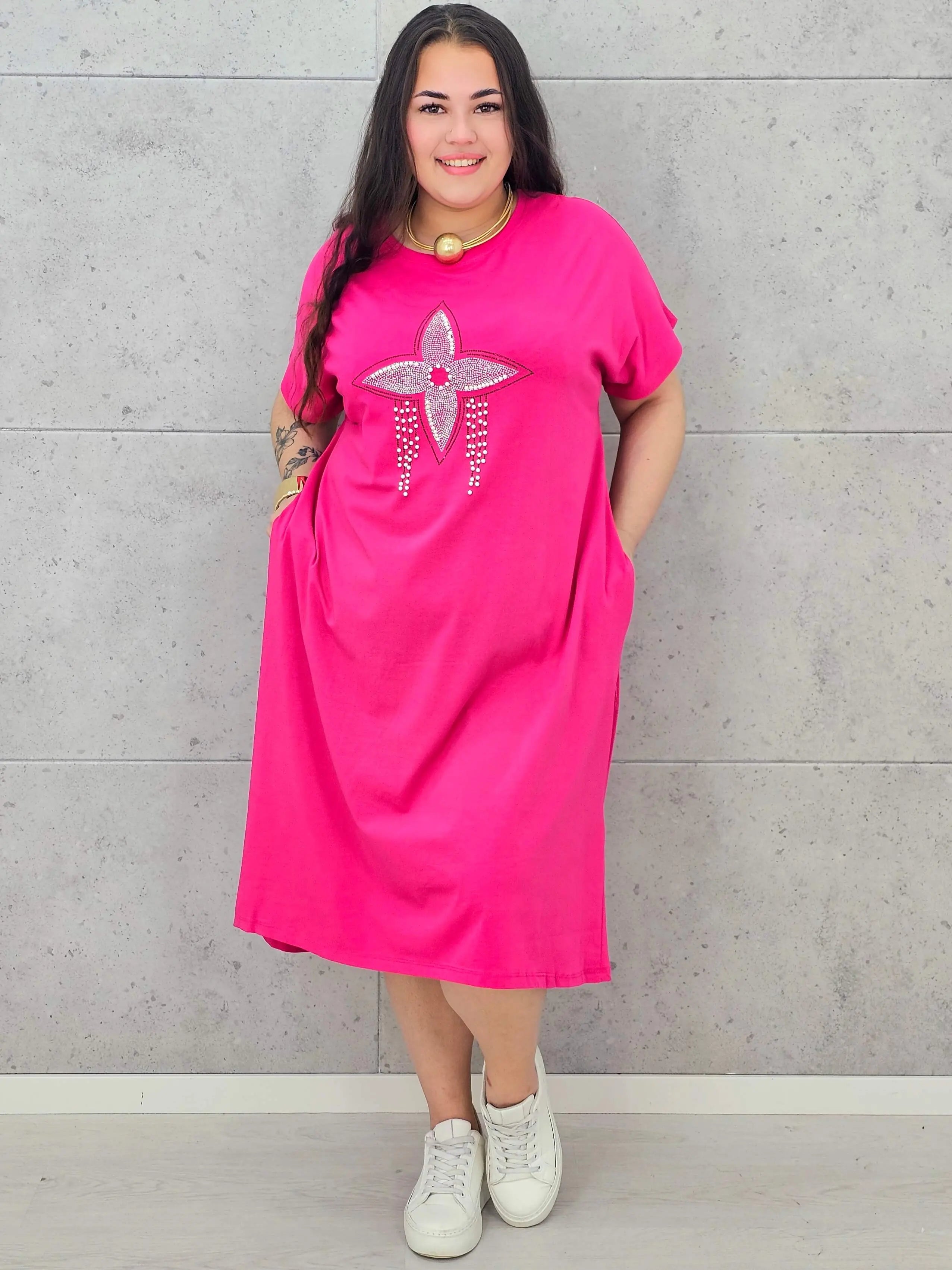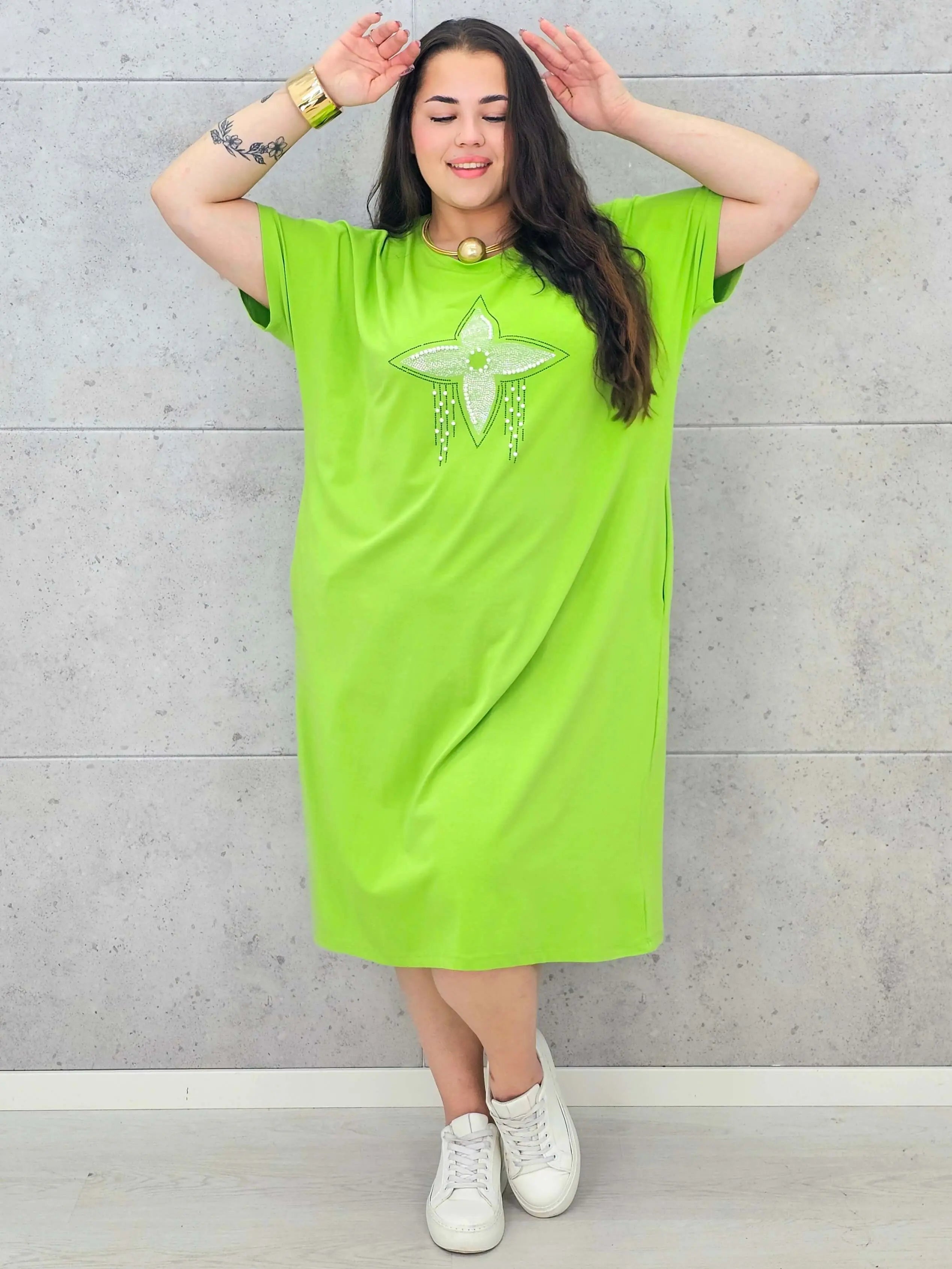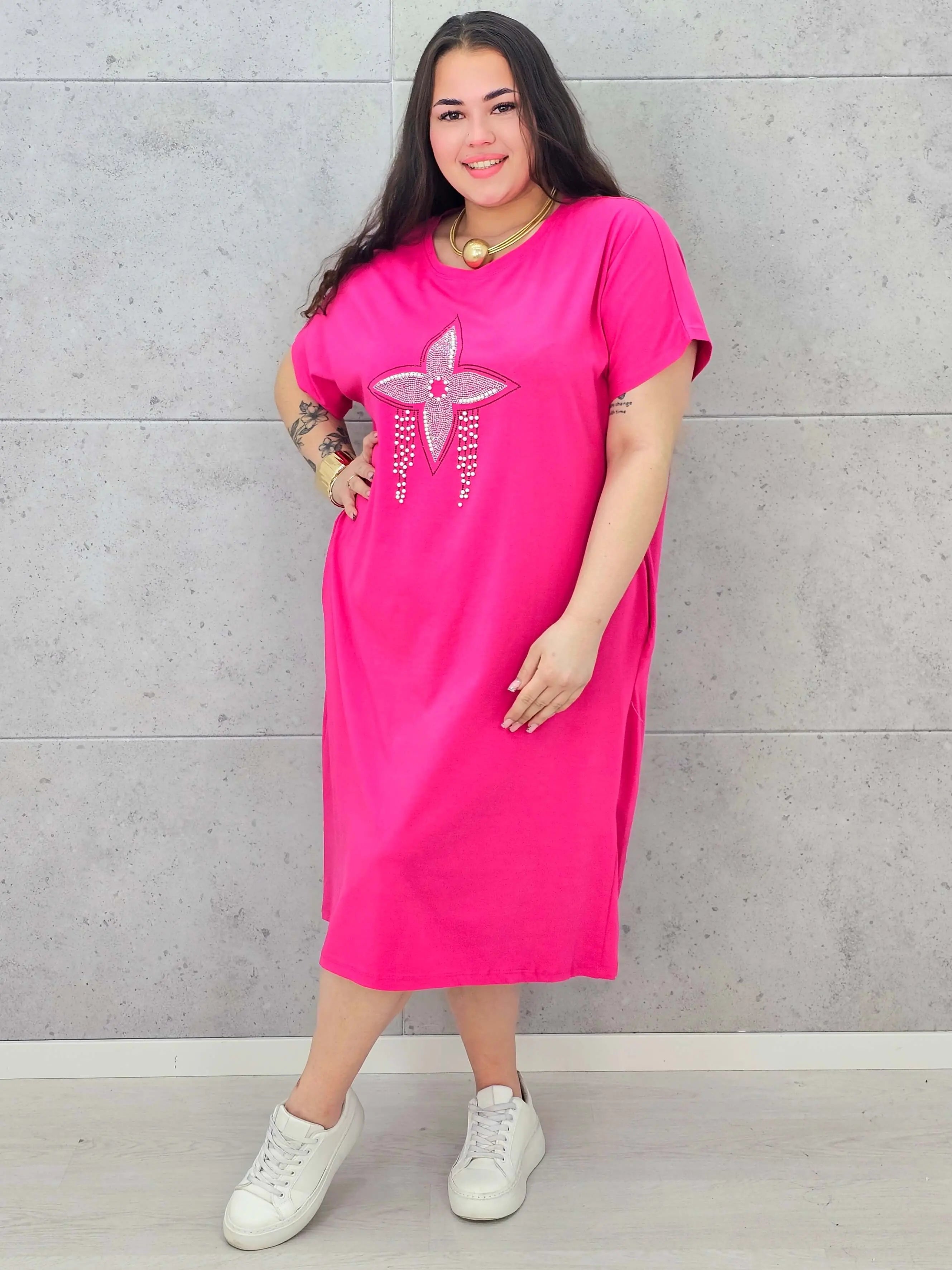 Przód sukienki zdobi duża aplikacja gwiazdy wykonana z cyrkonii, która dodaje całości wyjątkowego blasku i sprawia, że stylizacja prezentuje się świeżo, kobieco i bardzo modnie. Miękki, przyjemny w dotyku materiał idealnie sprawdzi się na co dzień – do pracy, na spacer, zakupy czy letnie spotkania.