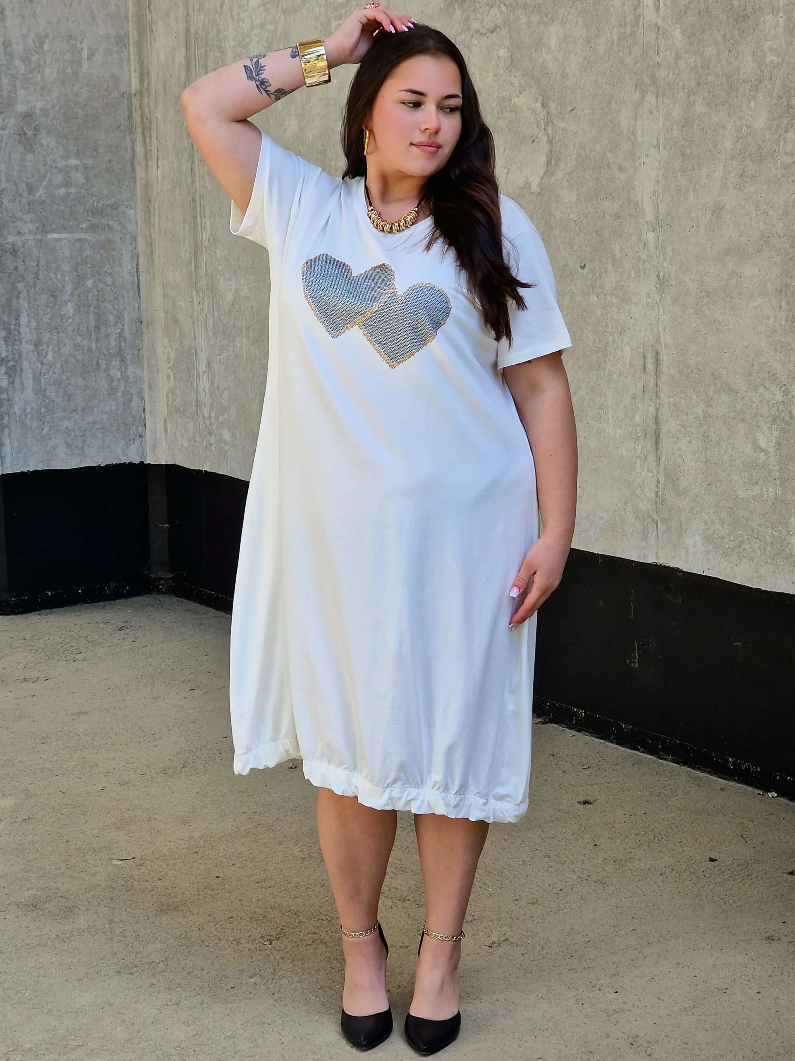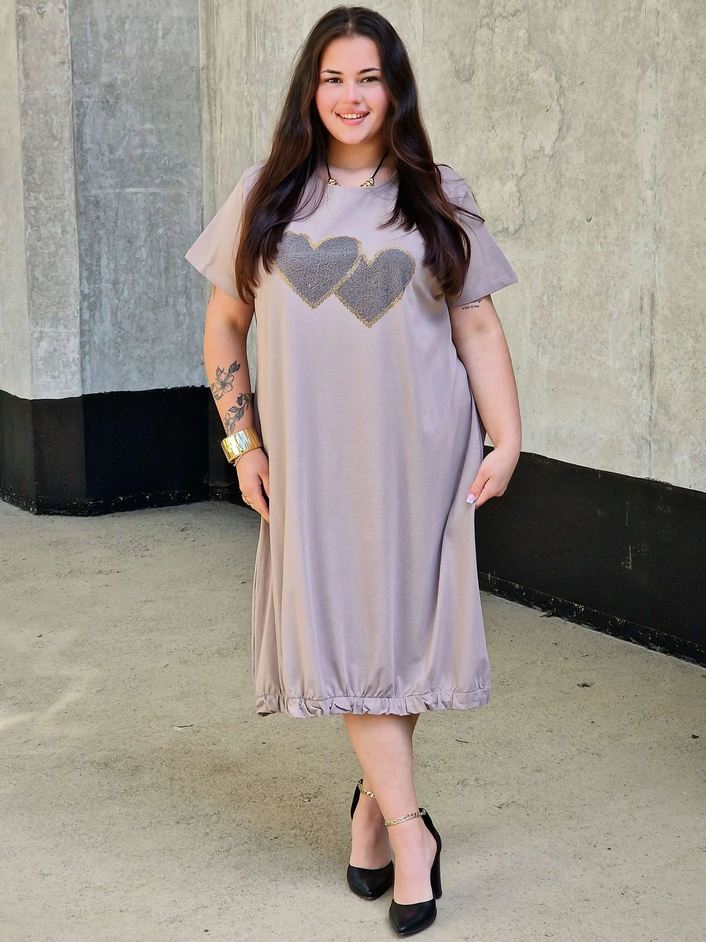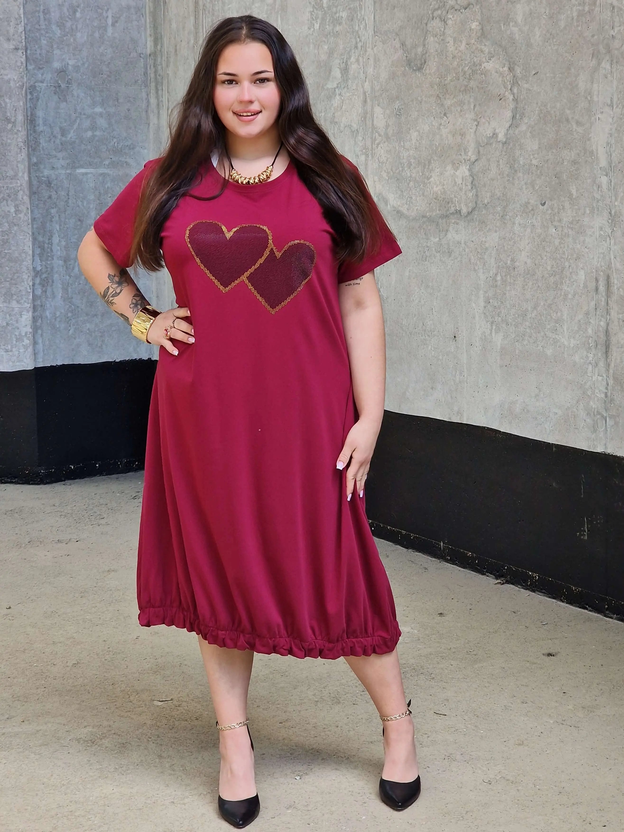 Stylowa, wygodna i pełna uroku – sukienka "Heartbeat" to doskonały wybór dla kobiet, które kochają subtelne, ale efektowne detale. Luźny krój zapewnia maksymalny komfort, a błyszczące serca na przodzie dodają jej wyjątkowego charakteru.