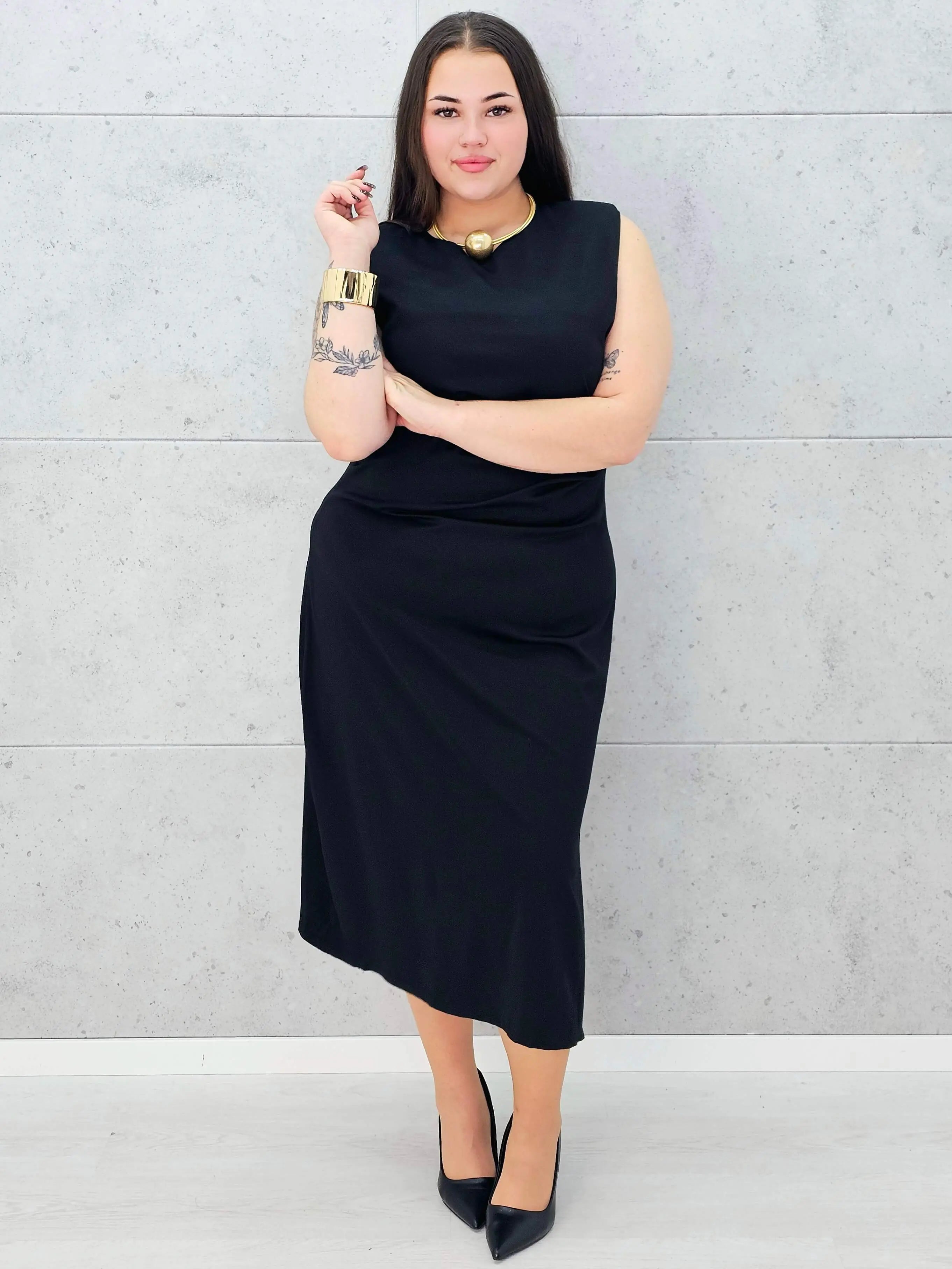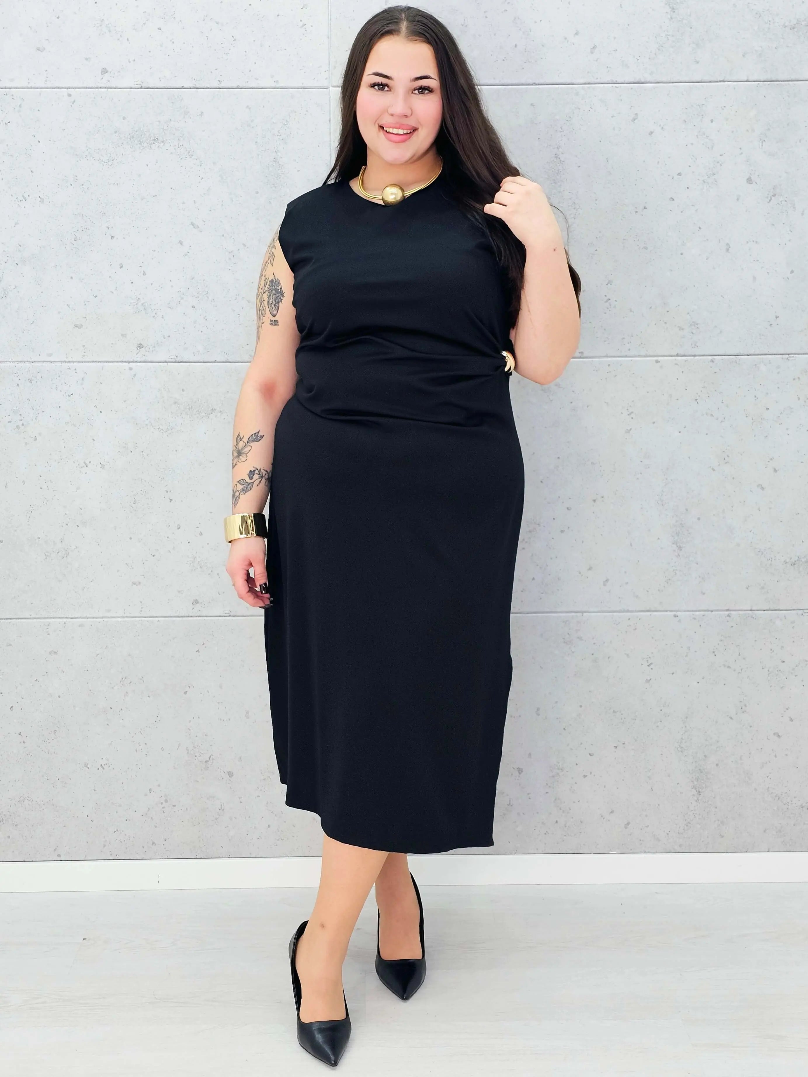 Złota ozdoba w postaci dekoracyjnych kółek przyciąga wzrok i pełni rolę biżuteryjnego akcentu, dzięki czemu nie musisz już dodawać wielu dodatków. Bez rękawów – świetnie sprawdzi się w cieplejsze dni lub jako baza pod żakiet.