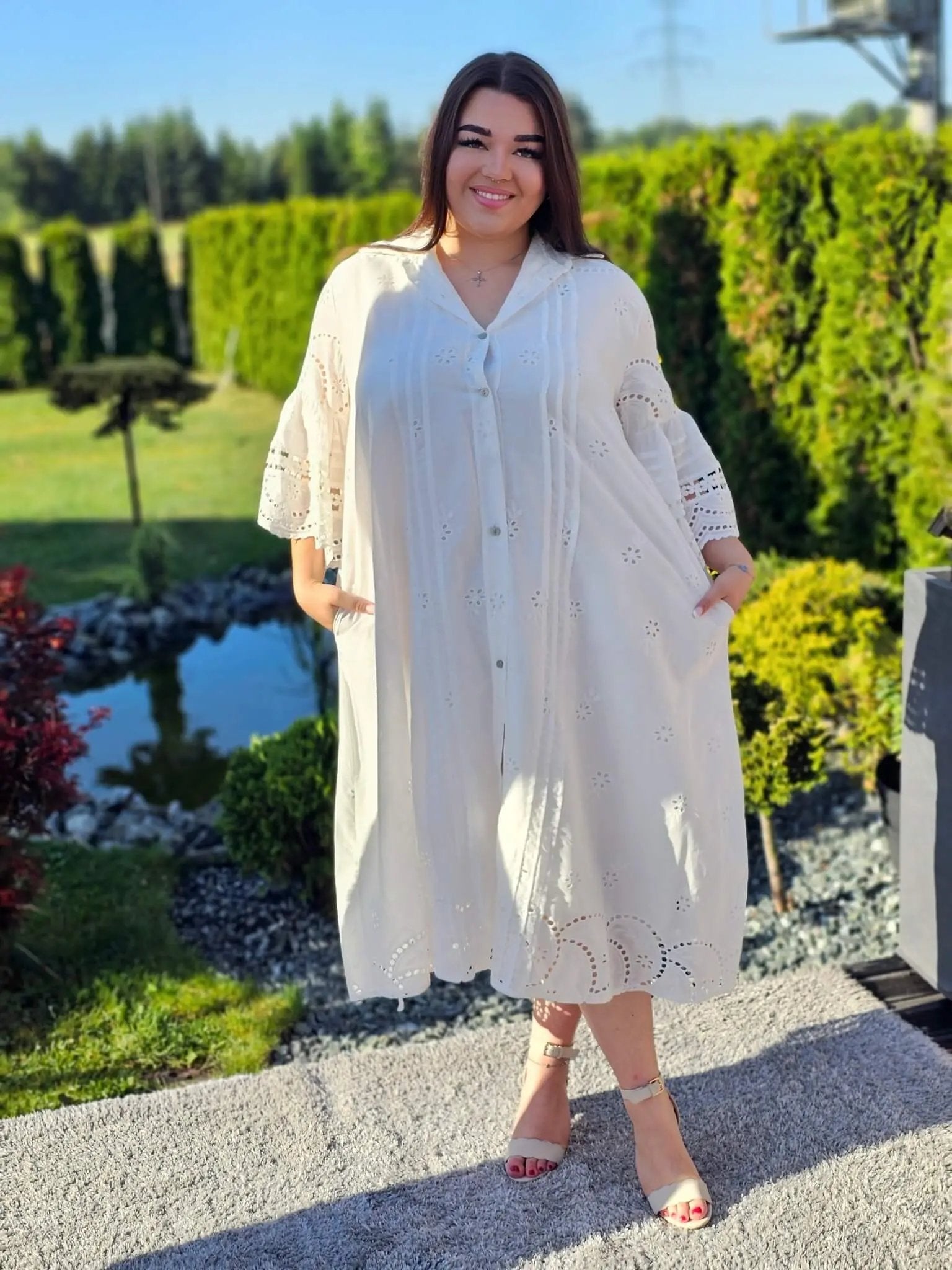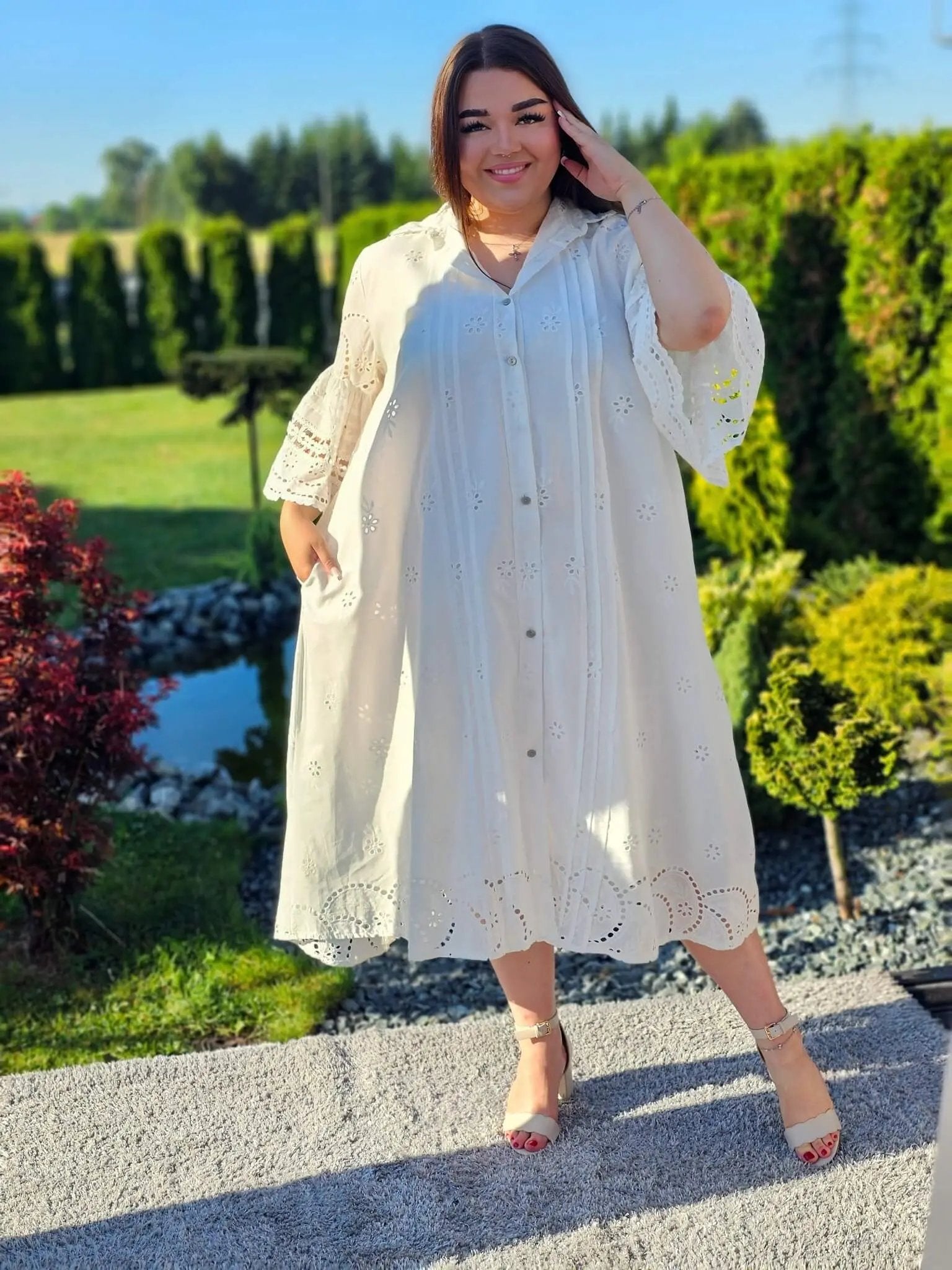 Haft angielski nadaje sukience niezwykłej lekkości i dziewczęcego uroku, podkreślając jej wyjątkowy charakter. Koszulowy fason sukienki plus size gwarantuje pełen komfort noszenia, a jednocześnie prezentuje się elegancko i kobieco. Dzięki naturalnej bawełnie materiał jest przewiewny i delikatny dla skóry, co czyni tę sukienkę dla kobiet plus size idealnym wyborem na ciepłe dni.