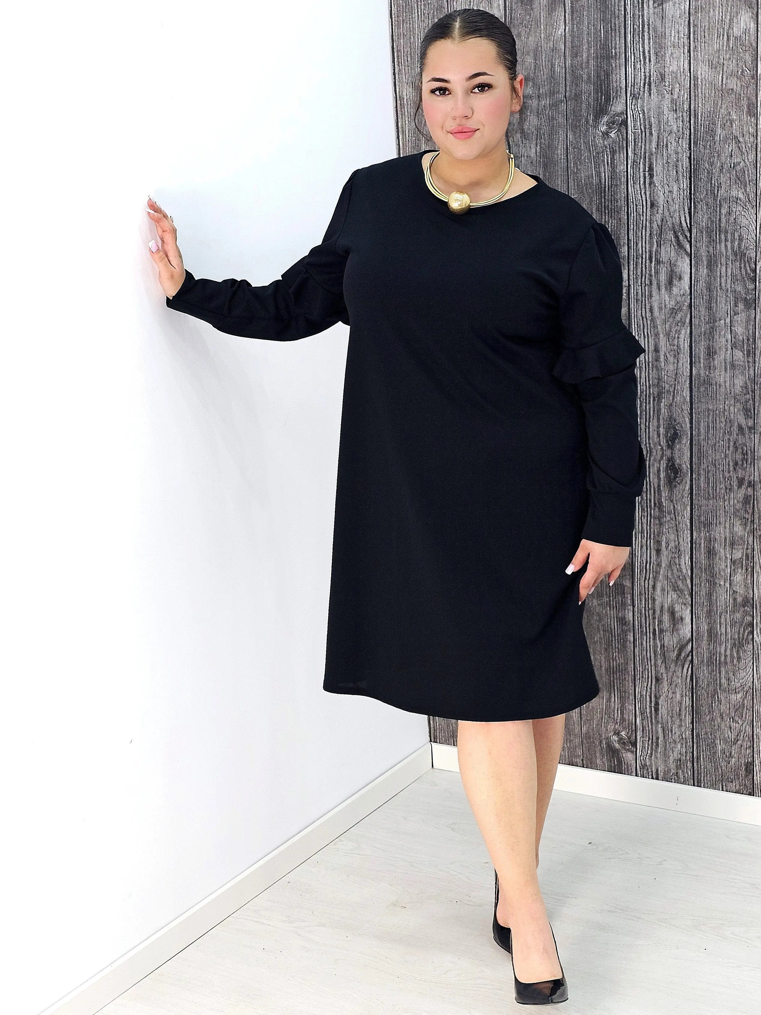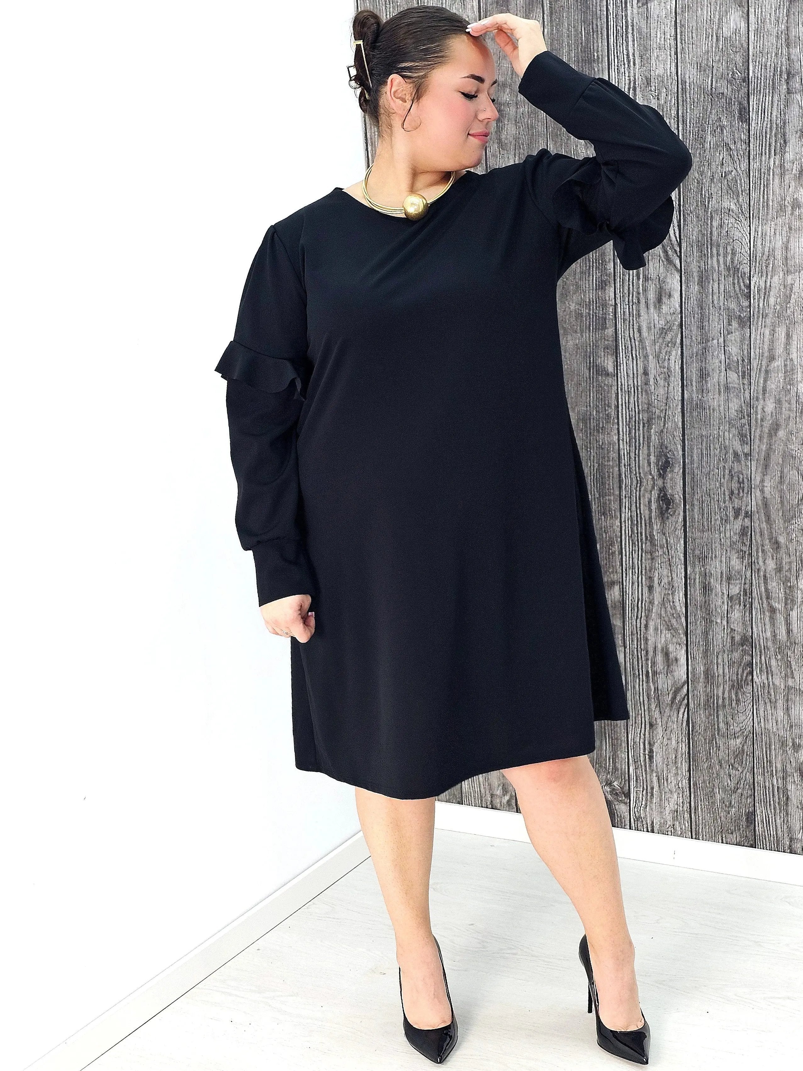 Elegancka sukienka o klasycznym kroju z wyjątkowym detalem w postaci ozdobnego łańcuszka na plecach. Model wyróżnia się subtelną falbaną na rękawach, która dodaje całości lekkości i kobiecego wdzięku. Sukienka sprawdzi się idealnie na wieczorne wyjścia, kolacje czy spotkania towarzyskie. Ozdobny łańcuszek nadaje jej wyjątkowego charakteru, sprawiając, że całość prezentuje się stylowo i z klasą. Prosty krój zapewnia wygodę, a detale sprawiają, że sukienka nie potrzebuje dodatkowych ozdób.