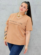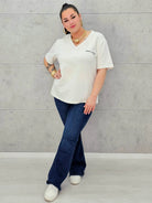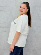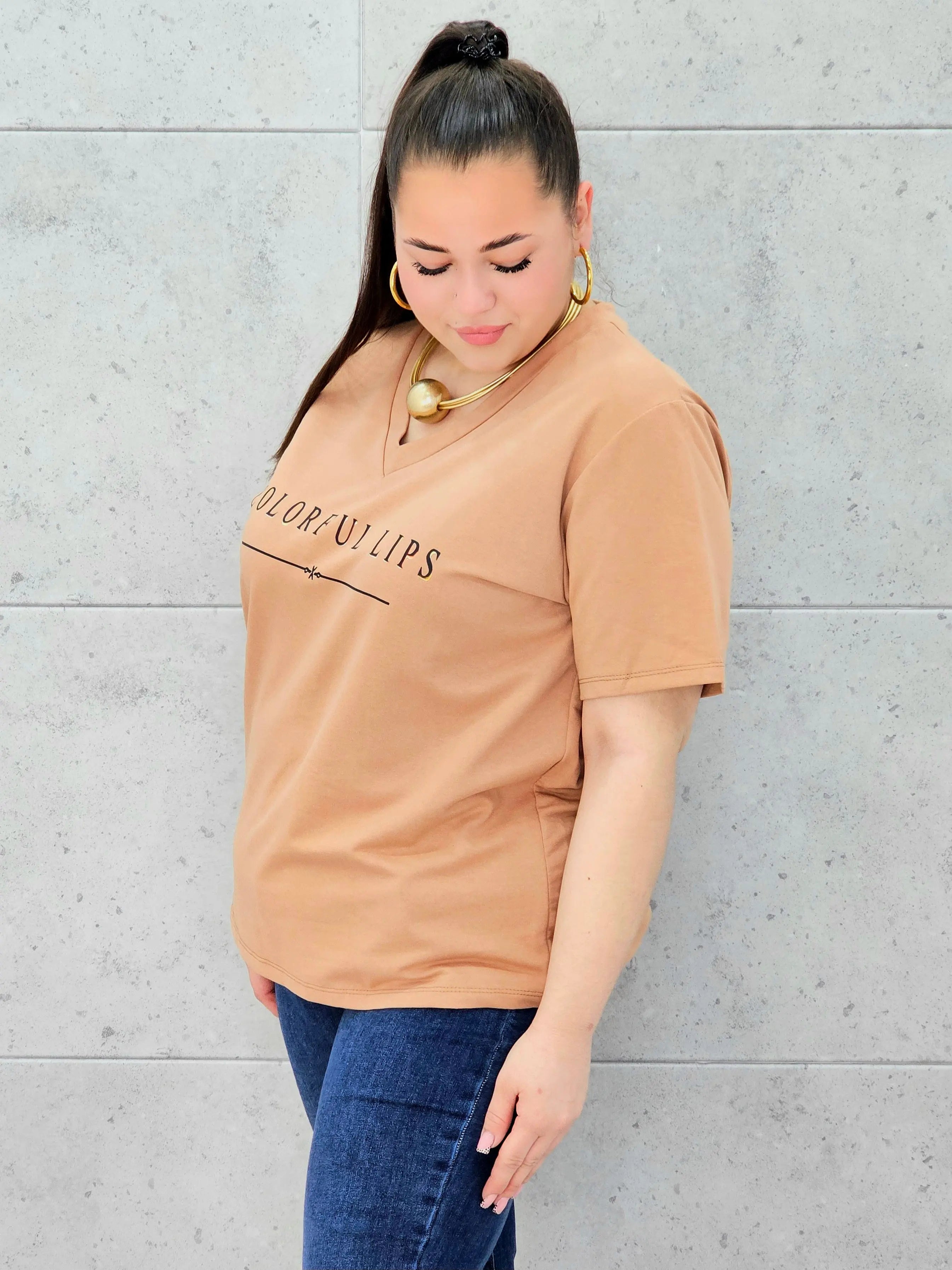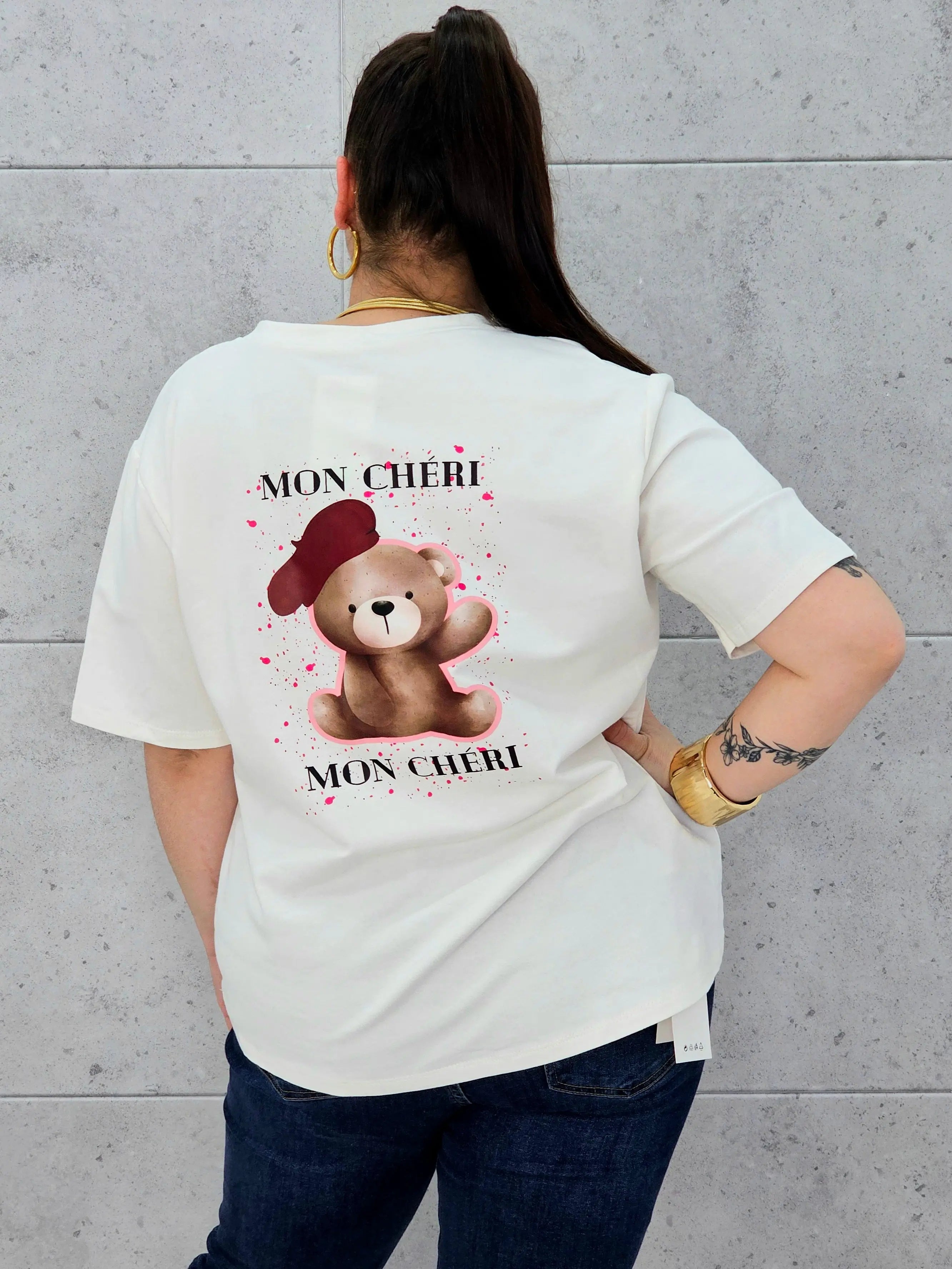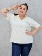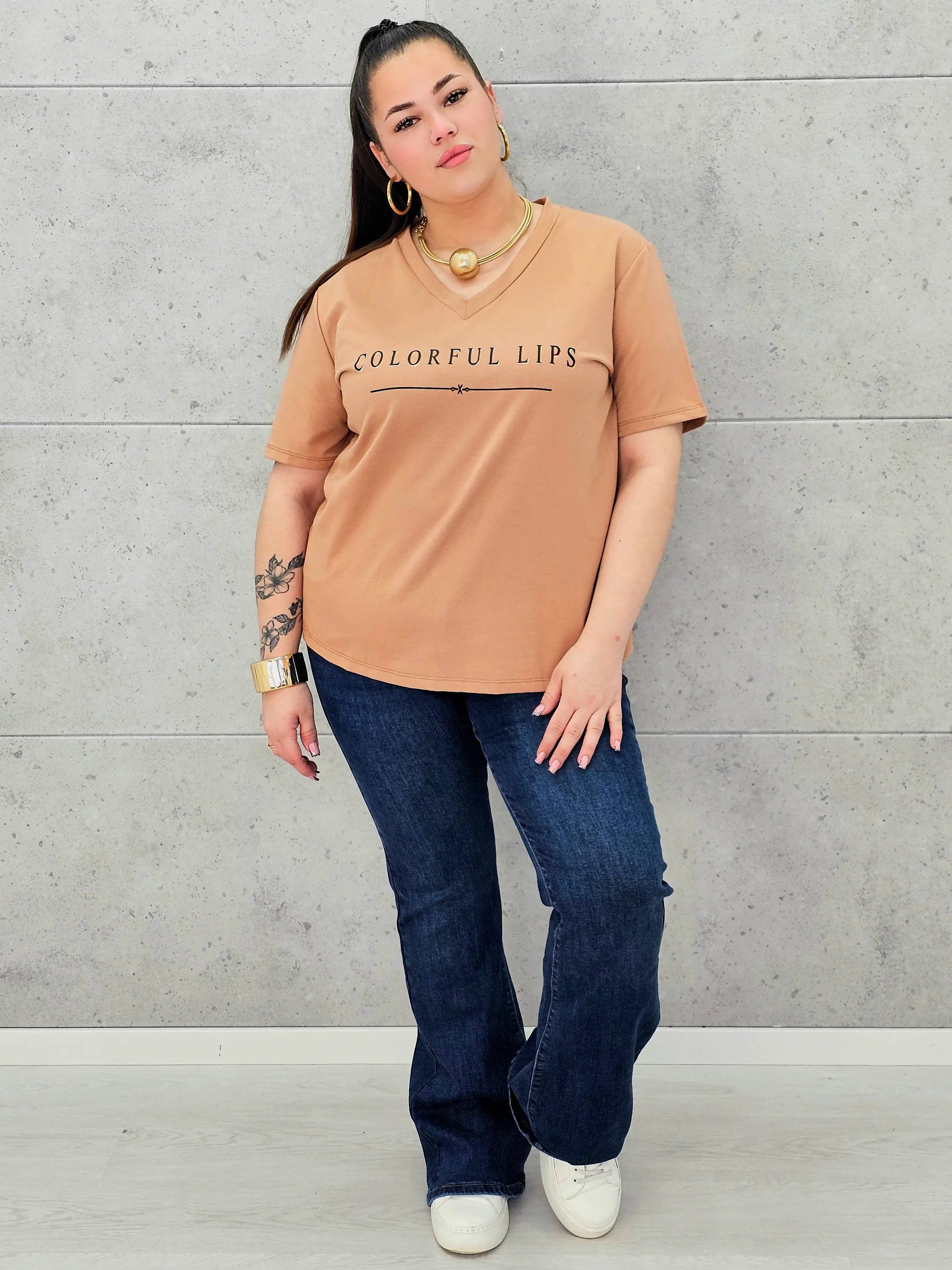 Beżowy t-shirt COLORFUL LIPS zachwyca minimalistycznym nadrukiem, który nadaje mu lekkości i subtelnego charakteru. Kremowy model MON CHÉRI natomiast przyciąga uwagę uroczym nadrukiem misia na plecach – to propozycja dla kobiet, które lubią modę z nutą słodkiego uroku. Oba warianty mają klasyczny krój z dekoltem w kształcie litery V, co optycznie wysmukla szyję i podkreśla kobiece rysy twarzy. To idealny wybór do codziennych stylizacji, zarówno z jeansami, jak i legginsami, wpisujący się w współczesne trendy mody plus size.