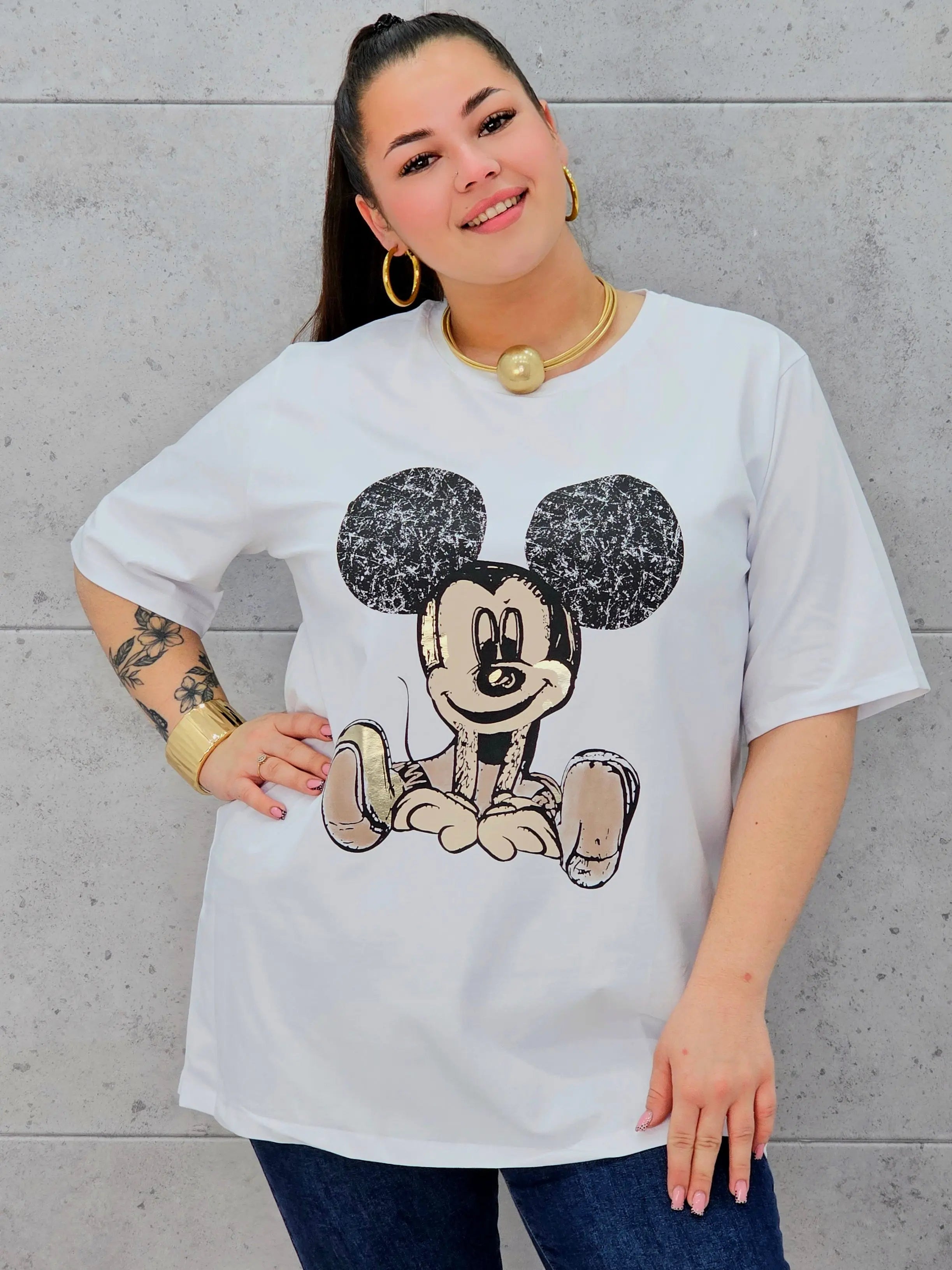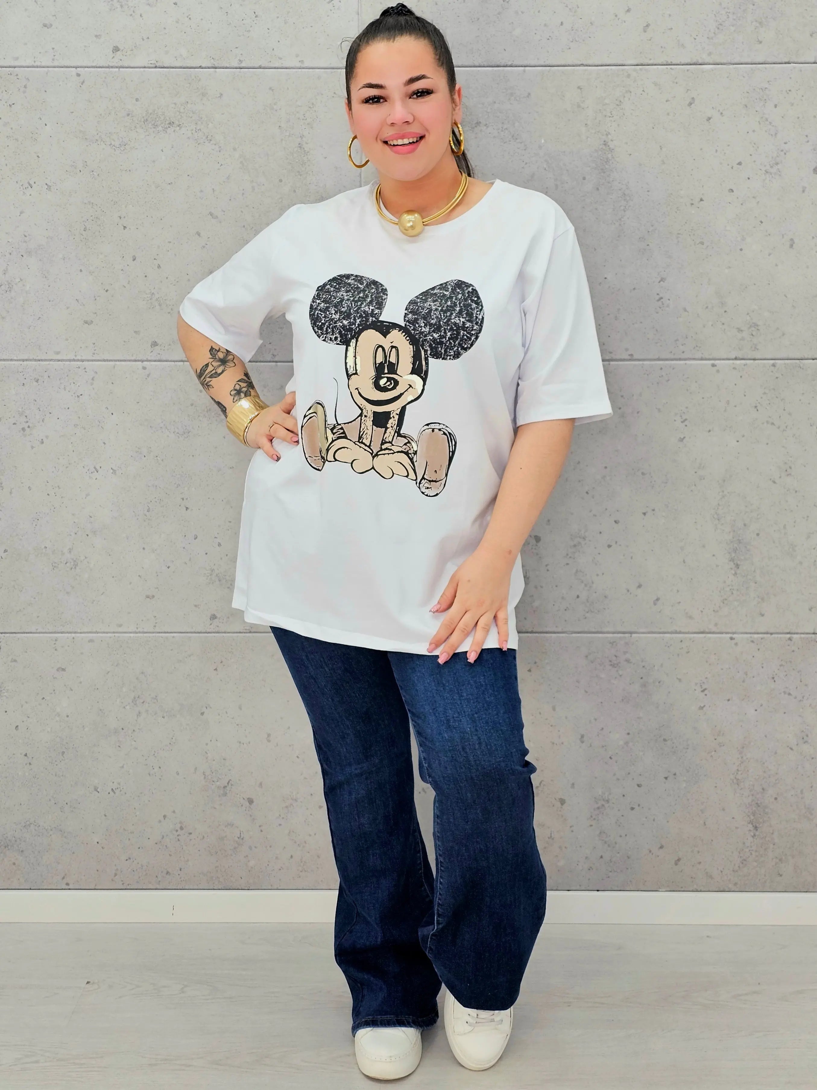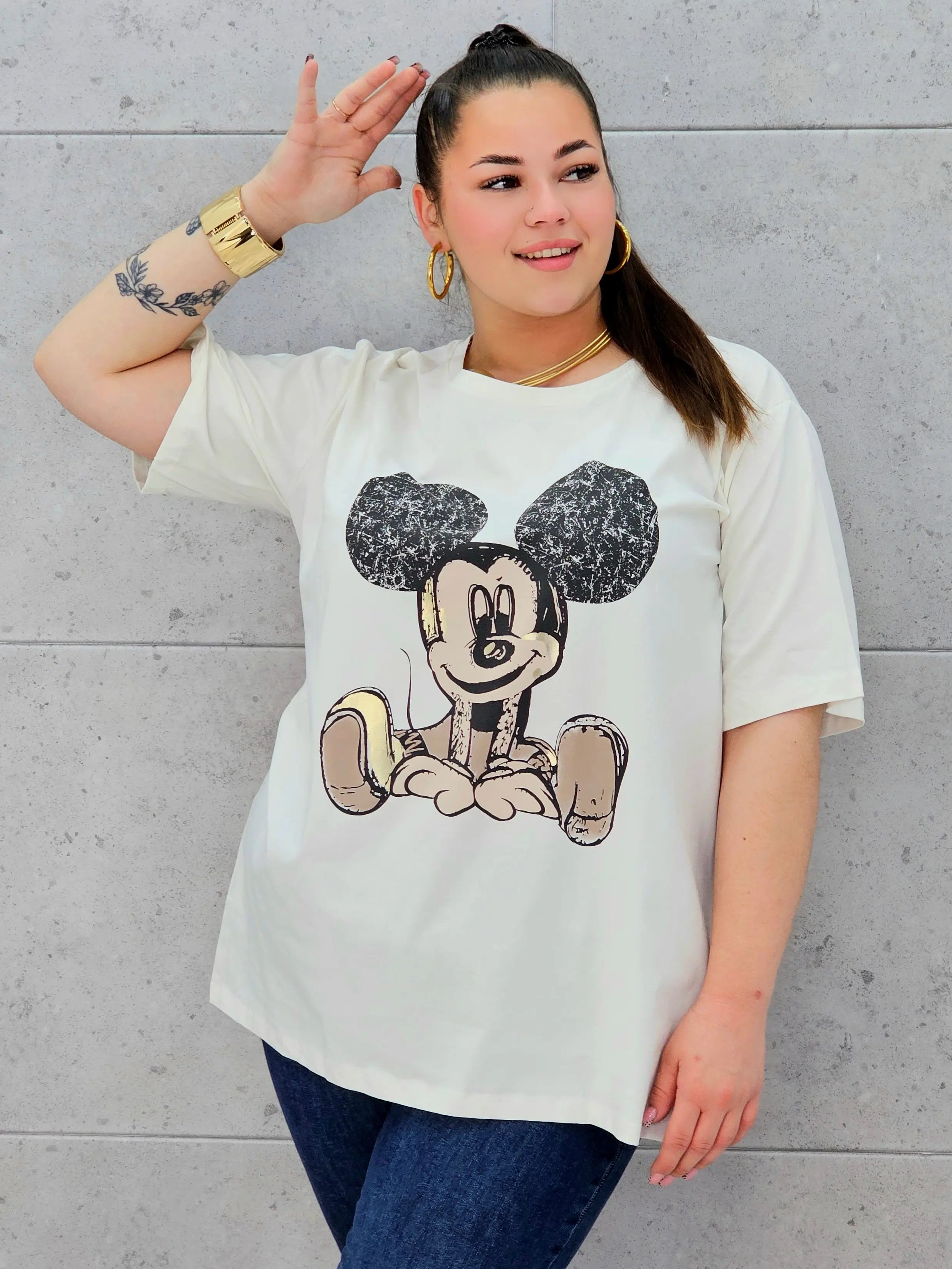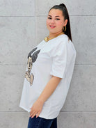 Luźny, oversize’owy krój pięknie układa się na sylwetce, nie opinając i nie podkreślając partii, które chcemy zamaskować. Uroczy nadruk w stylu retro nadaje bluzce wyjątkowego charakteru, a zaokrąglony dekolt i klasyczna długość sprawiają, że t-shirt doskonale sprawdzi się zarówno w codziennych stylizacjach z jeansami, jak i w bardziej luźnych zestawach z legginsami. To model, który idealnie wpisuje się w aktualne trendy mody plus size, łącząc lekkość, wygodę i modną grafikę.