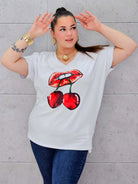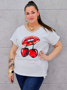 T-shirt plus size to idealna propozycja dla kobiet, które lubią podkreślać swój charakter i bawić się modą. Soczysty nadruk czerwonych ust i wisienek dodaje stylizacji zmysłowości i humoru, przyciągając spojrzenia i wprowadzając świeżą energię do codziennych outfitów. Luźny, komfortowy fason pięknie układa się na sylwetce XXL, oferując wygodę i pełną swobodę ruchów. To modny, lekki akcent, który doskonale wpisuje się w modę plus size.