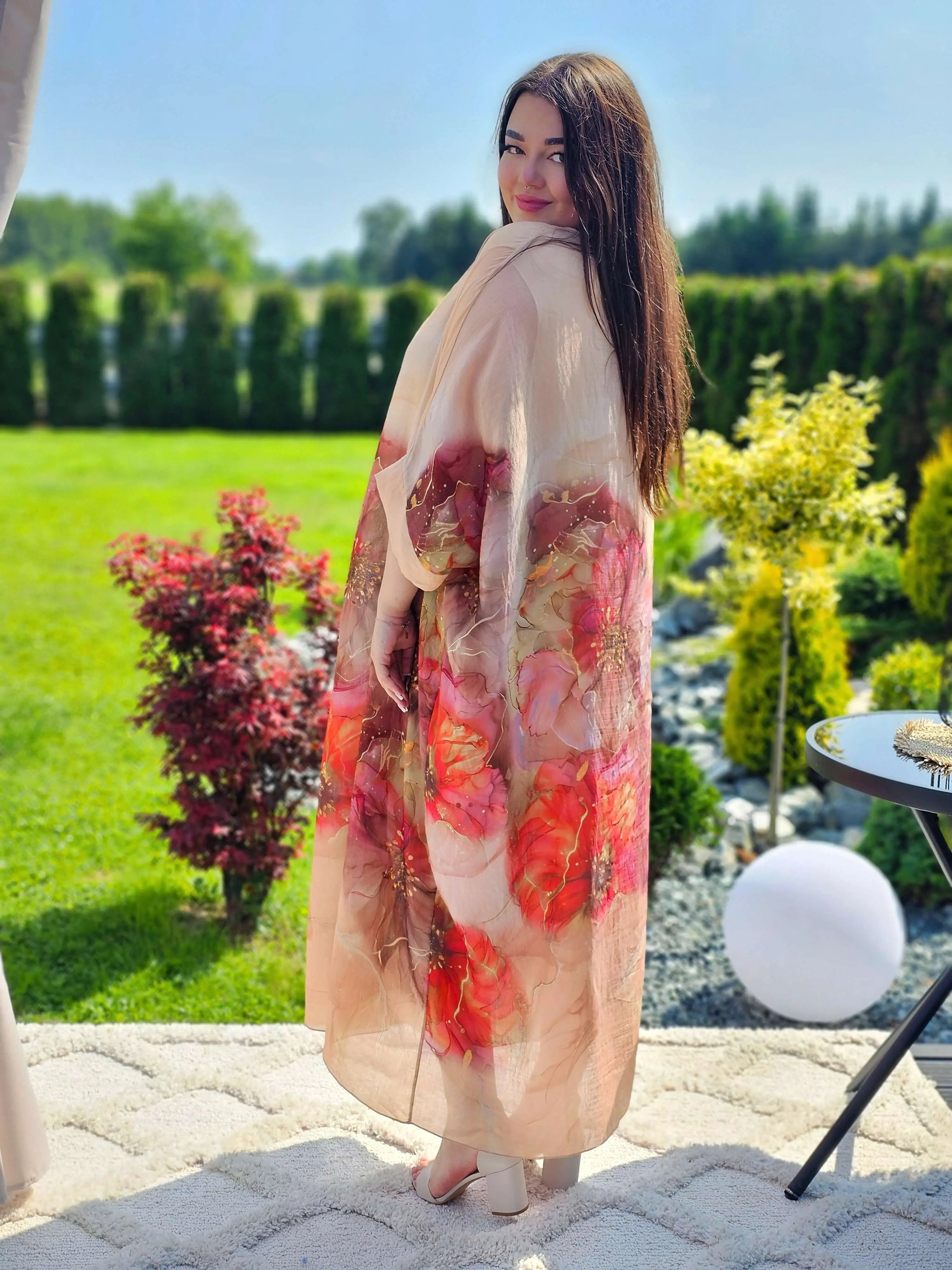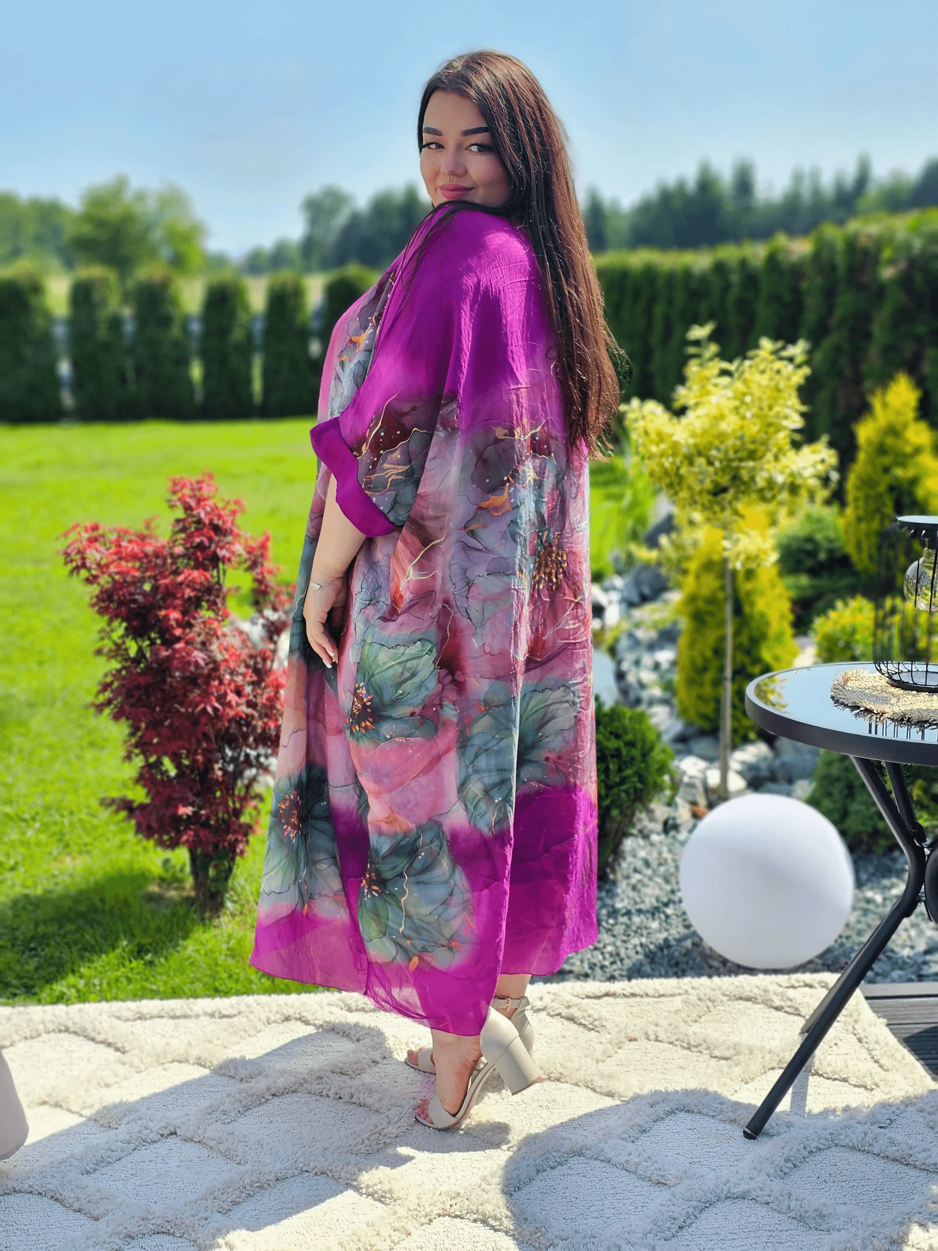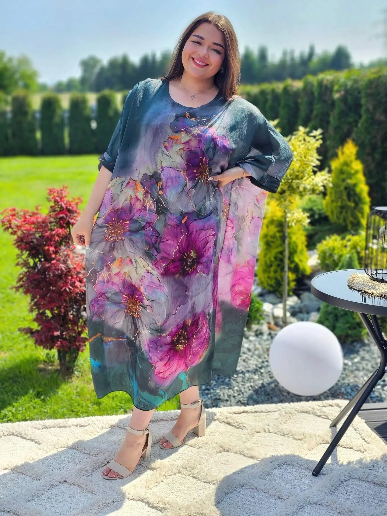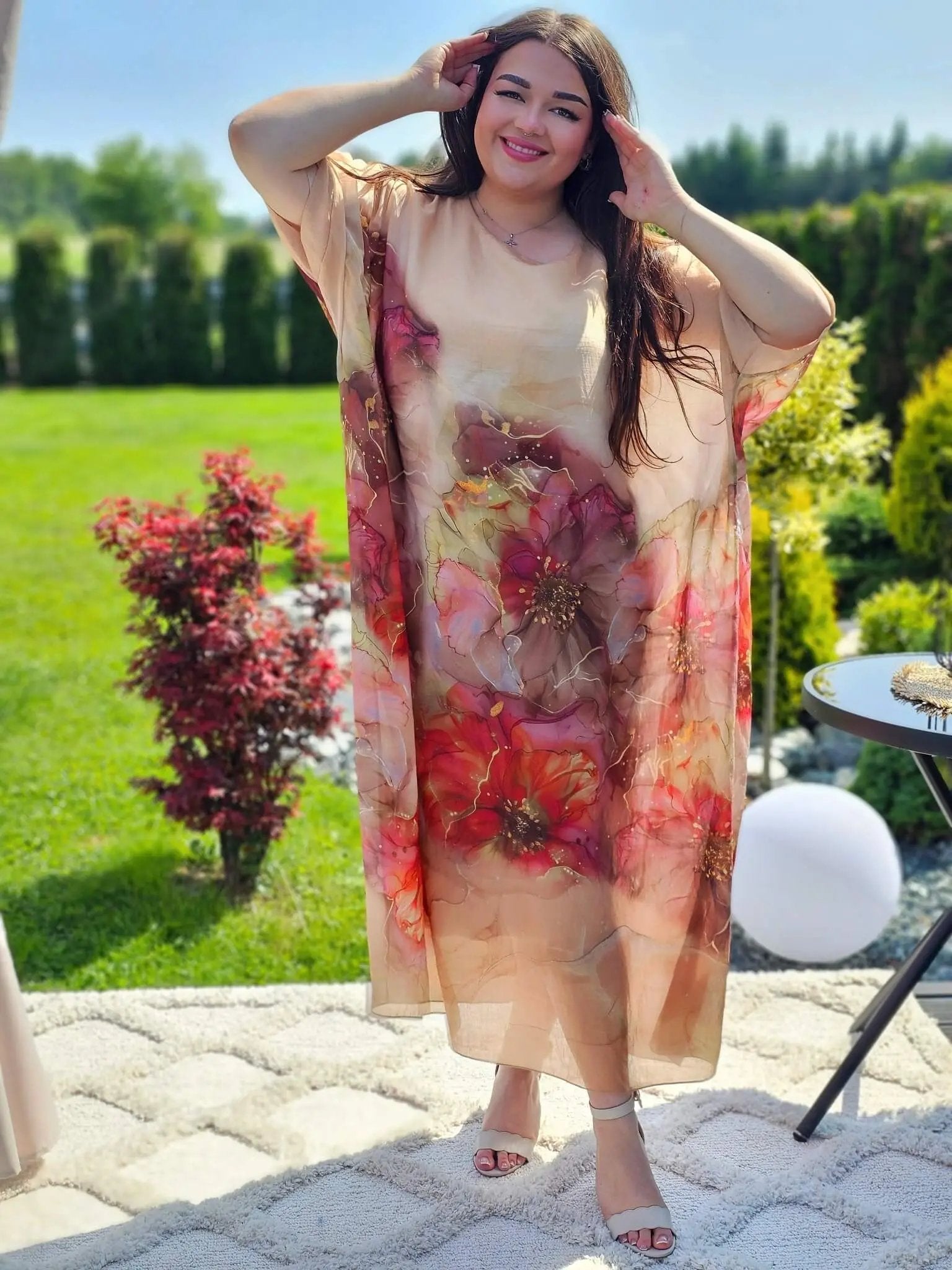 To propozycja, która łączy wygodę oversize’u z niepowtarzalnym, artystycznym stylem. Malarskie kwiaty na tle głębokich kolorów przyciągają wzrok, a luźny fason z delikatnym dekoltem sprawdzi się doskonale w ciepłe dni – czy to na plażę, spacer czy rodzinne spotkanie